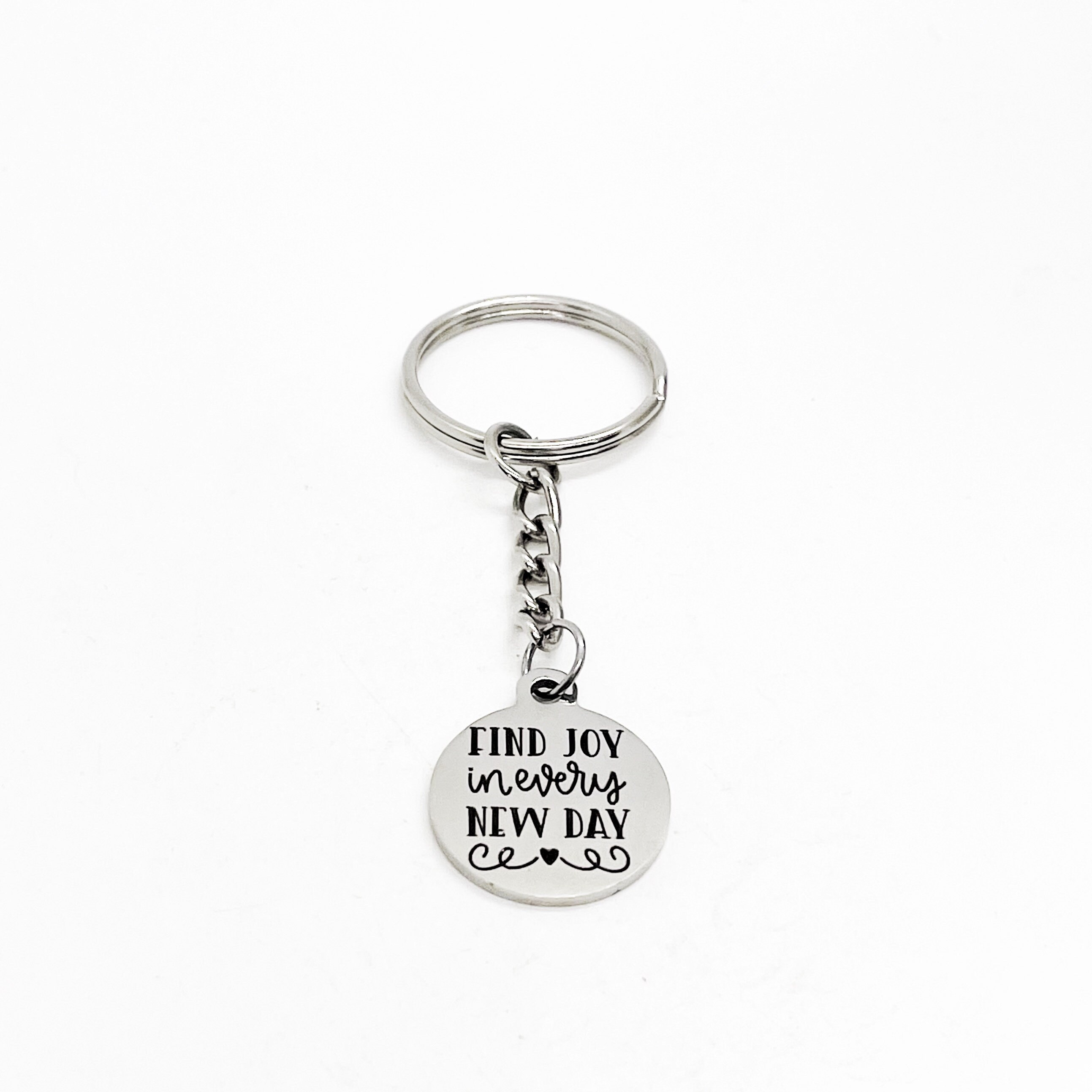 This keychain has a stainless steel laser engraved charm with “Find joy in every new day” on it. The charm measures approx. 3/4 inch.