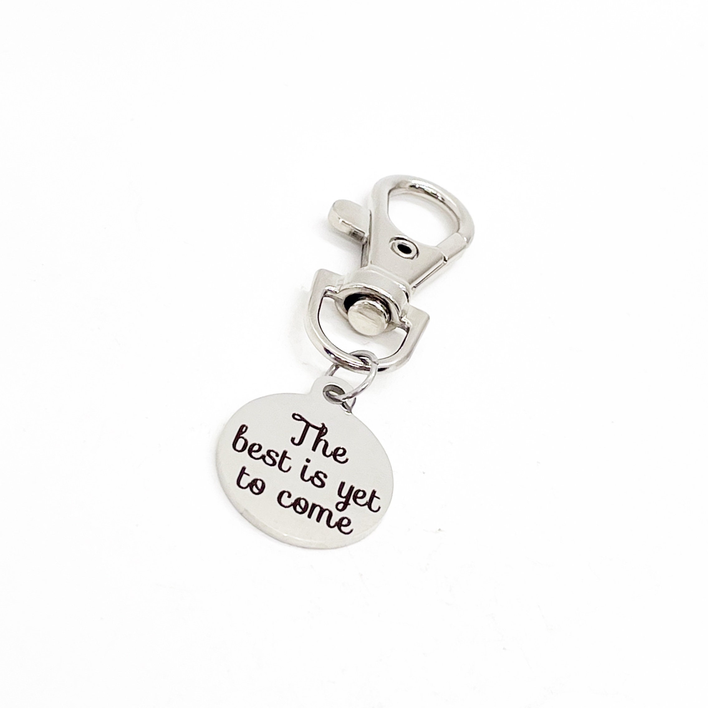 This is a great zipper pull or bag charm gift that has “The best is yet to come” on it.