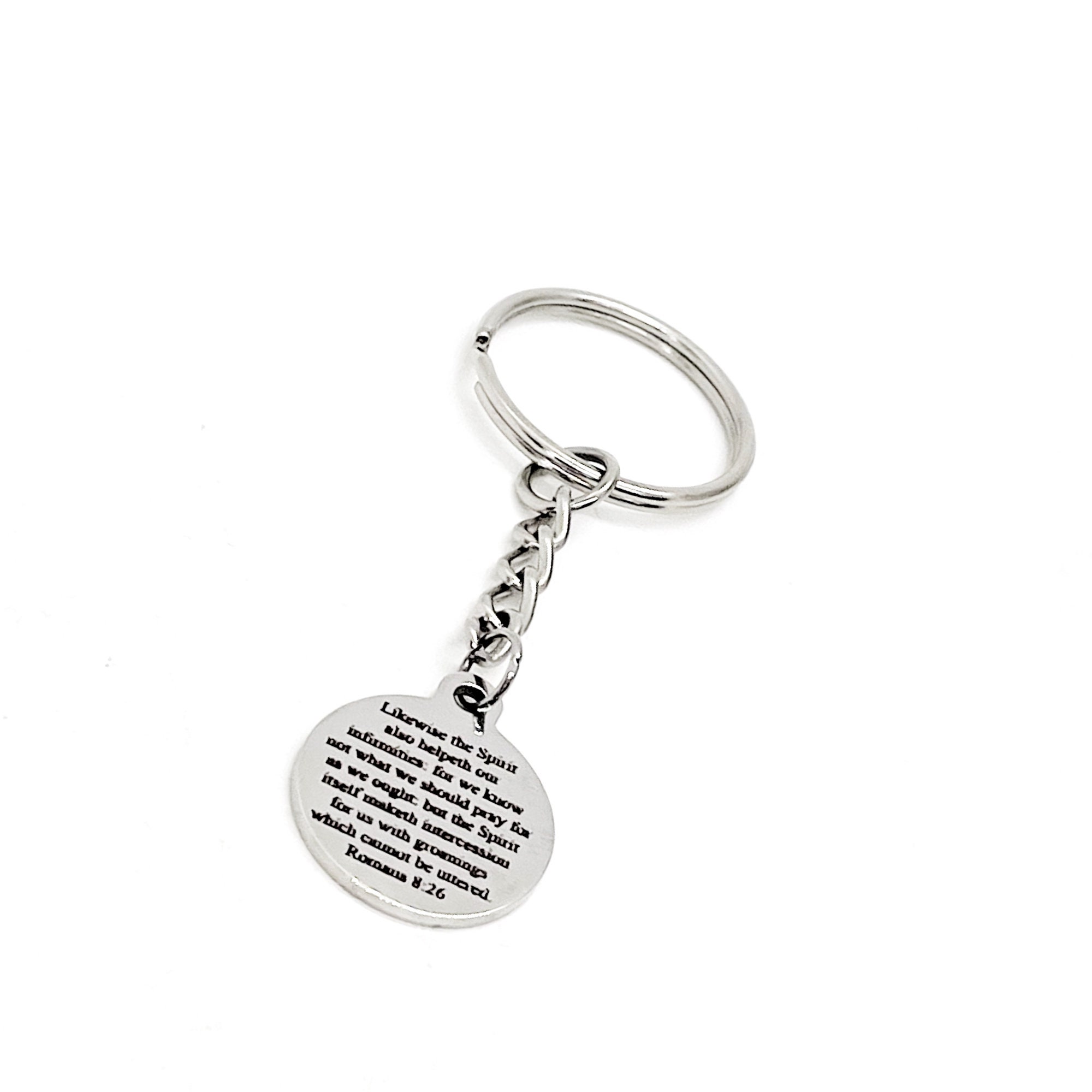 This keychain has a stainless steel laser engraved charm with “Likewise the Spirit also helpeth our infirmities: for we know not what we should pray for as we ought: but the Spirit itself maketh intercession for us with groaning which cannot be uttered” from Romans 8:26 on it. The charm measures approx. 3/4 inch.