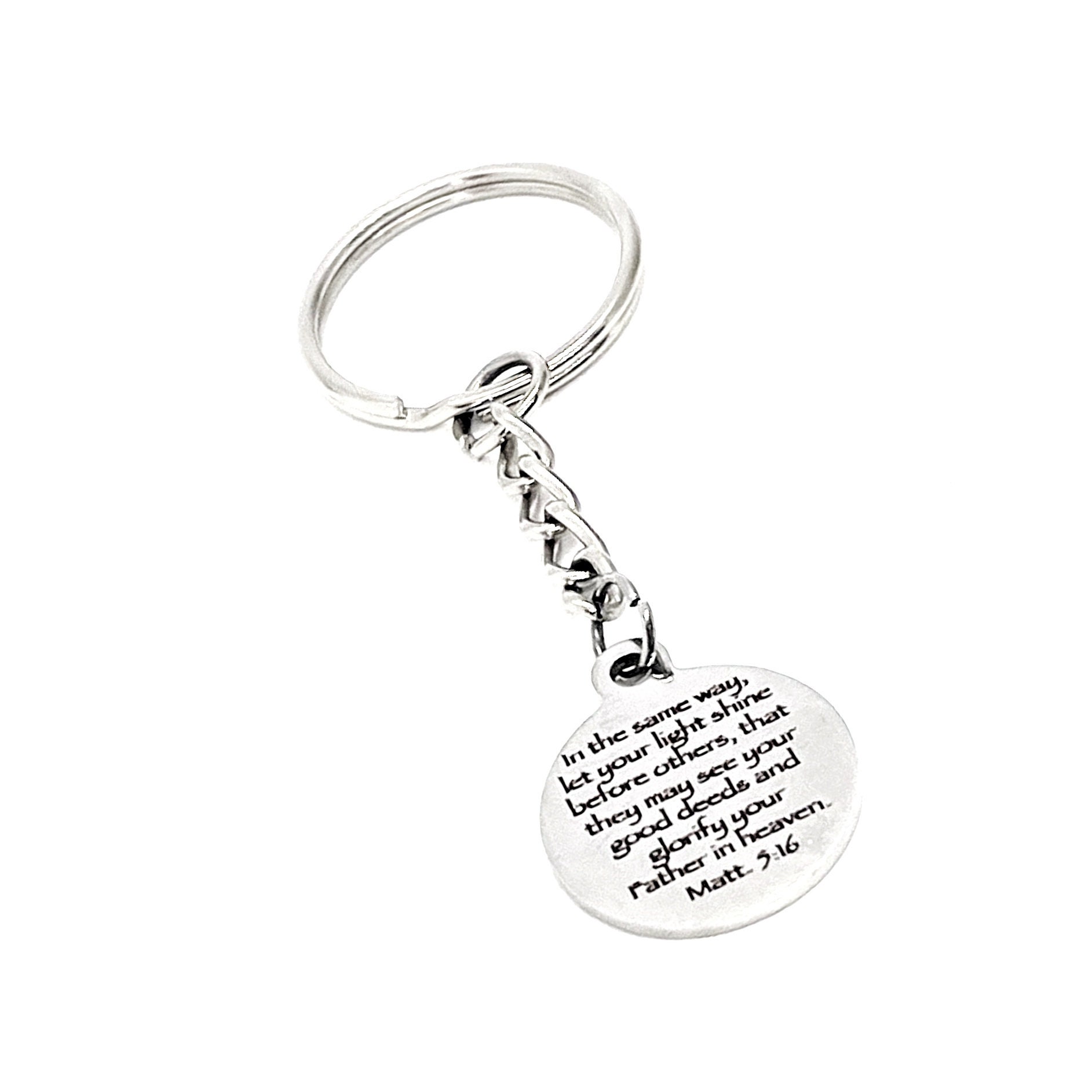 This keychain has a stainless steel laser engraved charm with “In the same way, let your light shine before others, that they may see your good deeds and glorify your Father in Heaven” from Matthew 5:16 on it. The charm measures approx. 3/4 inch.