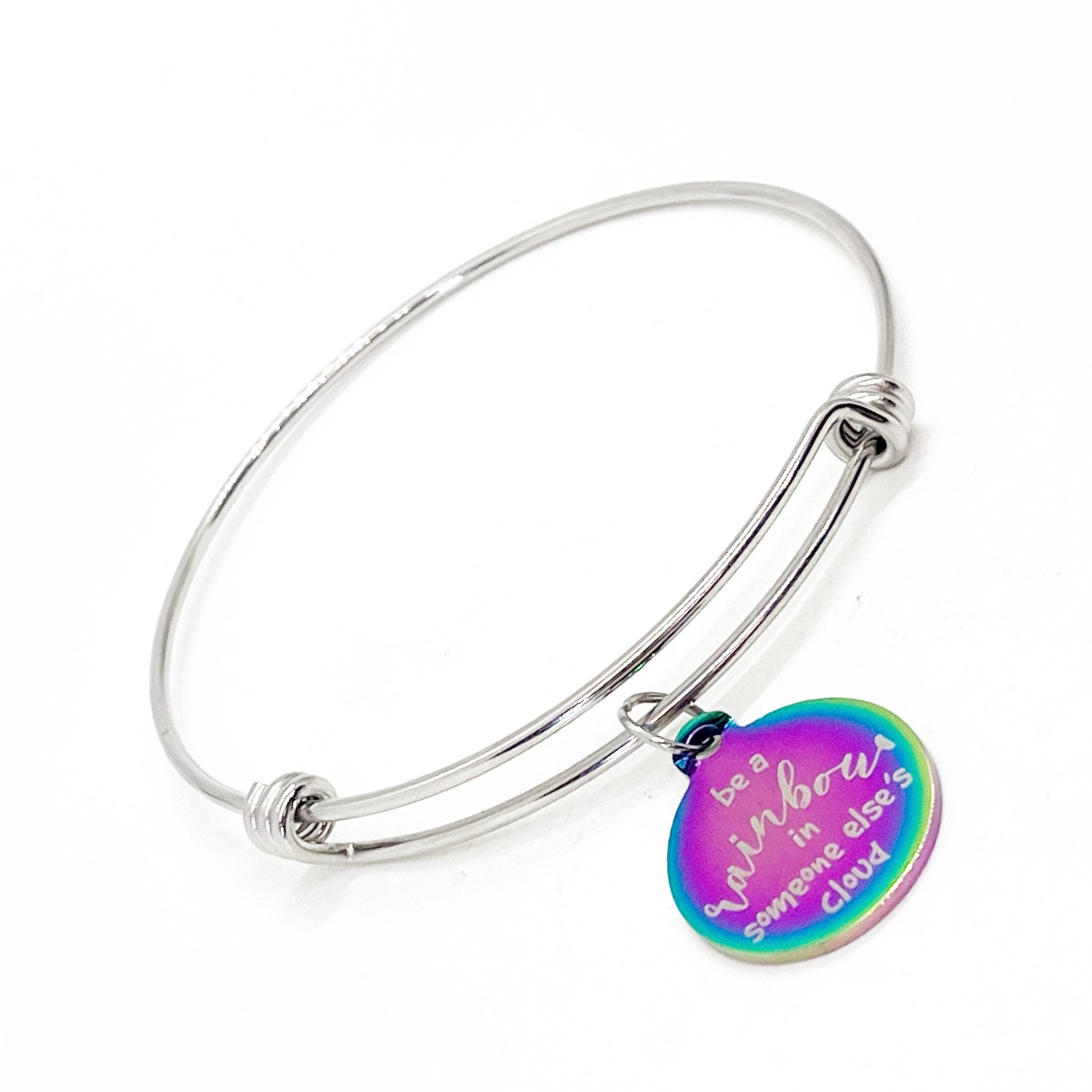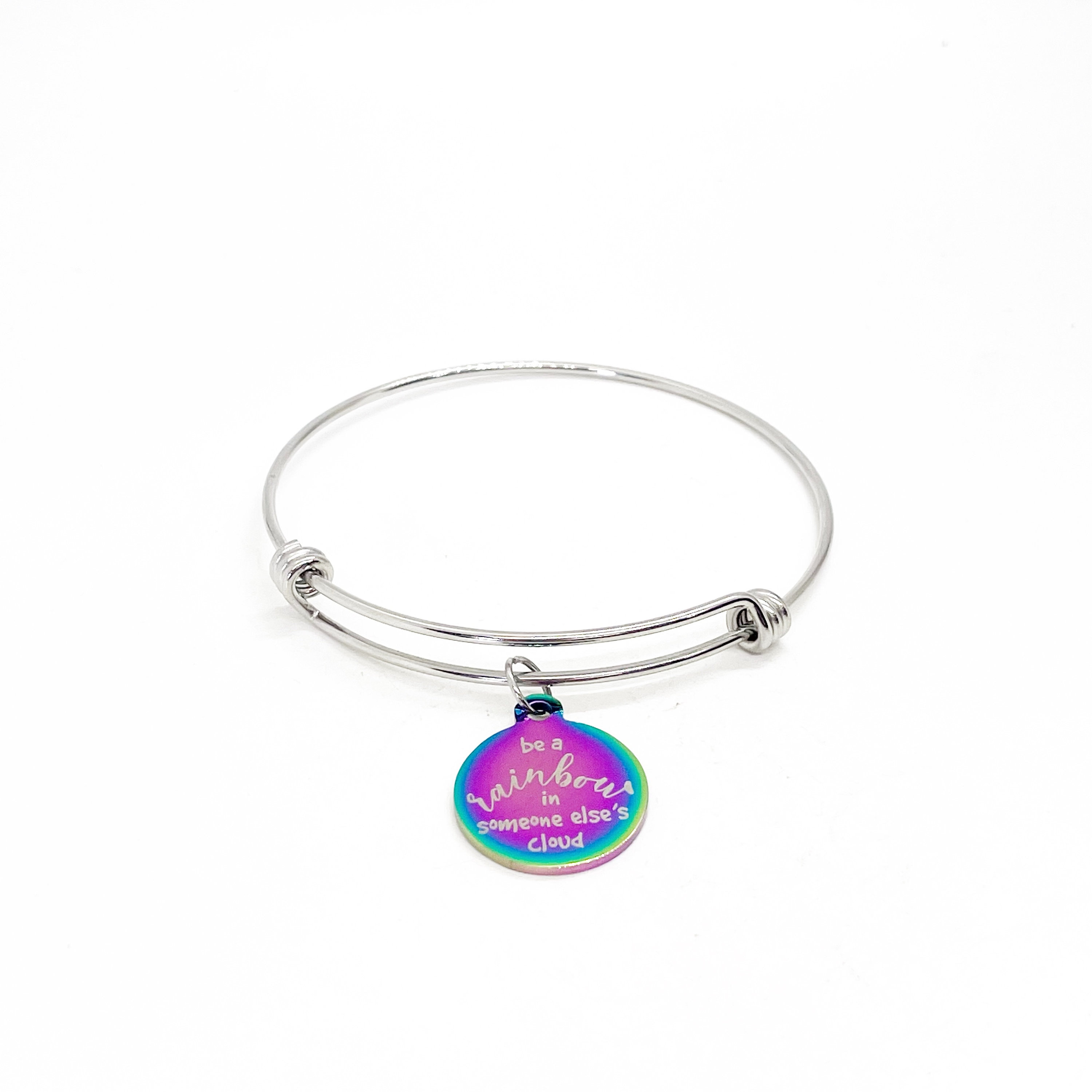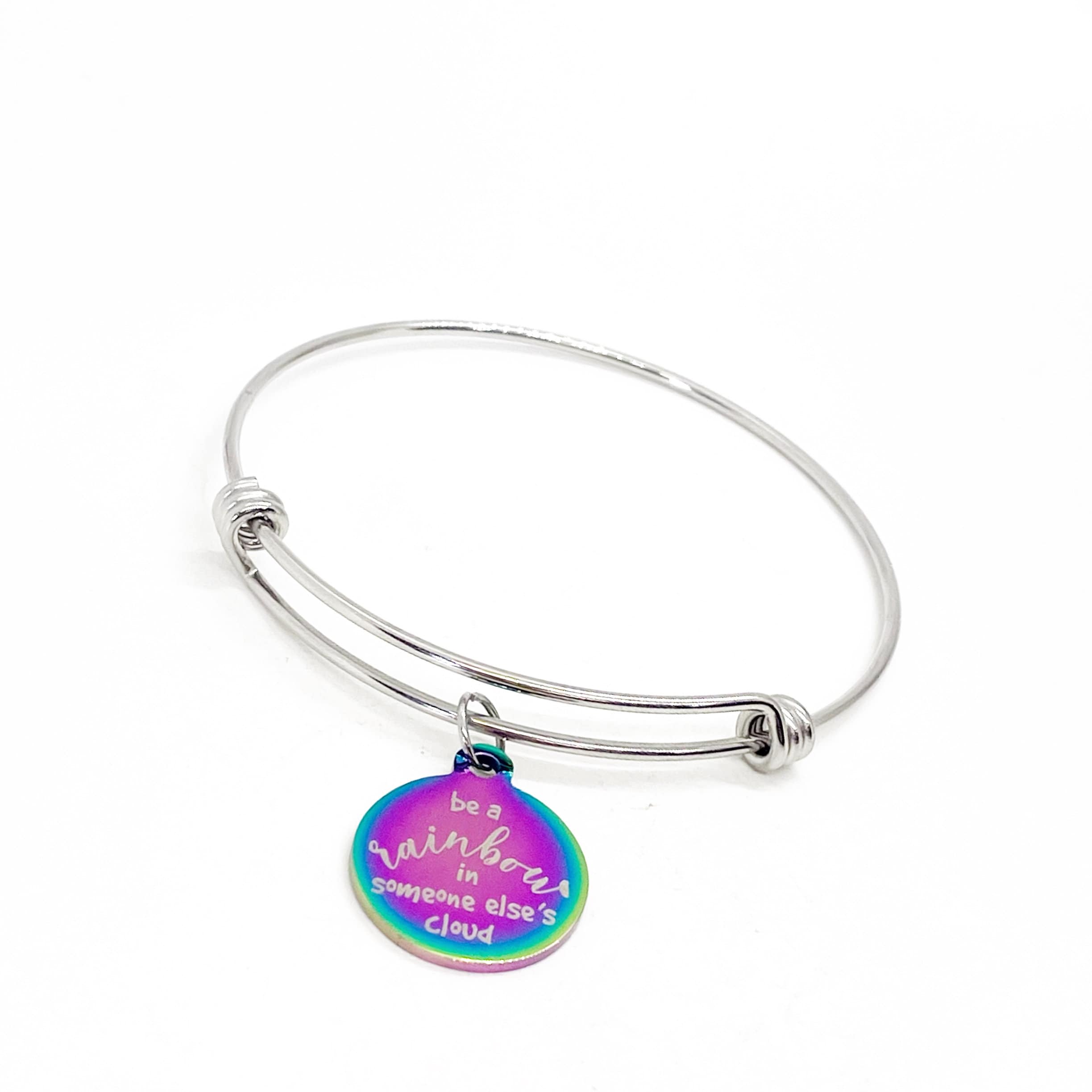 This is a beautiful bangle bracelet with a laser engraved stainless steel charm that has “Be a rainbow in someone else’s cloud” on it.