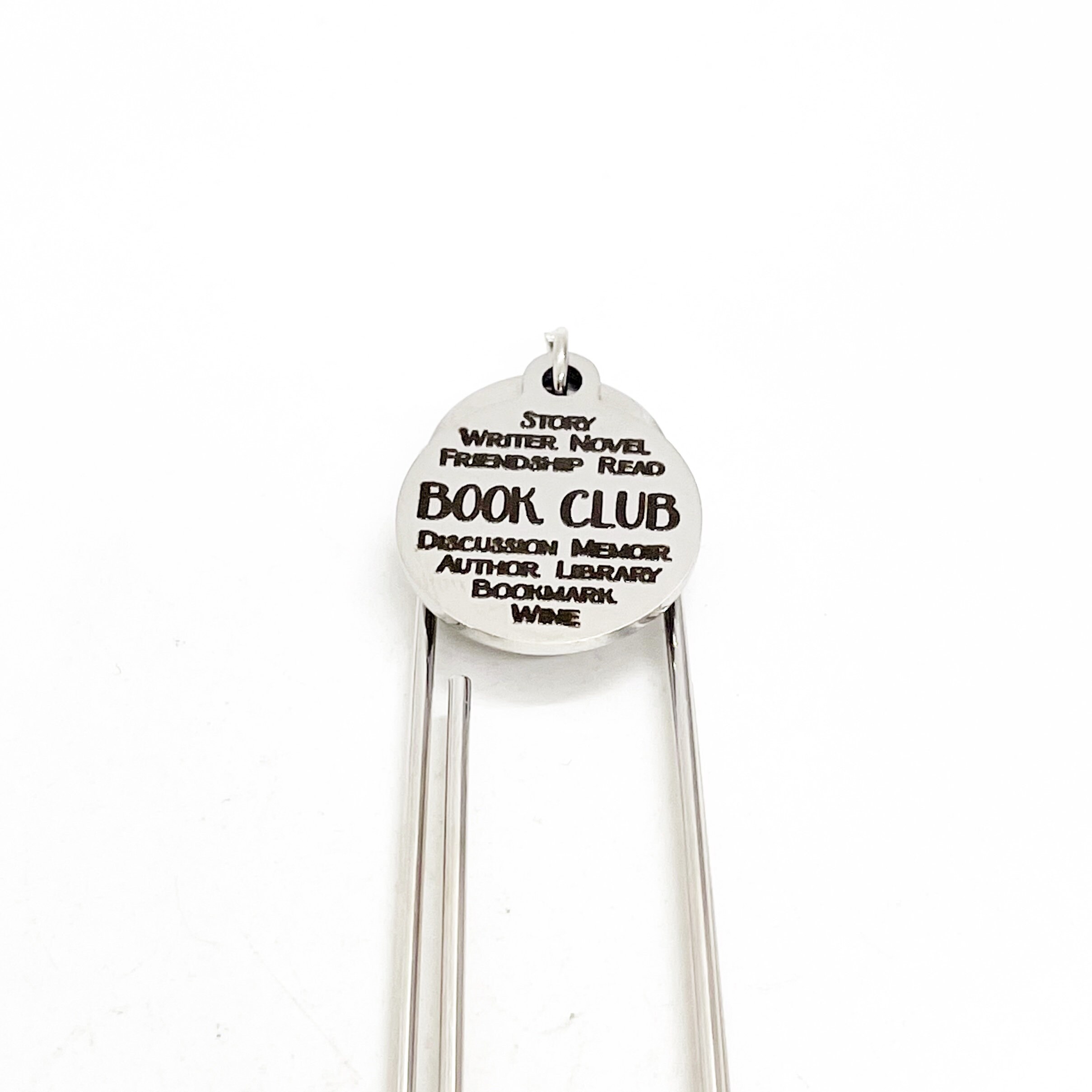 This is a great large paper clip style bookmark that has a stainless steel laser engraved charm with Book Club and related words on it. It can be used as a bookmark, page marker, or planner book mark.
