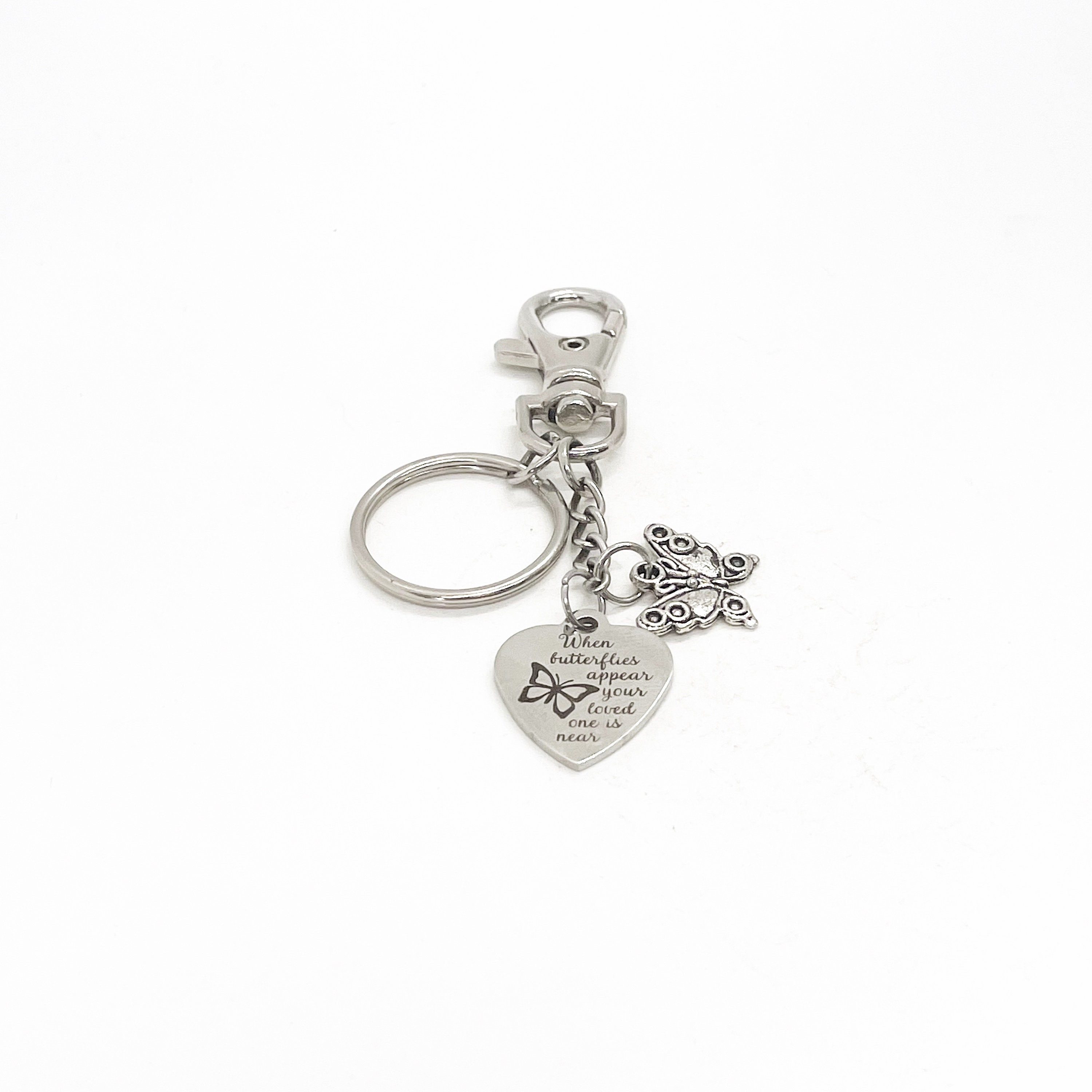 This is a clip-on keychain gift . The keyring can be clipped onto your bag to make it easy to access without digging to the bottom of the bag. It has a stainless steel laser engraved charm with “When butterflied appear your loved one is near” and a small butterfly on it.