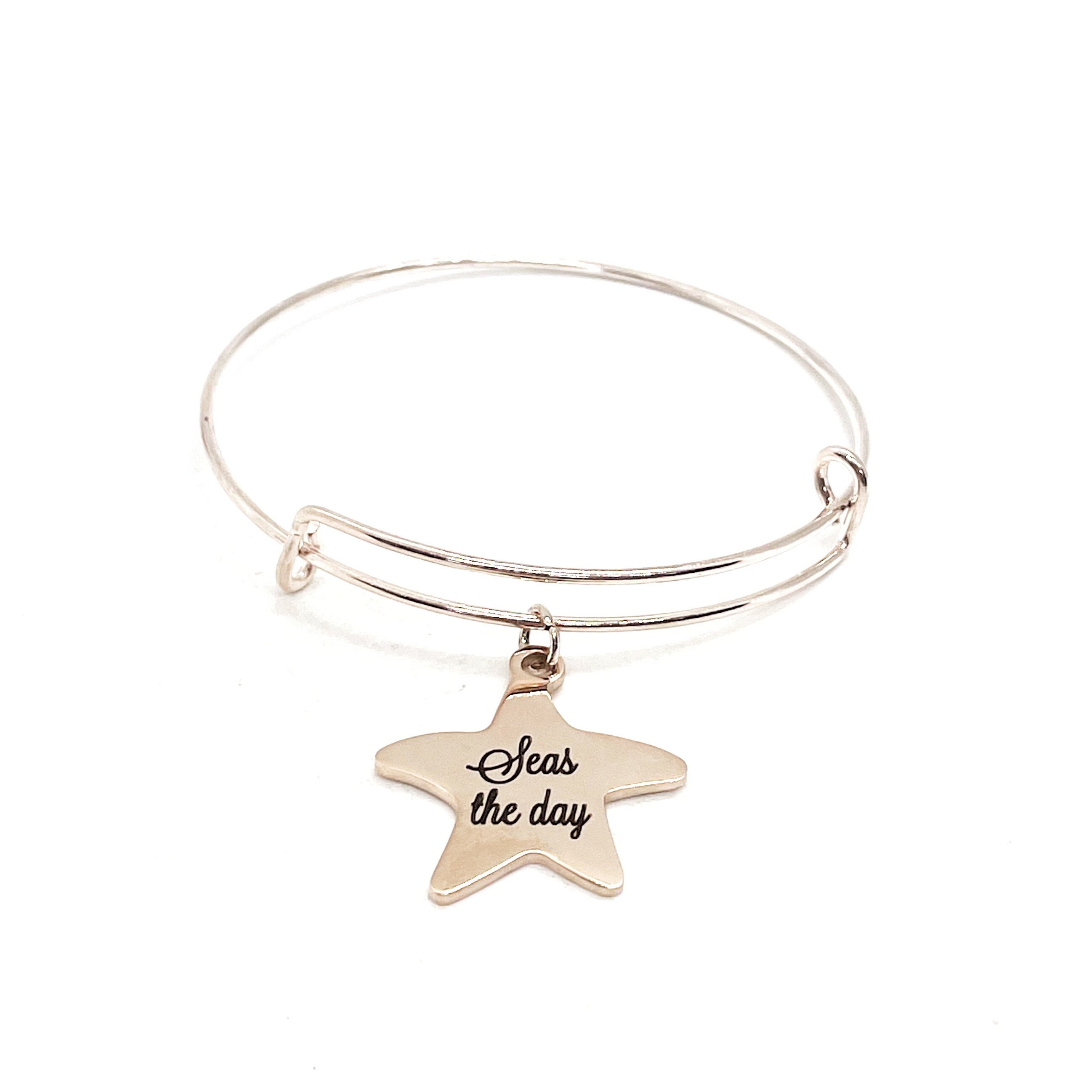 This stacking bangle charm bracelet jewelry gift would be a great gift for a beach lover or girls weekend trip. It has a rose gold stainless steel laser engraved charm with “Seas the day” on it.