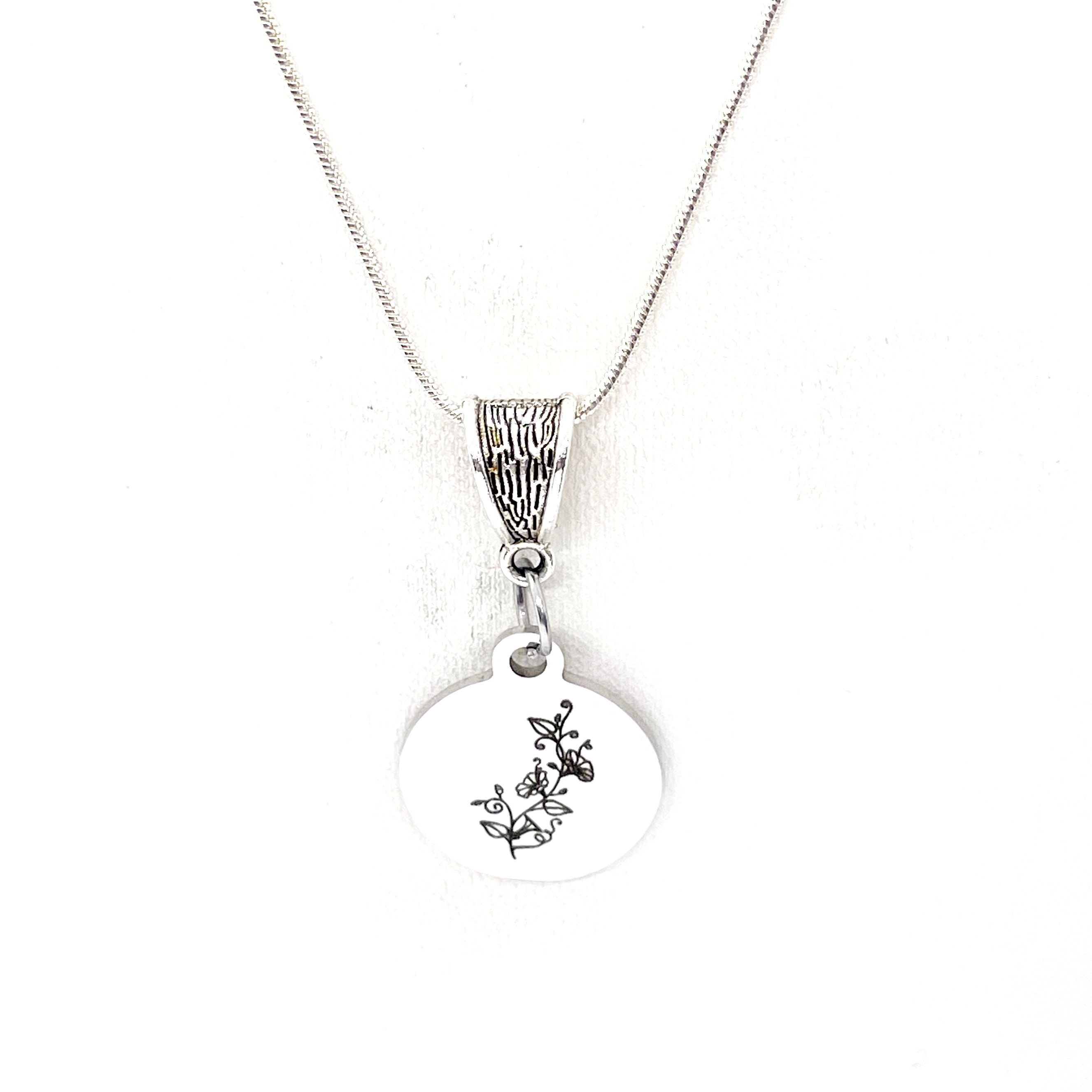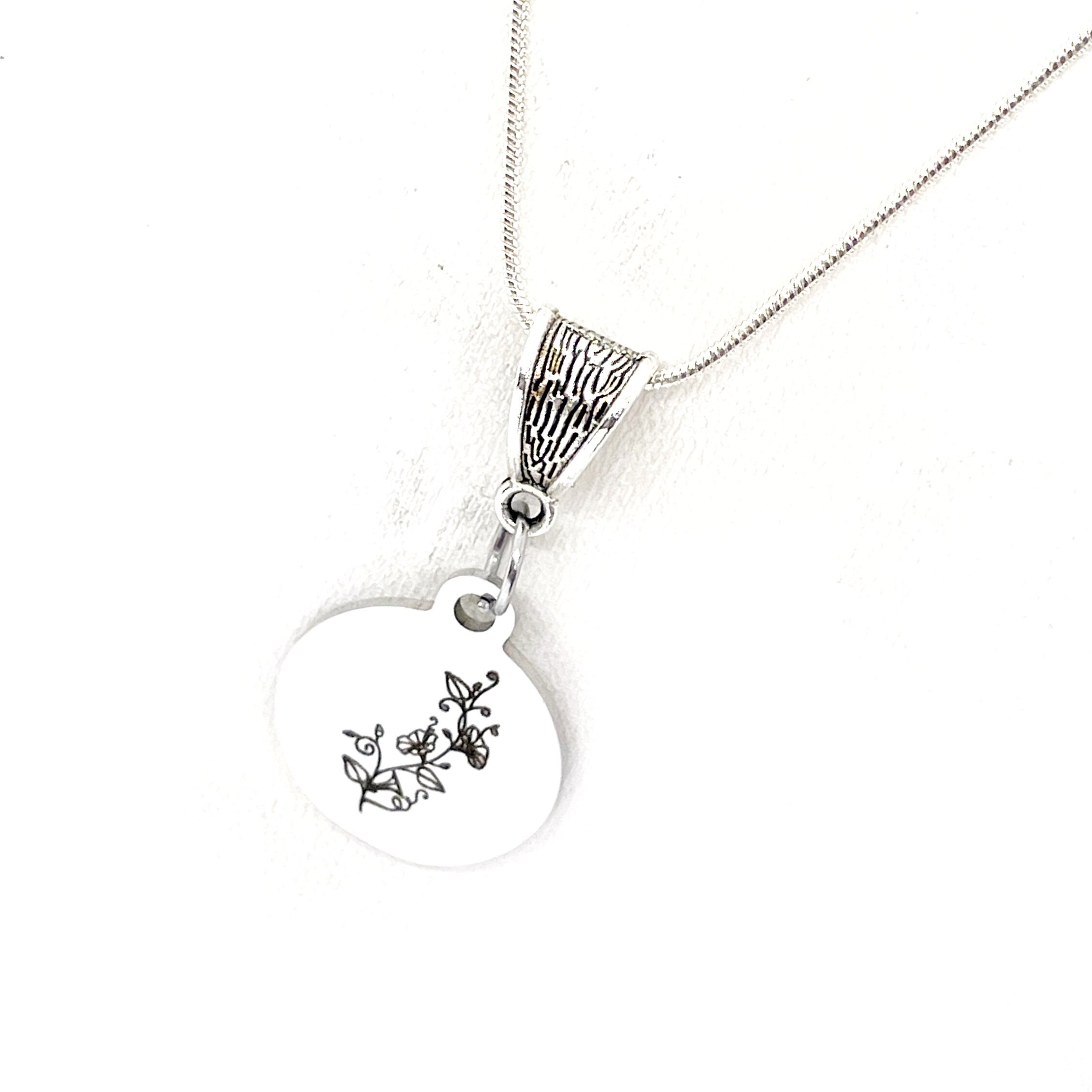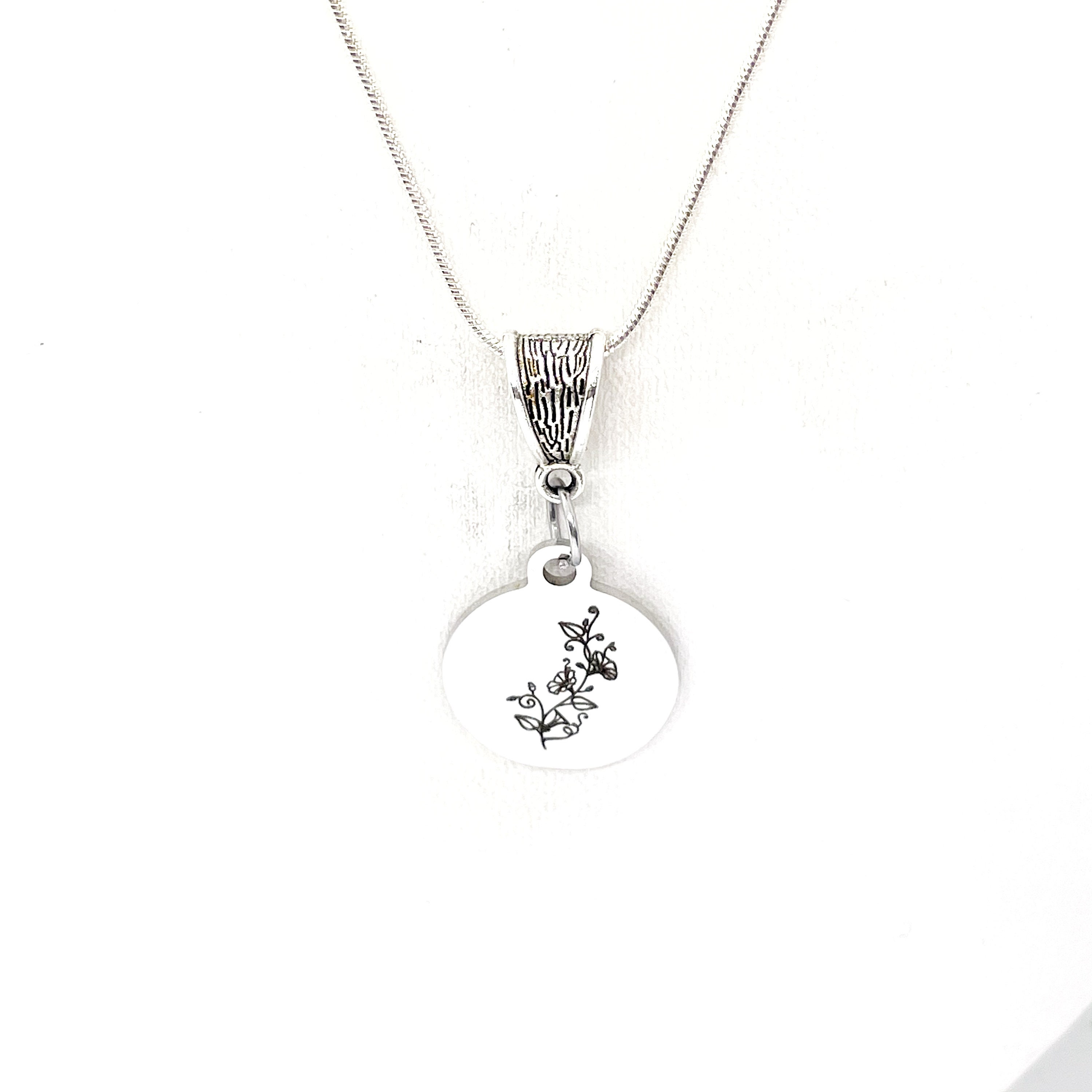 This is a great jewelry gift. It is a stainless steel laser engraved pendant on a silver-plated snake chain. The pendant has a Morning Glory flower, the birth month flower for September, on it.