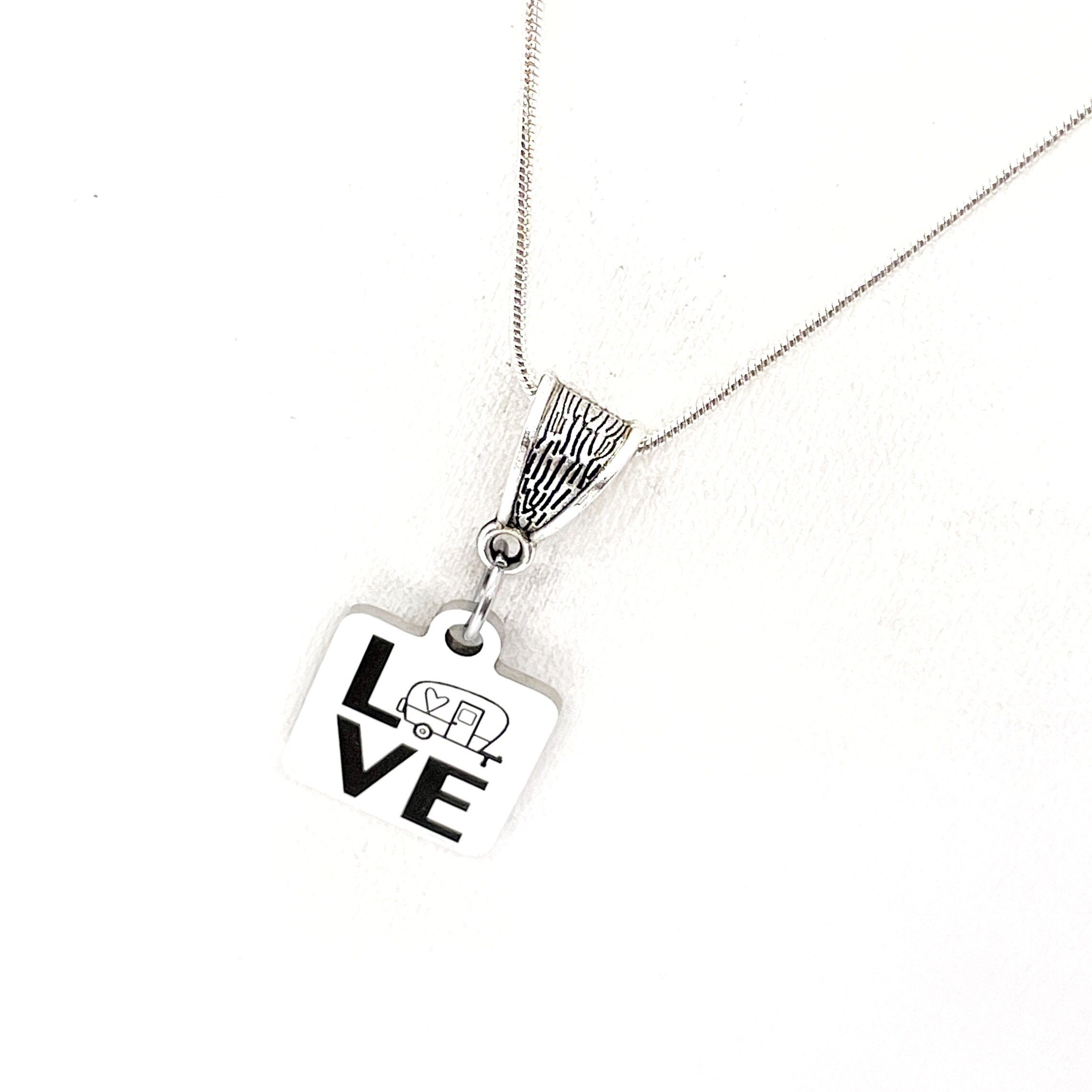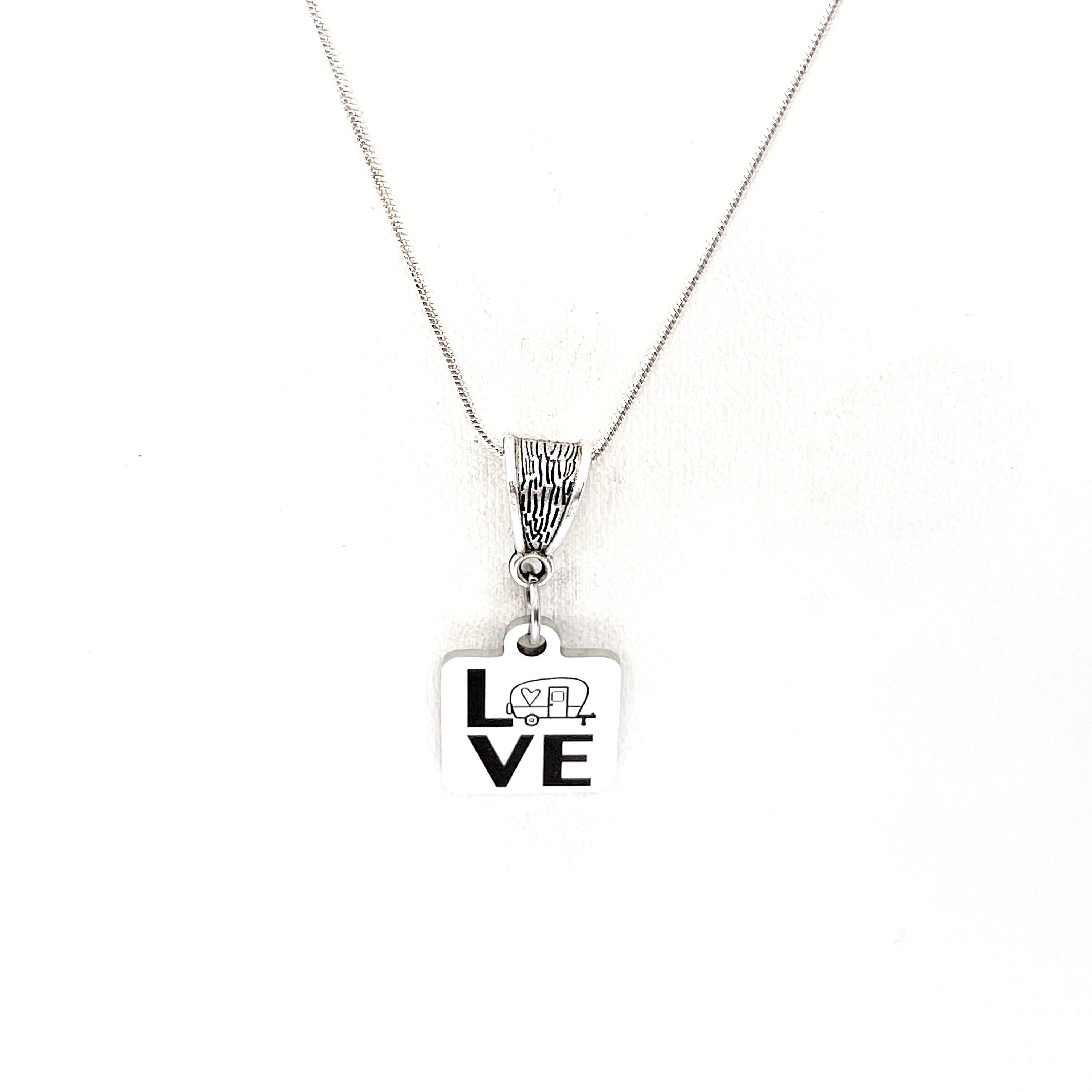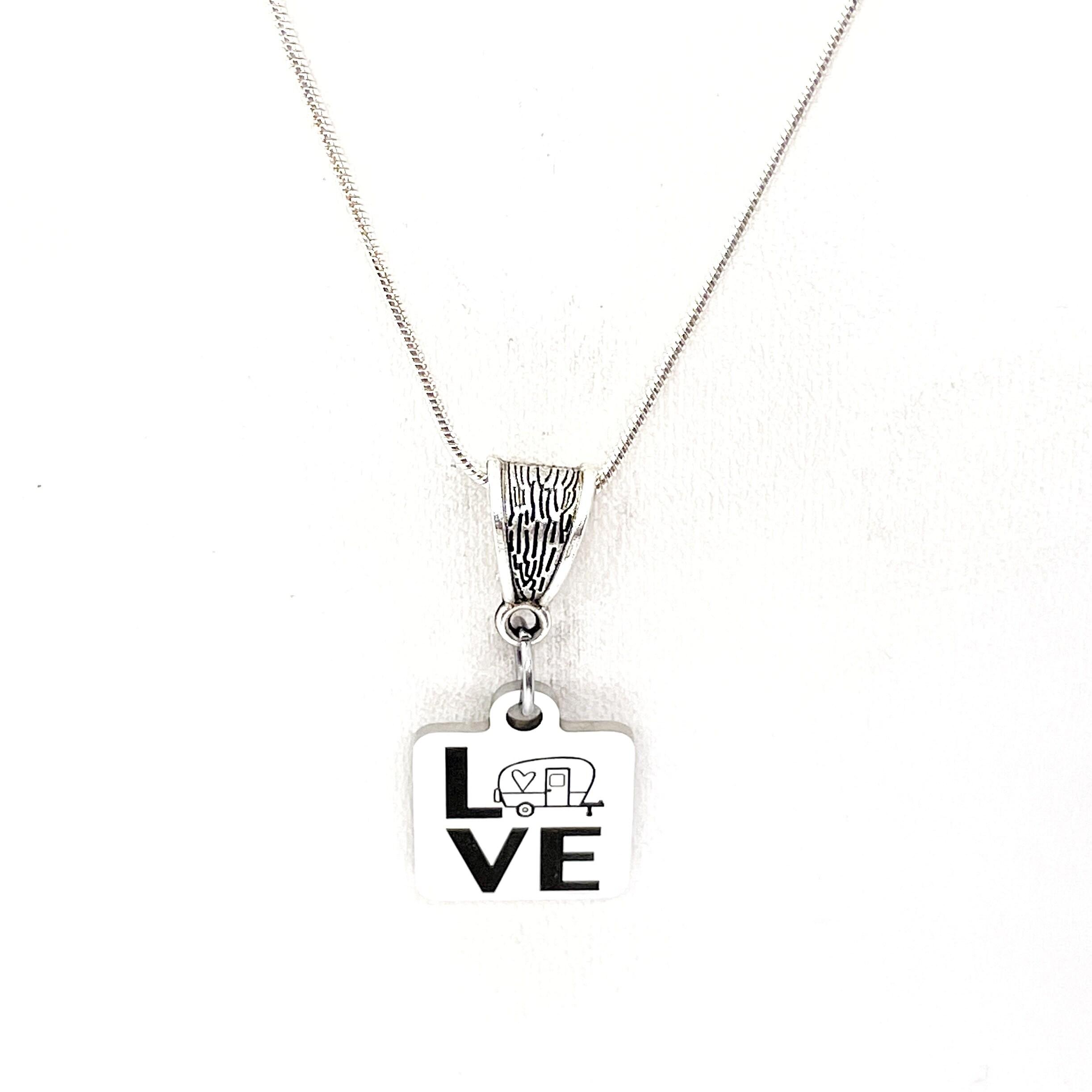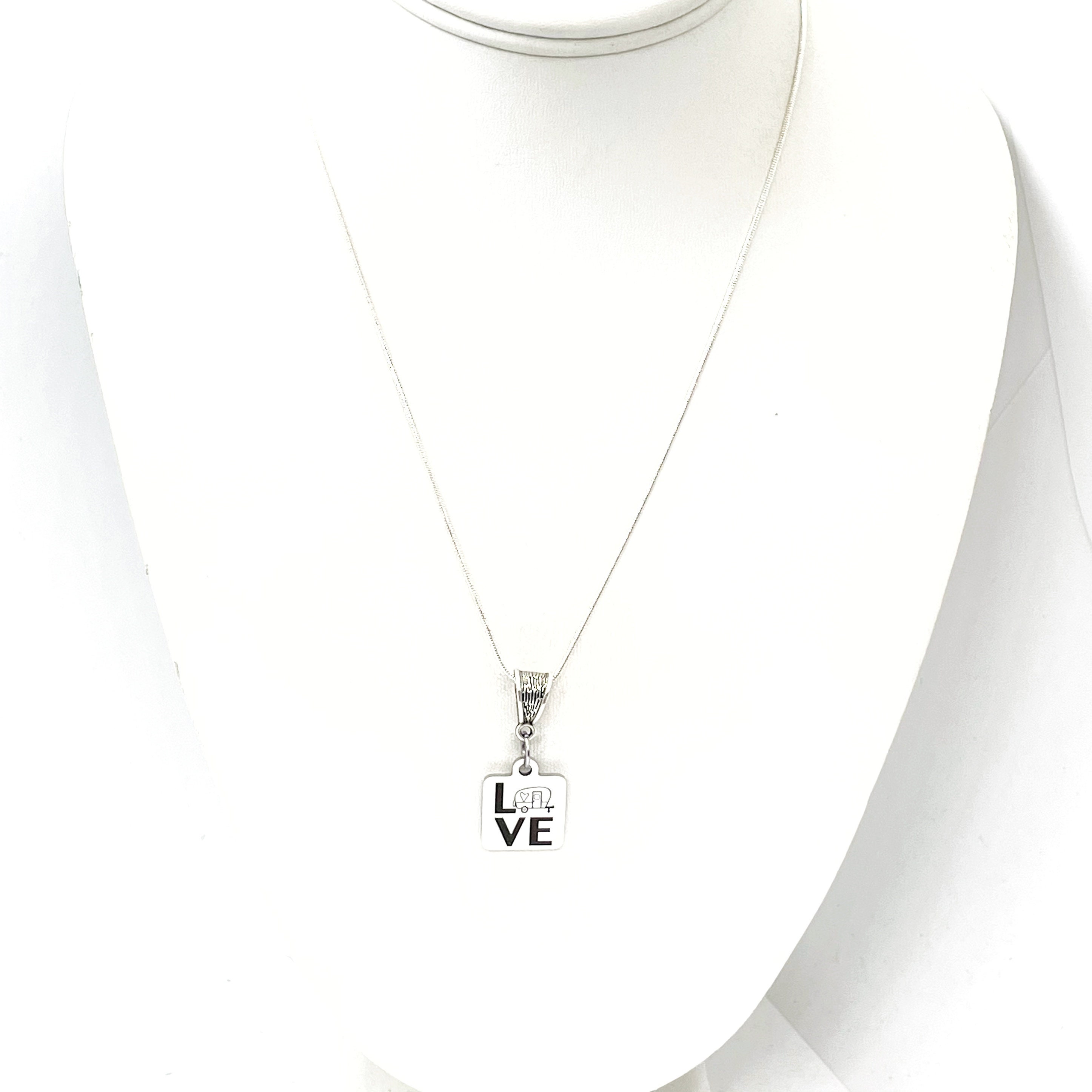 This is a great jewelry gift. It is a stainless steel laser engraved pendant on a silver-plated snake chain. The pendant has Love with a camper for the O on it.