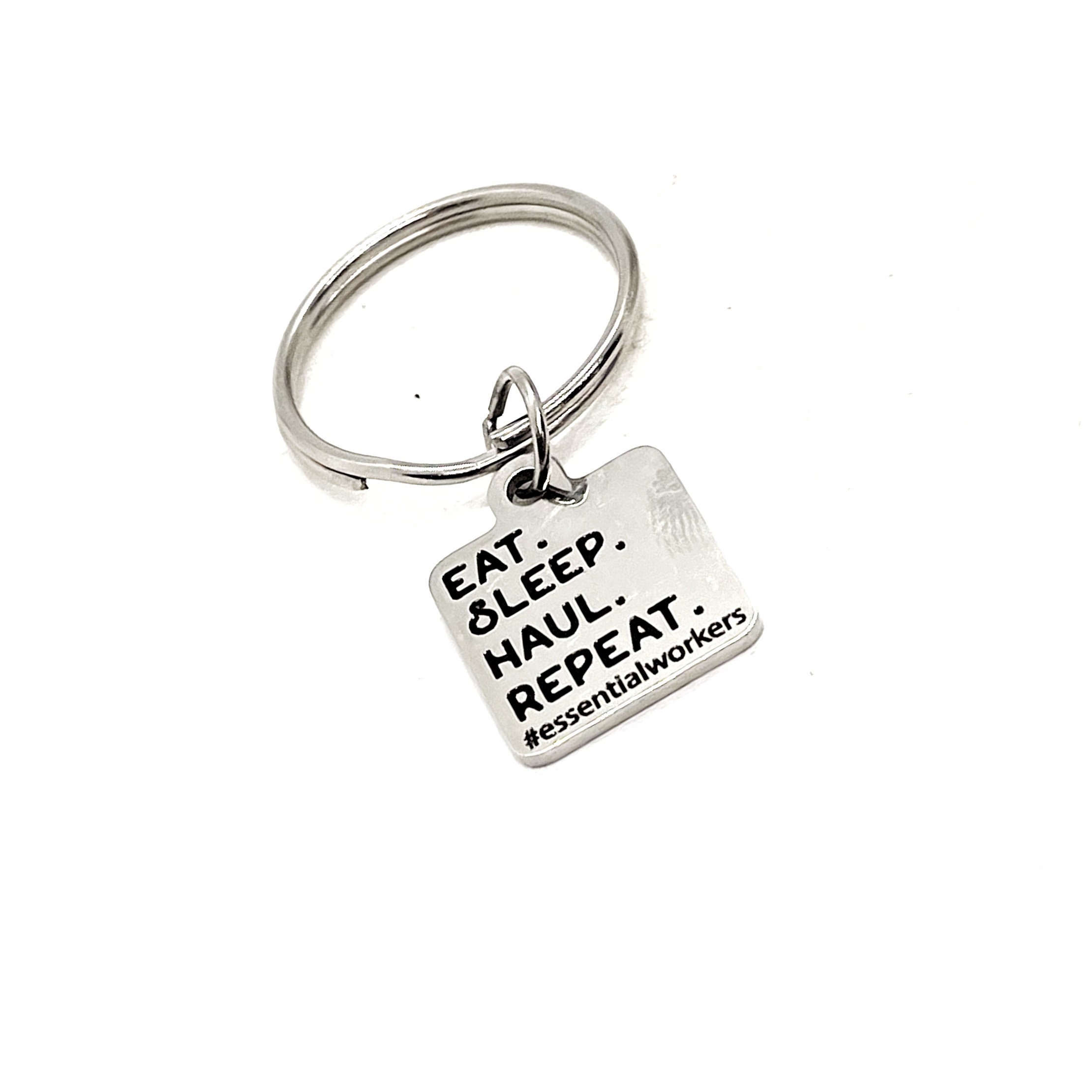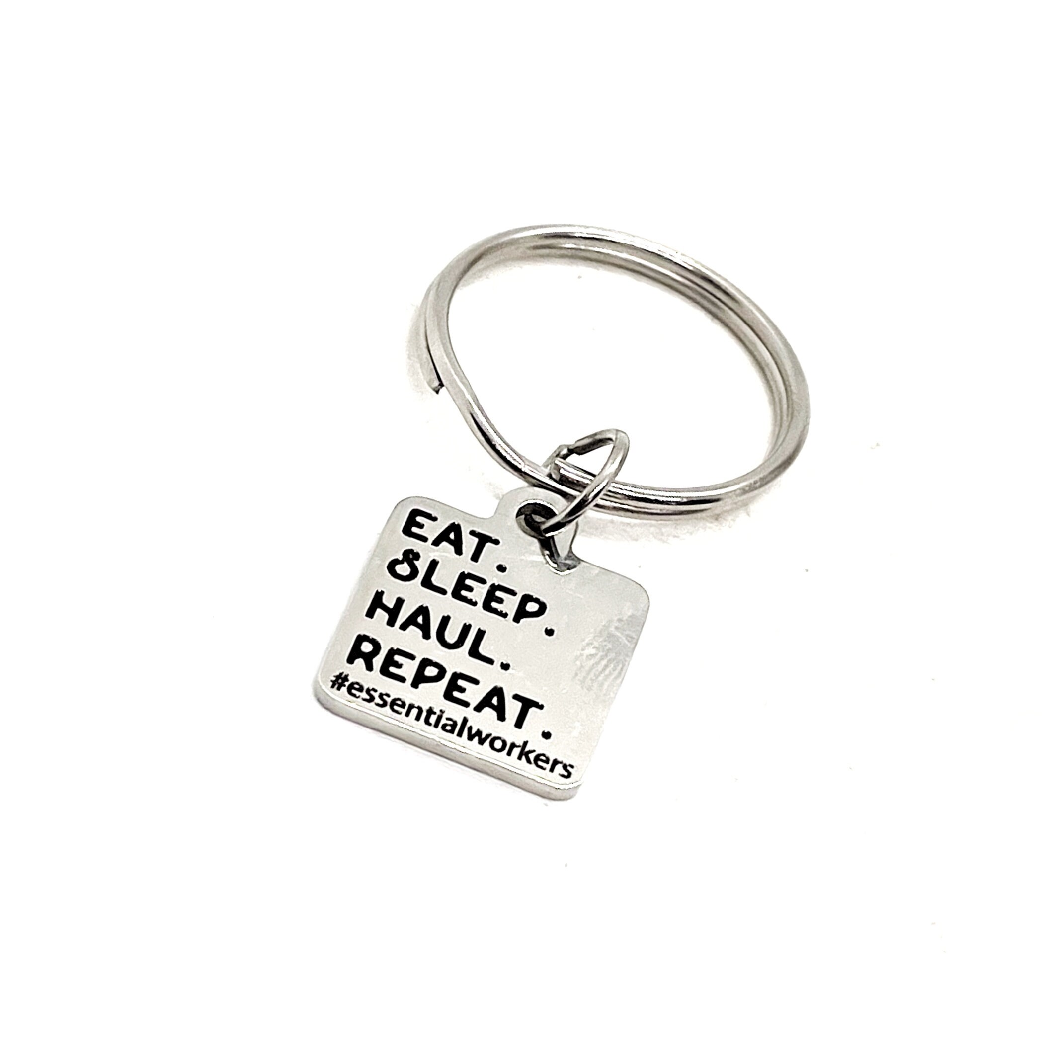 This is a wonderful keychain gift! It has a stainless steel laser engraved charm with “Eat. Sleep. Haul. Repeat. #essentialworkers” on it. The charm measures approx. 1/2 inch across.
