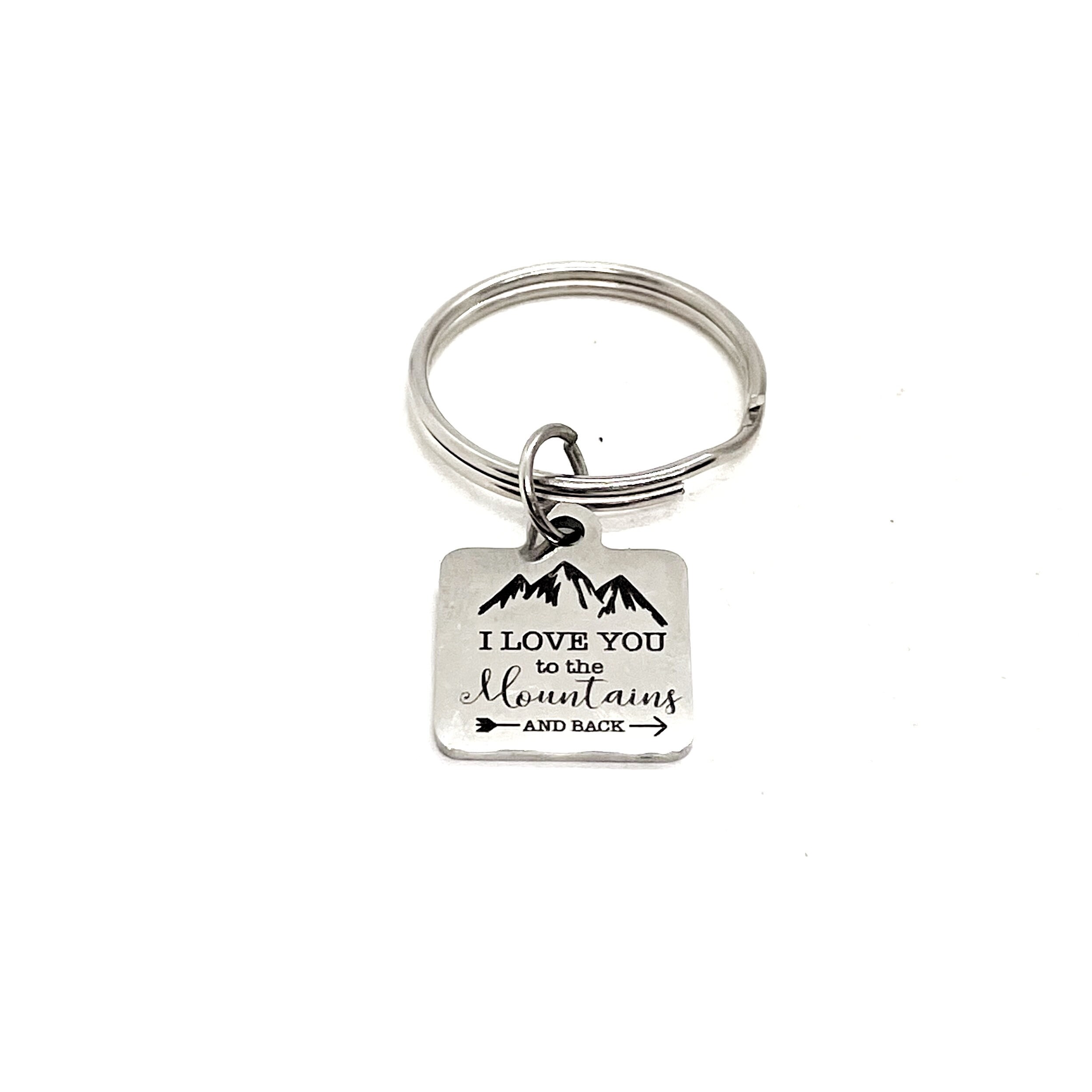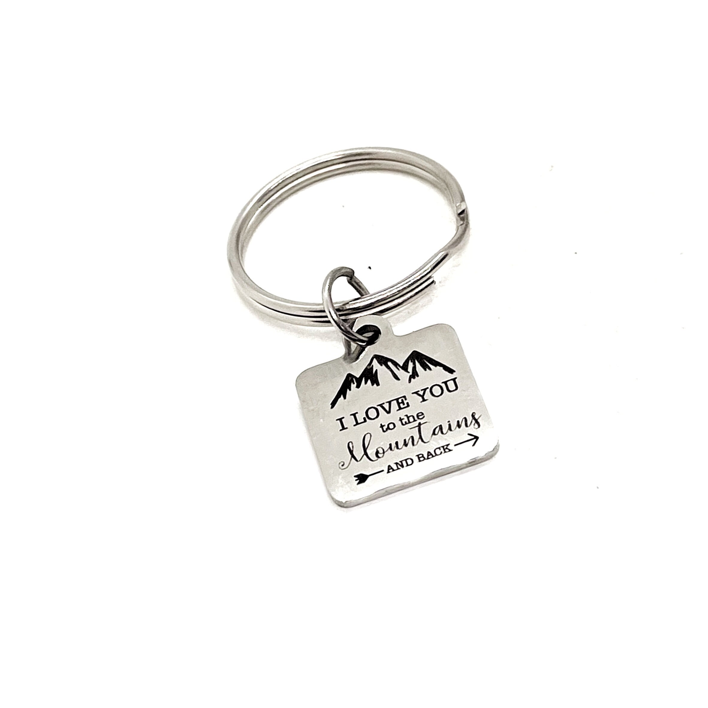 This is a wonderful keychain gift! It has a stainless steel laser engraved charm with “I love you to the mountains and back” on it. The charm measures approx. 1/2 inch across.
