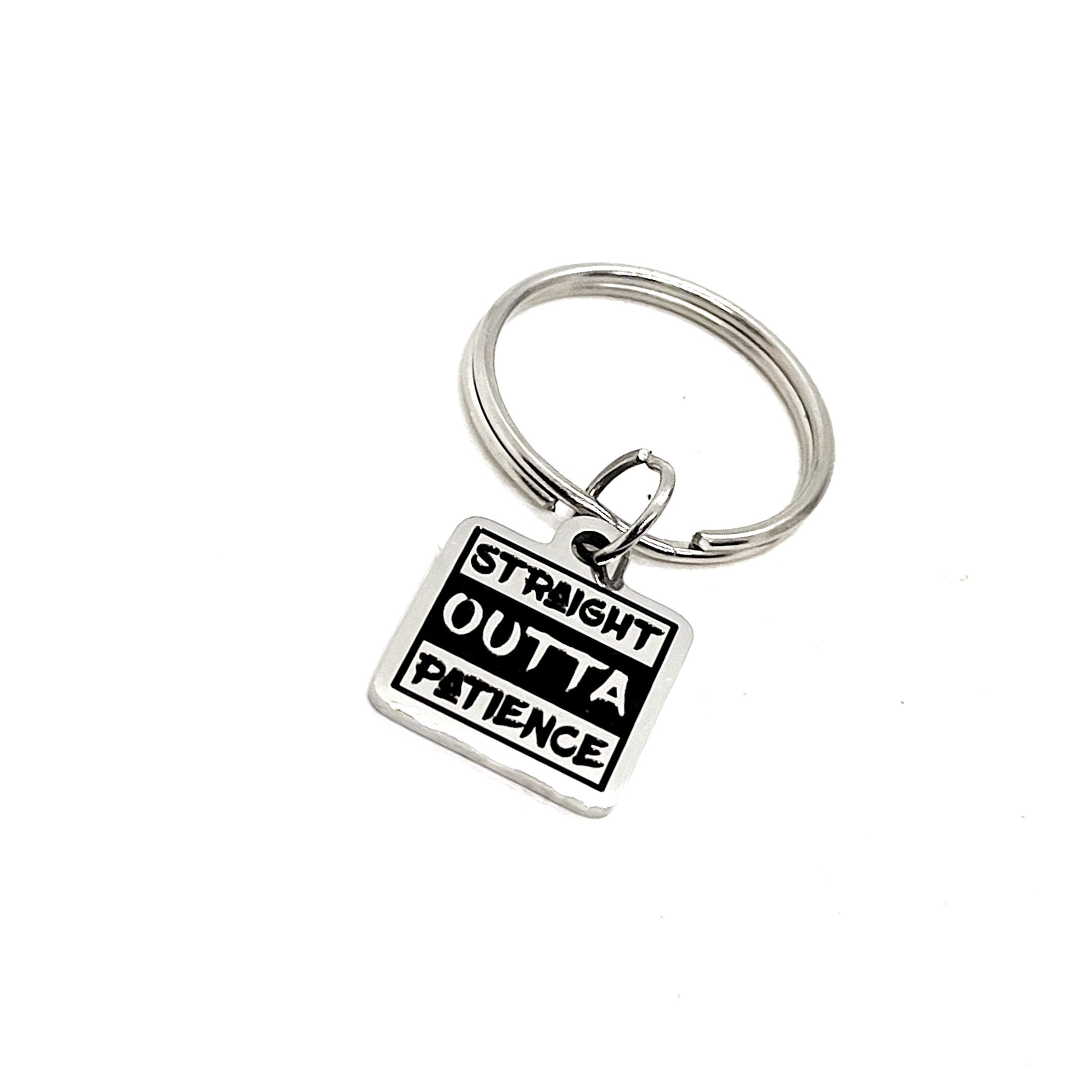 This is a wonderful keychain gift! It has a stainless steel laser engraved charm with “Straight outta patience” on it. The charm measures approx. 1/2 inch across.