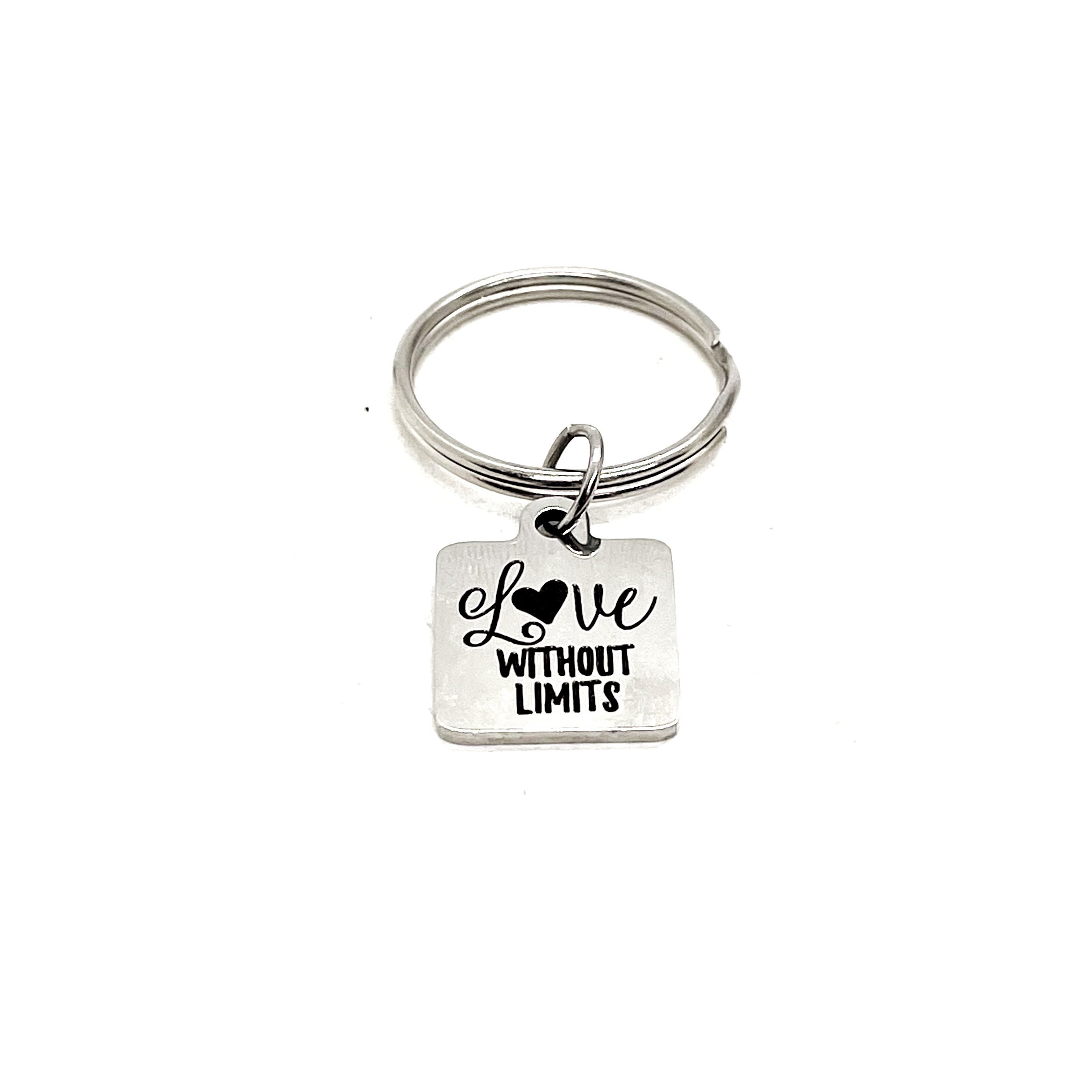 This is a wonderful keychain gift! It has a stainless steel laser engraved charm with “Love without limits” on it. The charm measures approx. 1/2 inch across.