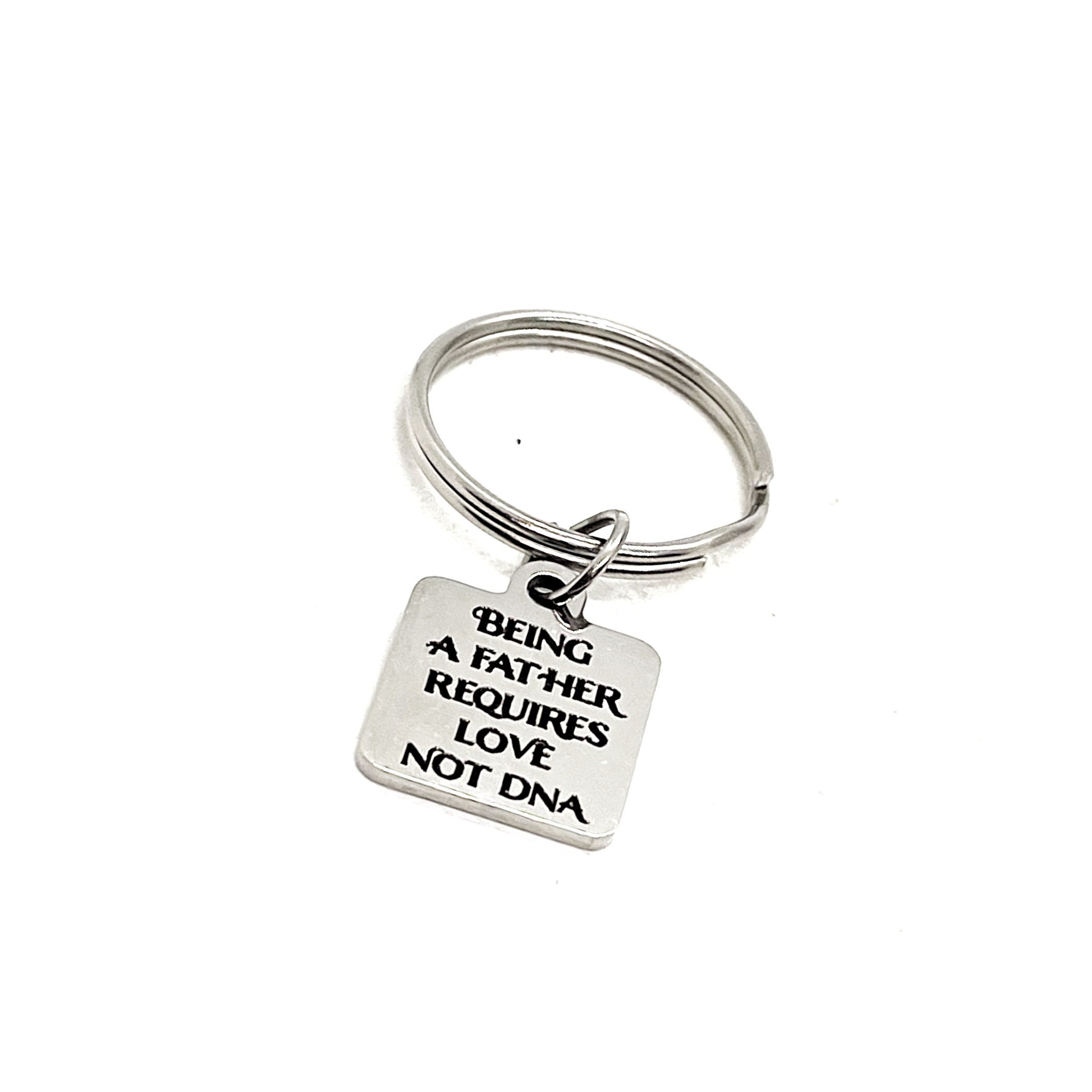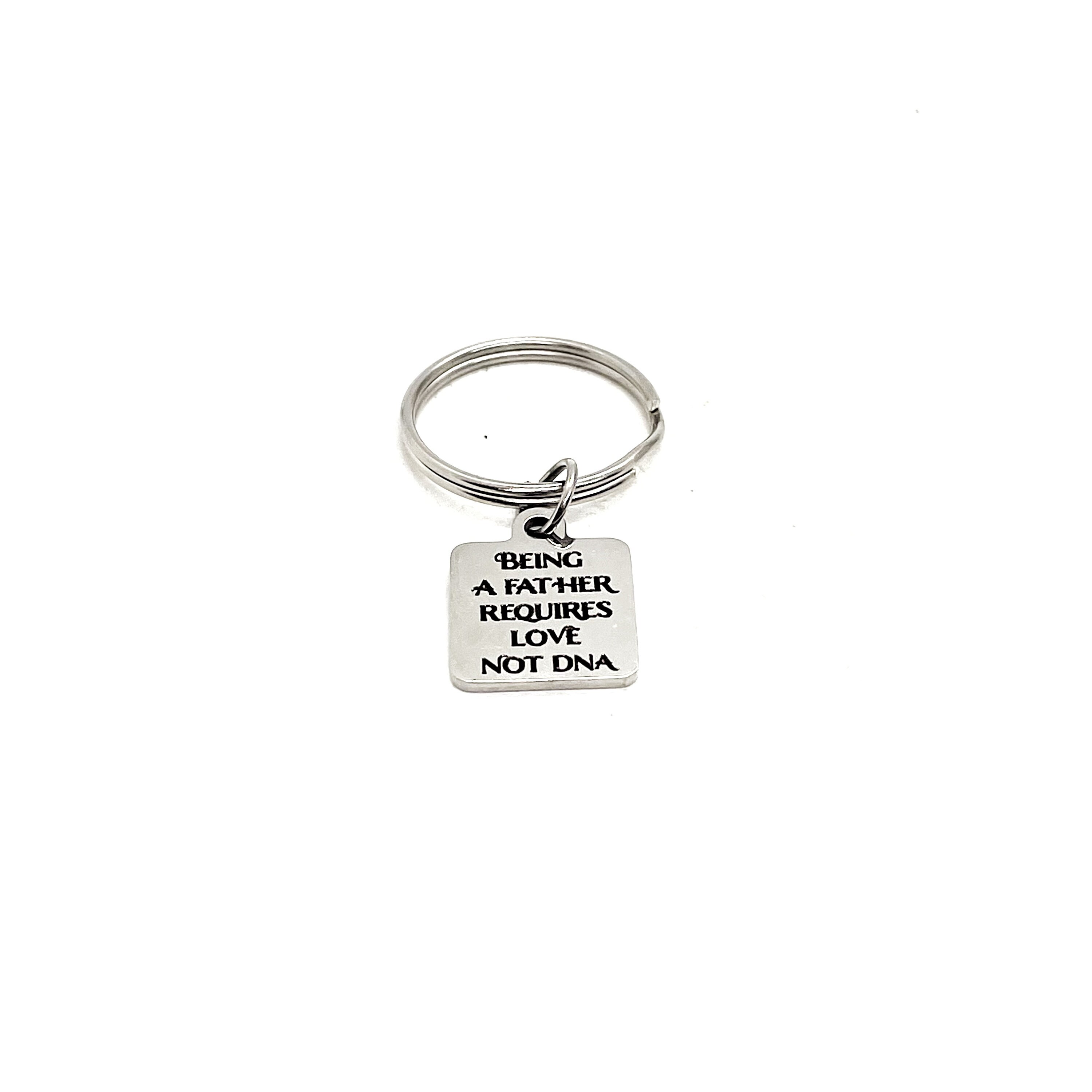 This is a wonderful keychain gift! It has a stainless steel laser engraved charm with “Being a father requires love not DNA” on it. The charm measures approx. 1/2 inch across.