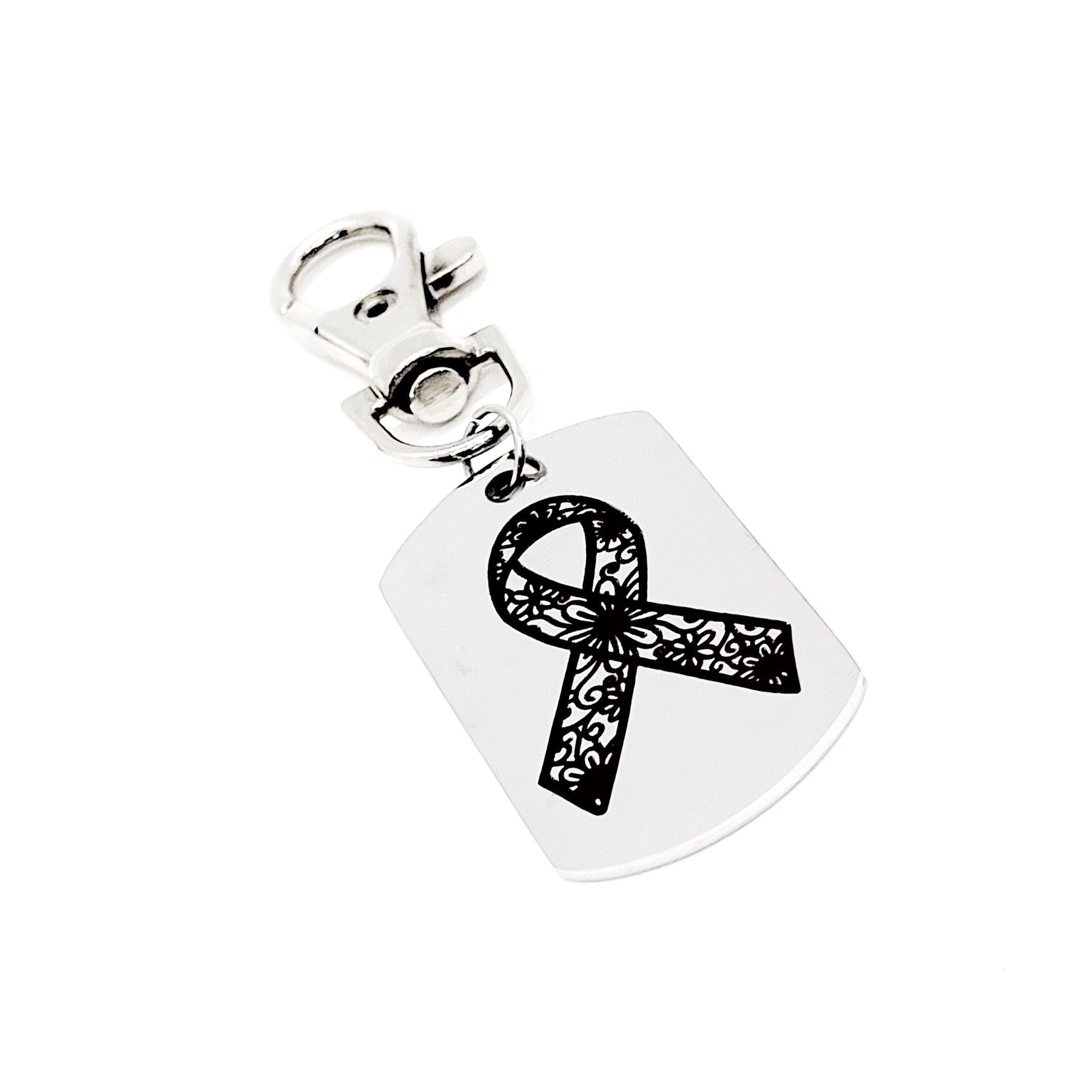 This is a zipper pull which includes a stainless steel laser engraved charm with a floral awareness ribbon on it.