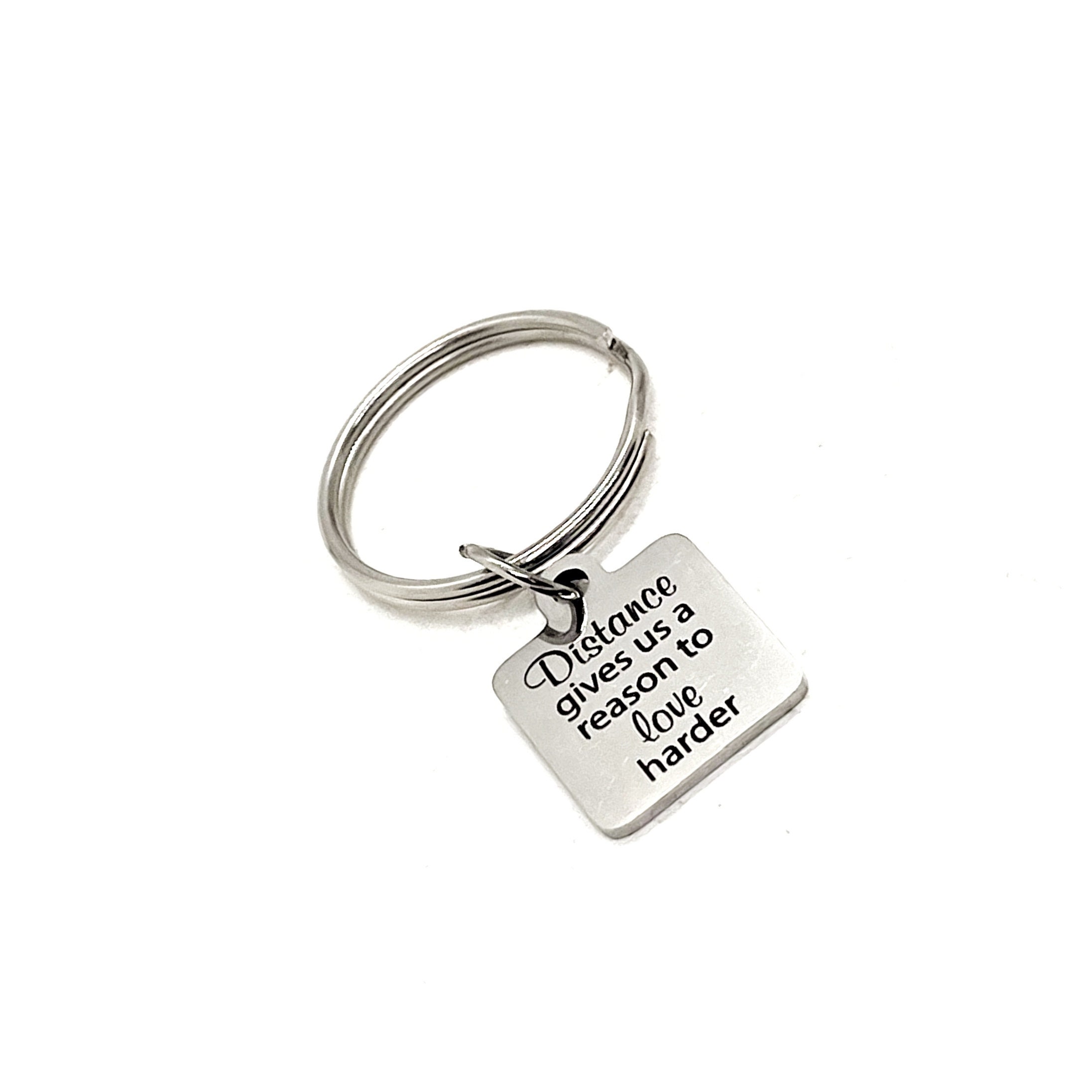 This is a wonderful keychain gift! It has a stainless steel laser engraved charm with “Distance gives us a reason to love harder” on it. The charm measures approx. 1/2 inch across.