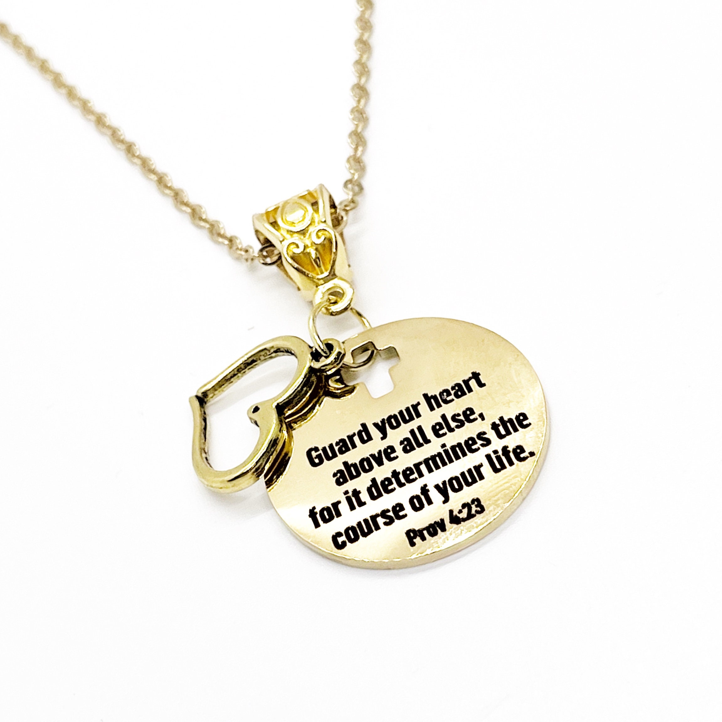 This is a Gold-plated brass necklace with a Gold-plated stainless steel laser engraved pendant with “Guard your heart above all else for for it determines the course of your life" from Proverbs 4:23 on it. This pendant is available on your choice of 16, 18, 20, 22, 24, 26, 28 or 30 inch chain.
