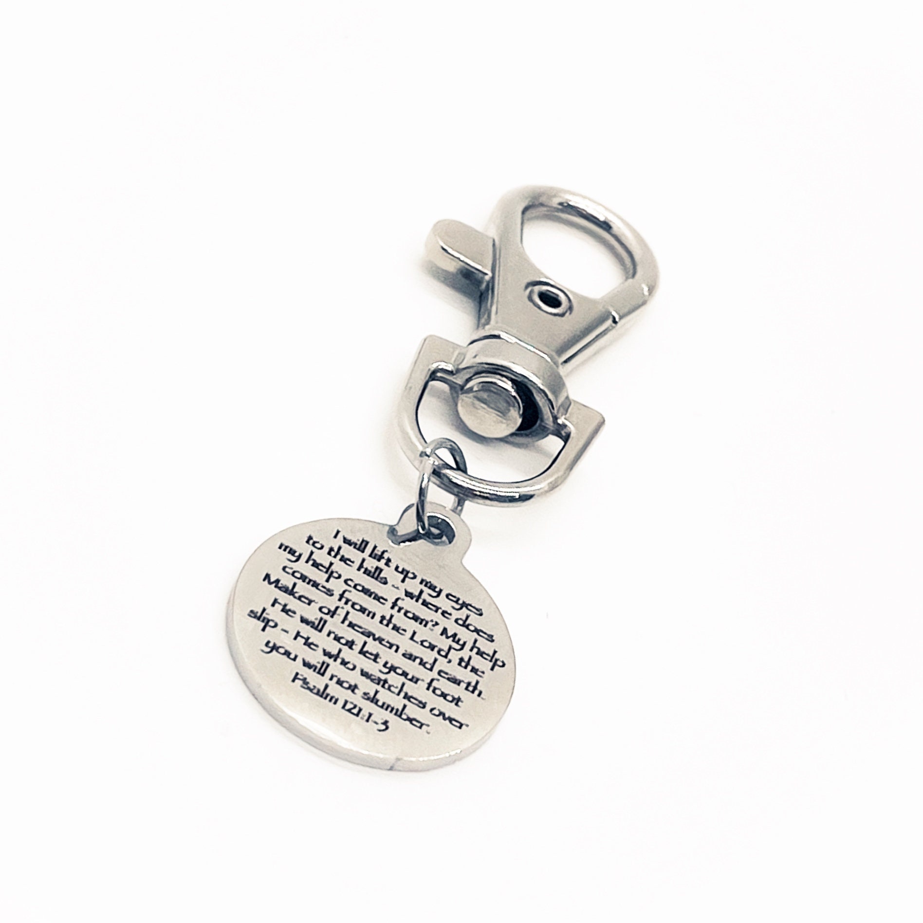 This is a great zipper pull or bag charm clip gift that would be a great gift. It would be a great charm to clip onto a tote, purse, sports bag, book bag or keychain. It has a engraved charm with “I will lift up my eyes to the hills - where does my help come from? My help comes from the Lord, the Maker of heaven and earth. He will not let your foot slip - He who watches over you will not slumber.” from Psalm 121: 1-3 on it.