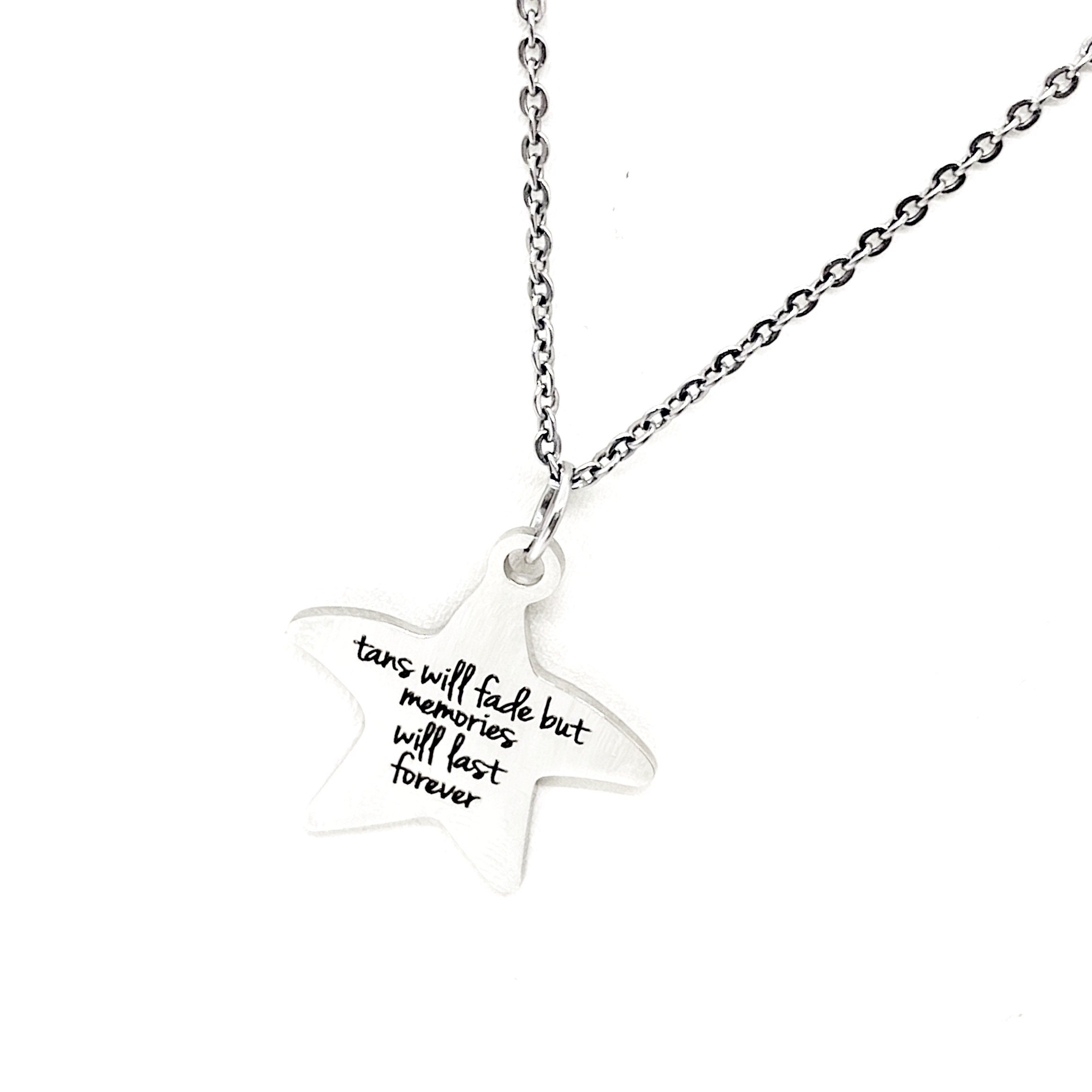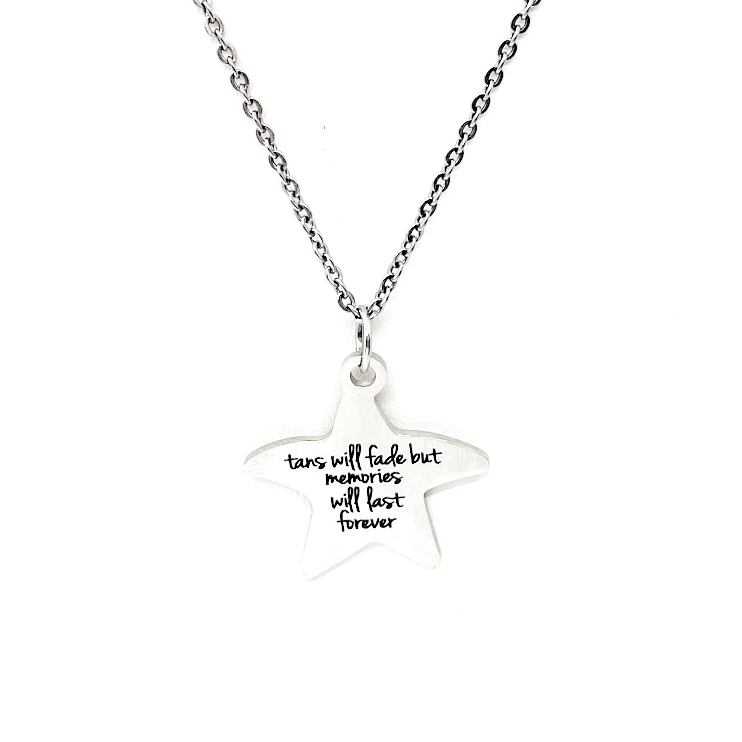 This beautiful necklace would make a great love jewelry piece. The pendant is a stainless steel laser engraved charm with “Tans will fade but memories will last forever” on it.