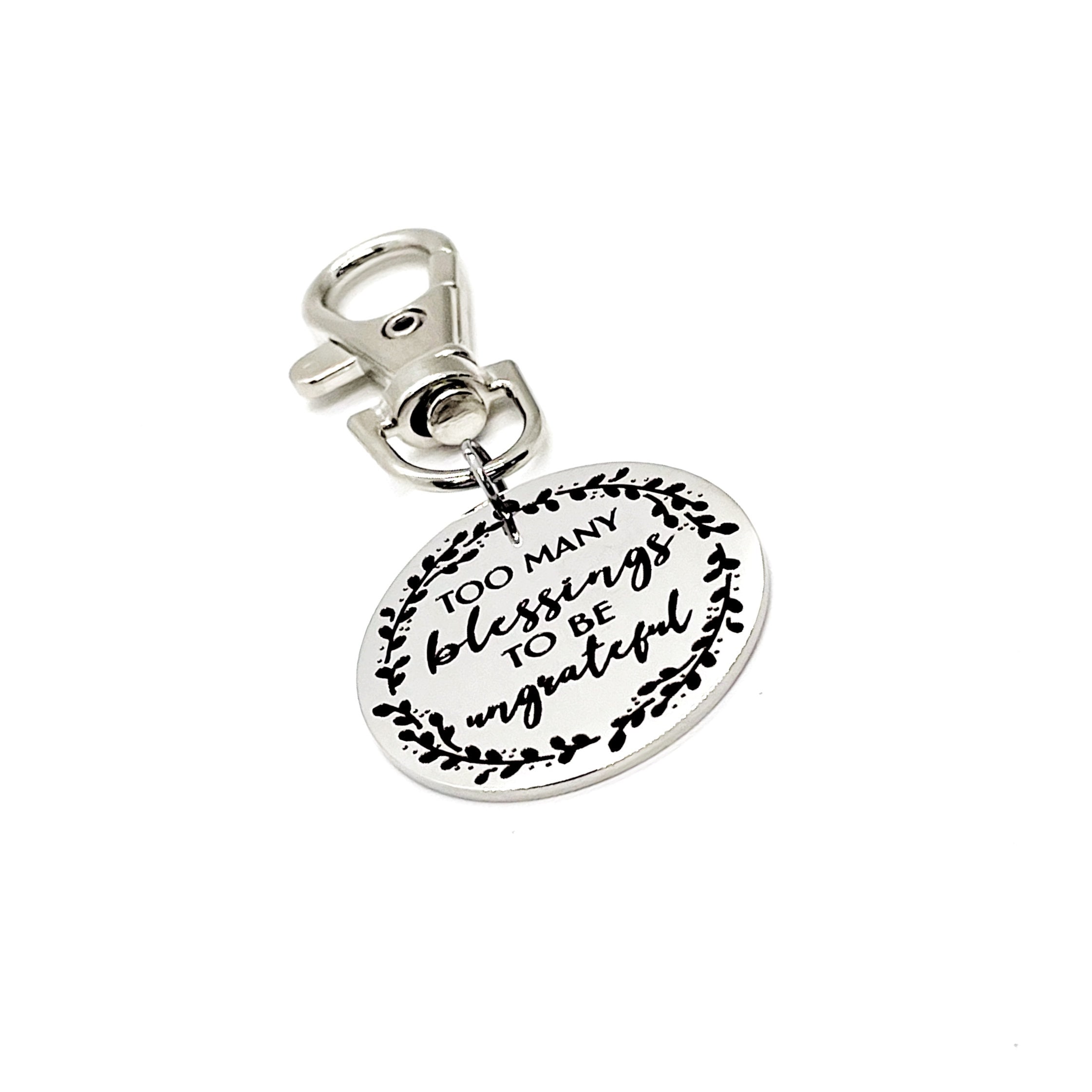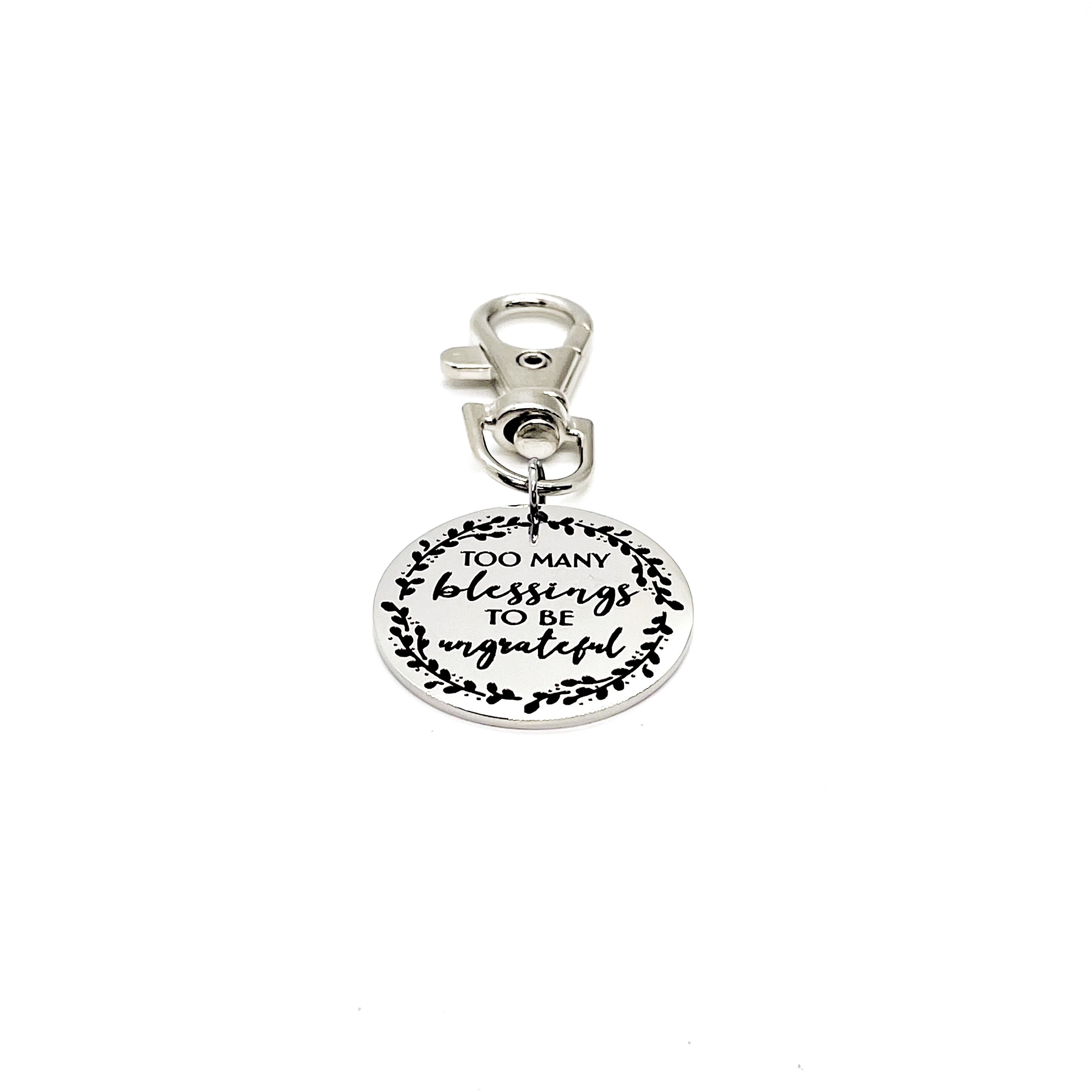 This is a great zipper pull or bag charm or keychain clip-on charm with a stainless steel laser engraved charm with “Too many blessings to be ungrateful” on it. The charm measures approx. 1 inch across.