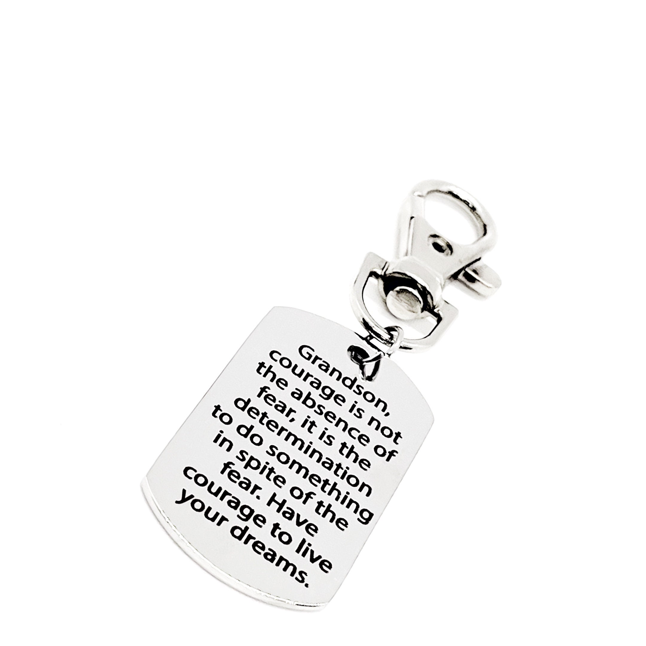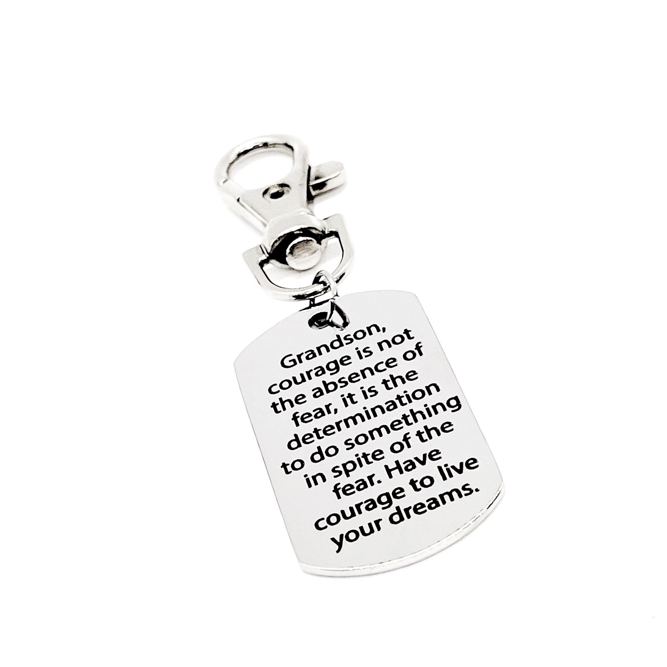 This is a zipper pull which includes a stainless steel laser engraved charm with the following on it: