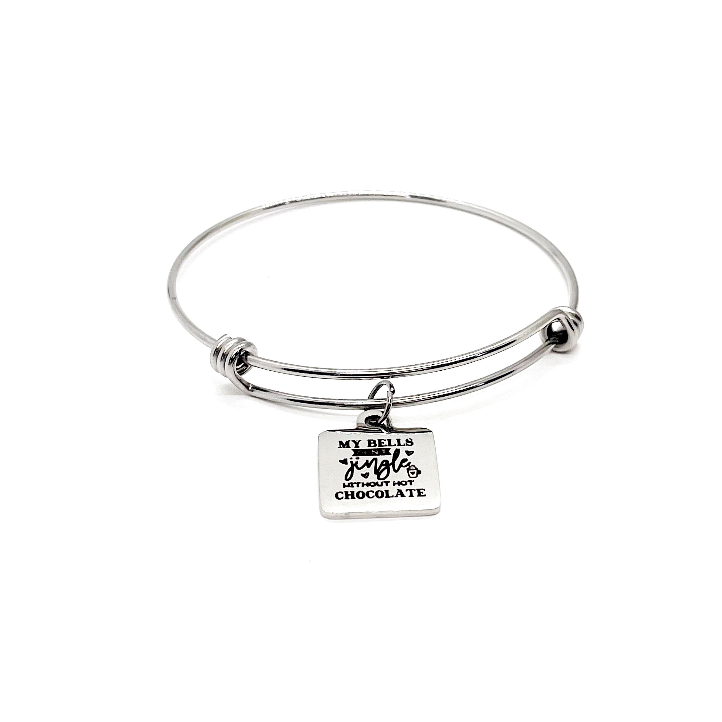 This stacking bangle bracelet has a stainless steel laser engraved charm that has “My bells don’t jingle without hot chocolate” on it.