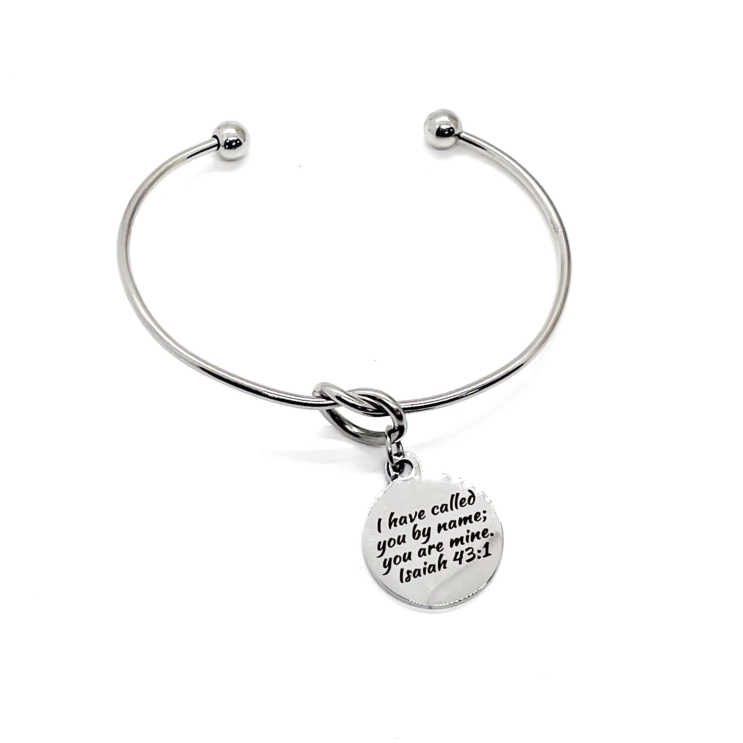 This is a beautiful knotted cuff bracelet with a stainless steel engraved charm with “I have called you by name; you are mine” from Isaiah 43:1 on it.