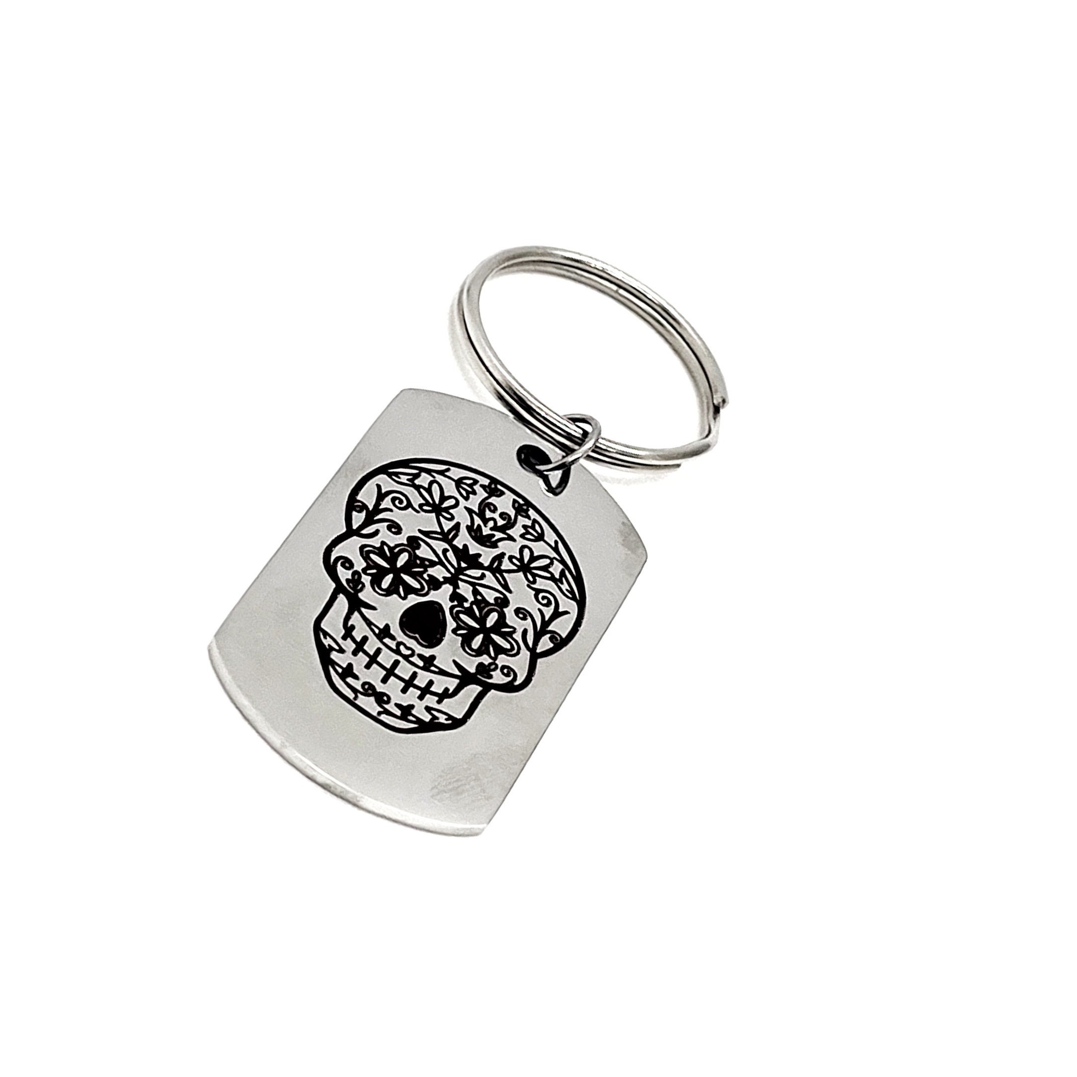This is a great keychain gift! It has a stainless steel laser engraved charm with a floral Day of the Dead image on it.