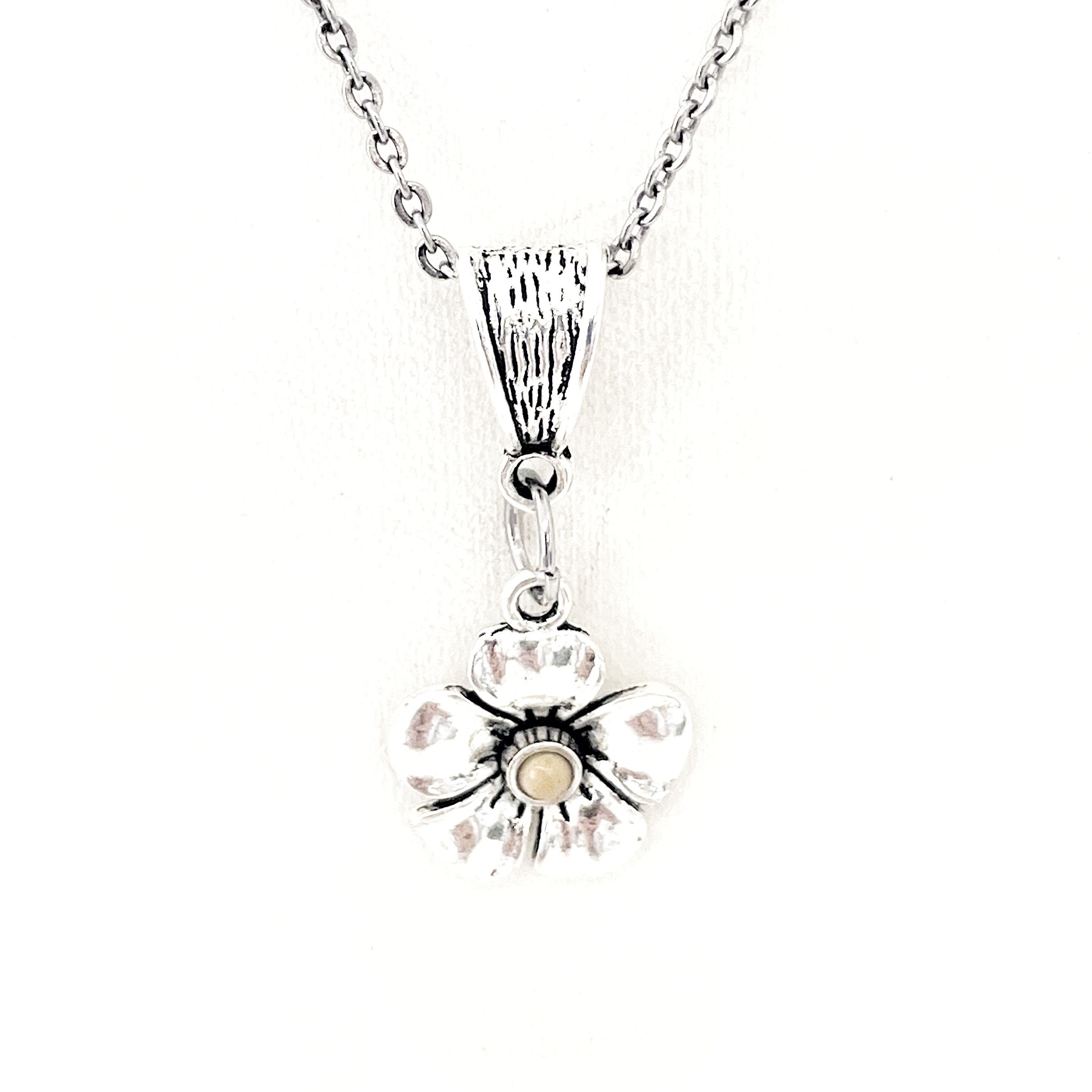 This is a silver-tone pendant on a stainless steel link chain. The pendant has a flat back to allow it to lie smoothly agains your clothing or skin. This pendant is available on your choice of 16, 18, 20, 22, 24, 26, 28 or 30 inch chain. The pendant is also available for individual purchase if you have another chain on which you would like to wear it. The charm measures approx. 3/4 inch in length.