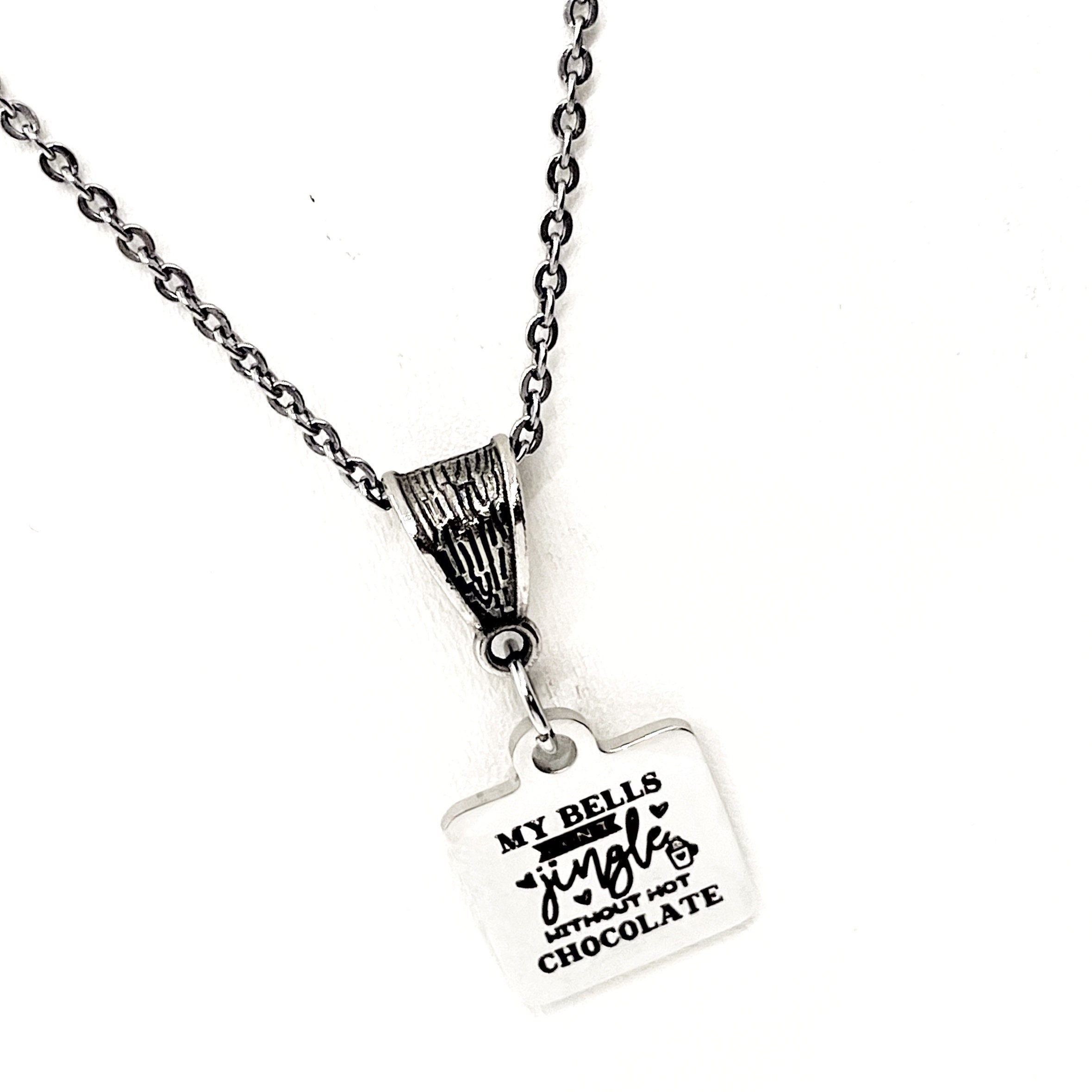 This beautiful necklace would make wonderful gift. It has a laser engraved charm with “My bells don’t jingle without hot chocolate” on it. The charm measures approx. 1/2 inch across.