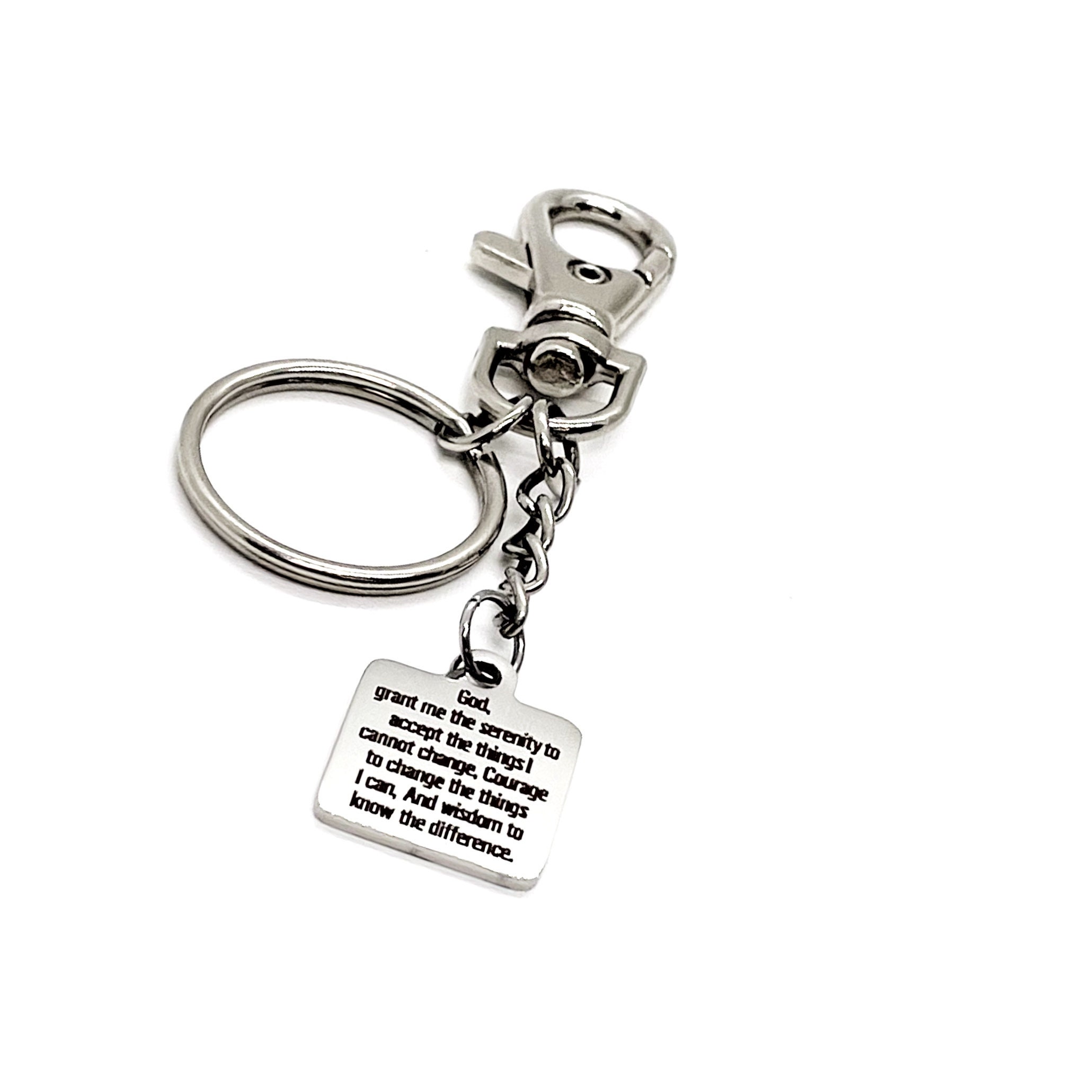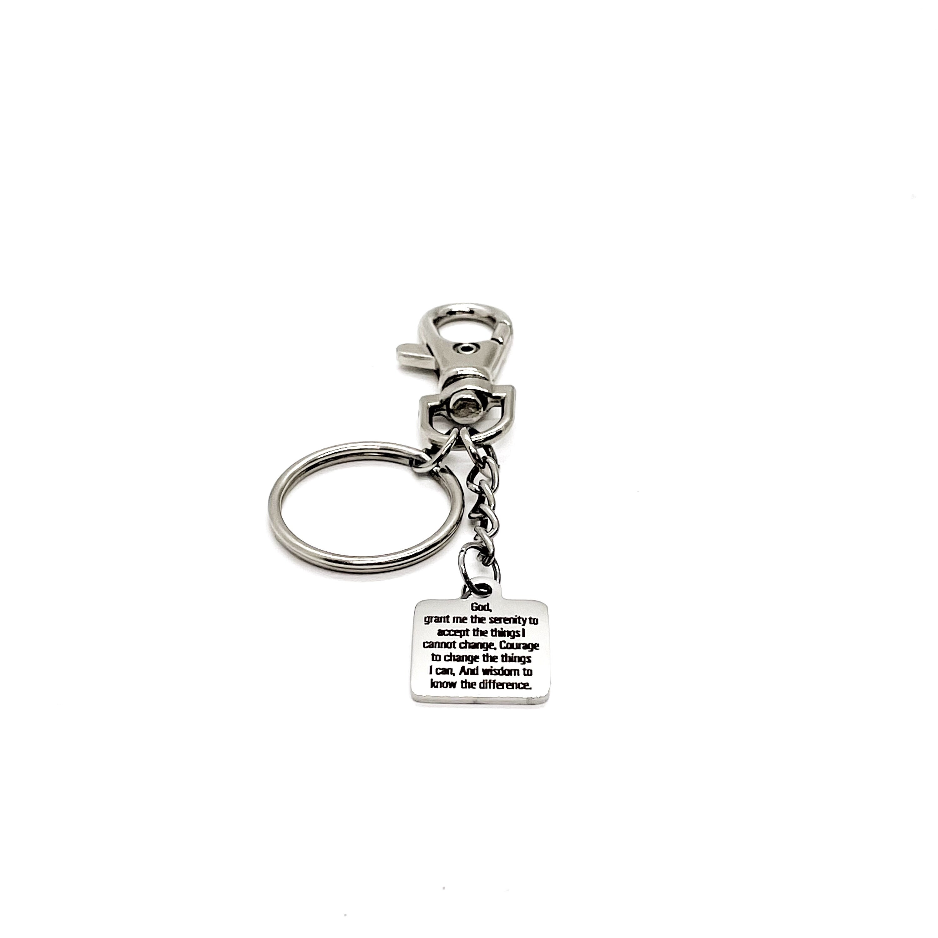 This is a great keychain gift . The keyring can be clipped onto your bag to make it easy to access without digging to the bottom of the bag. It has a stainless steel laser engraved charm with The Serenity Prayer on it.