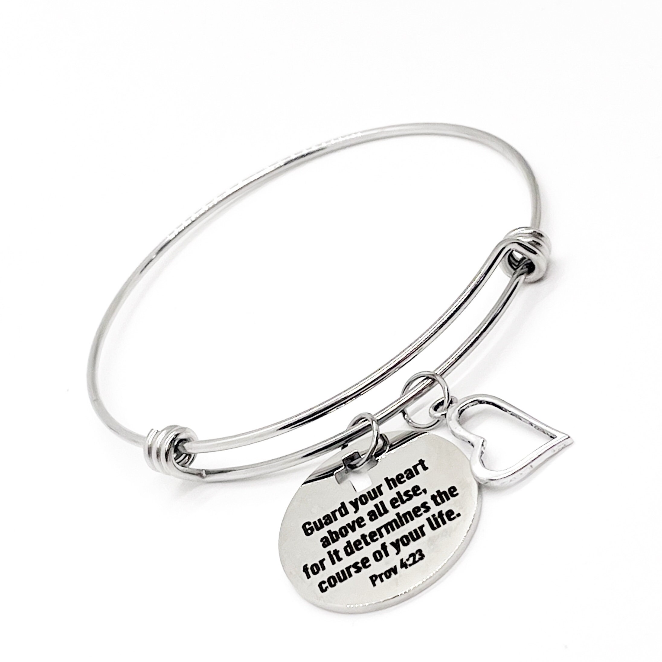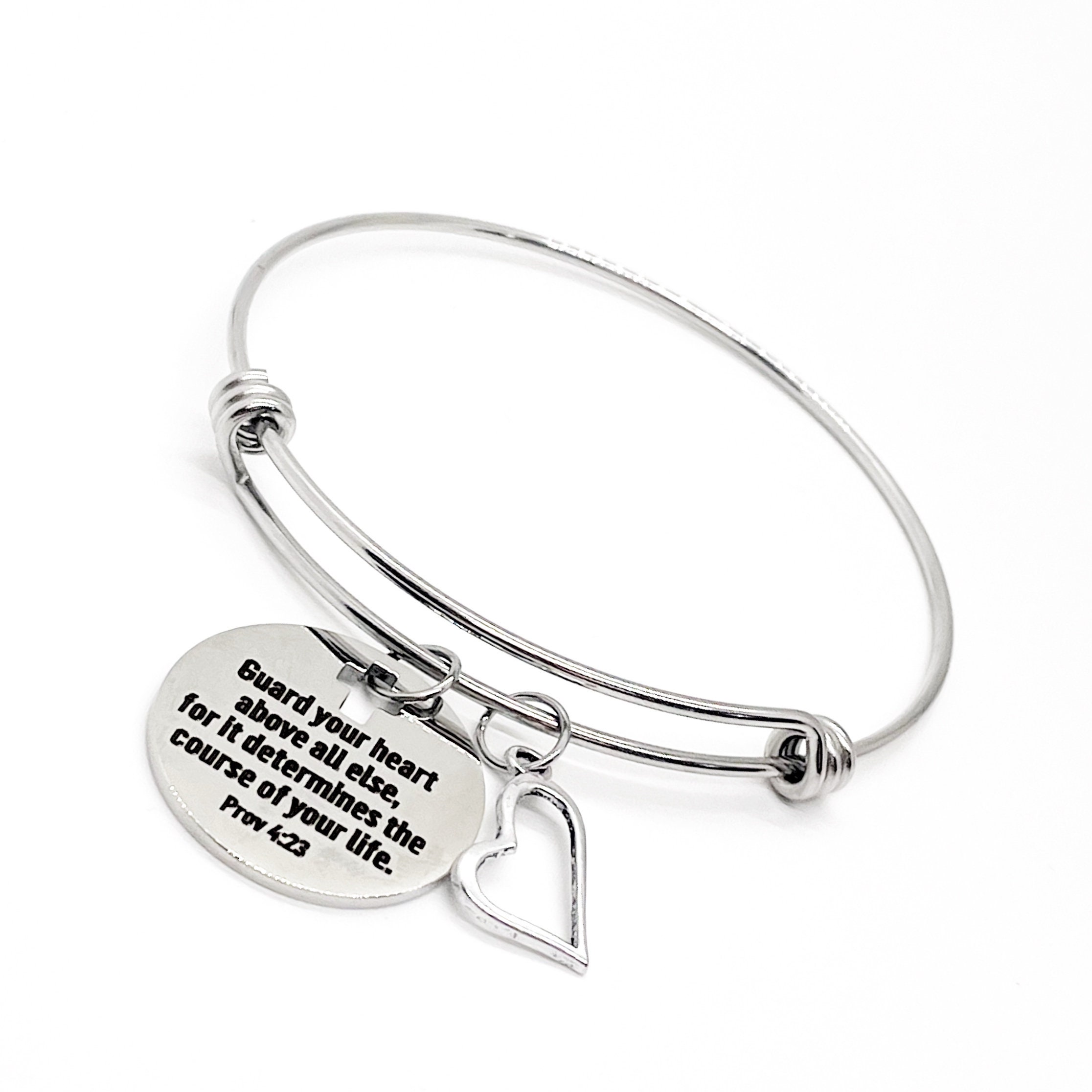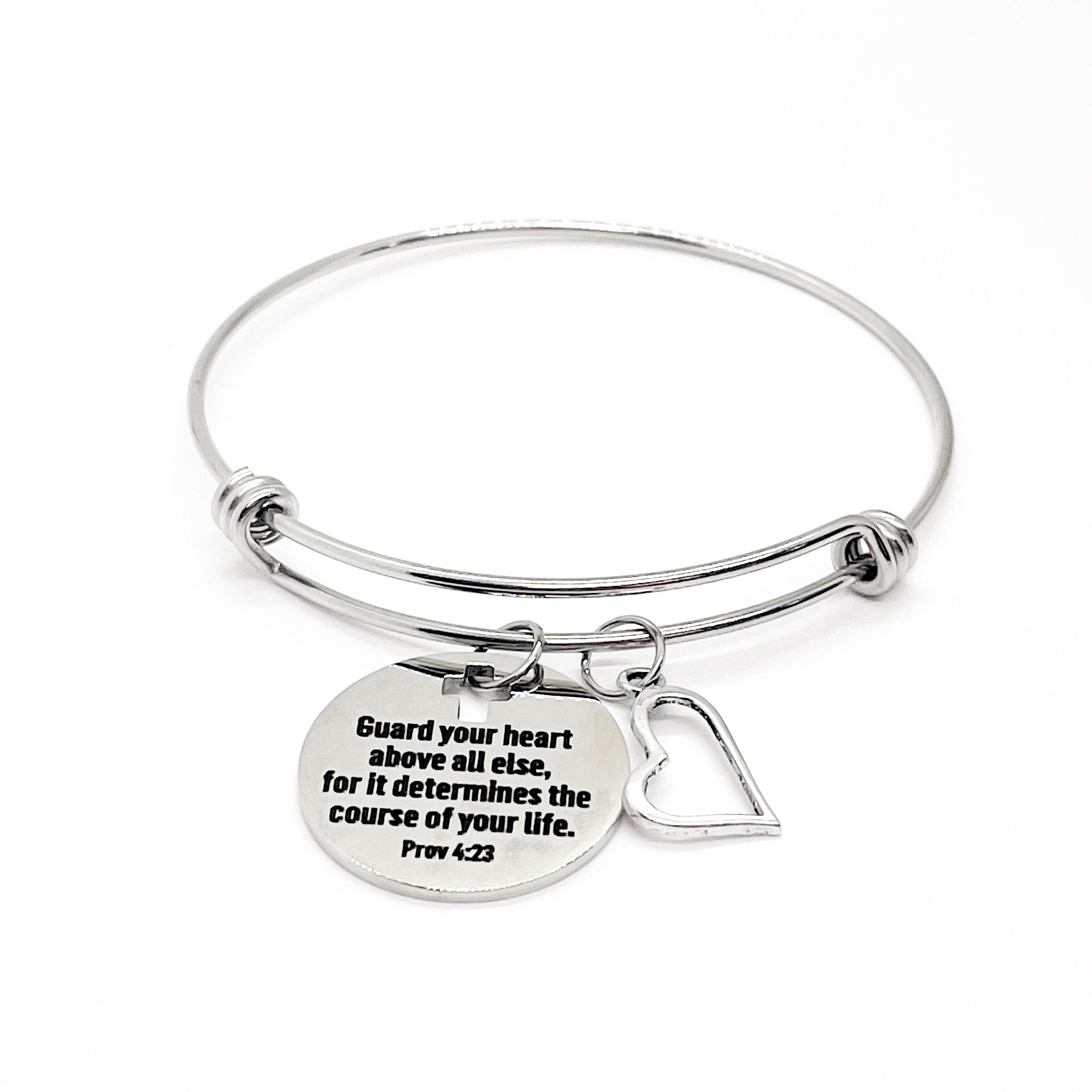 This is a beautiful bangle bracelet with a laser engraved stainless steel charm that has “Guard your heart above all else for it determines the course of your life” from Proverbs 4:23 on it. The bracelet is made of stainless steel to withstand regular wear without tarnishing or changing colors.