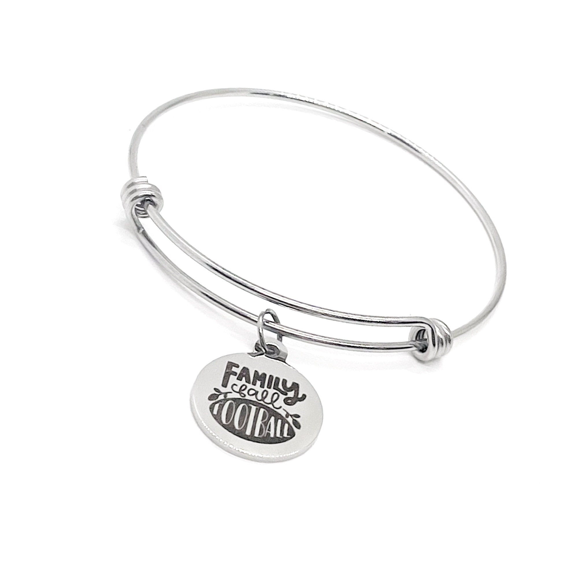 This is a beautiful bangle bracelet with a laser engraved stainless steel charm that has “Family Fall Football” on it. The bracelet is made of stainless steel to withstand regular wear without tarnishing or changing colors.