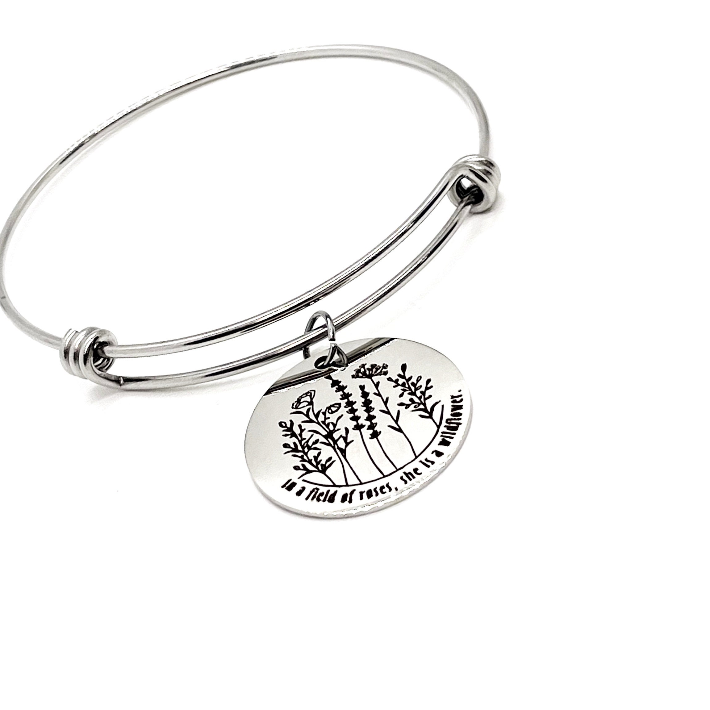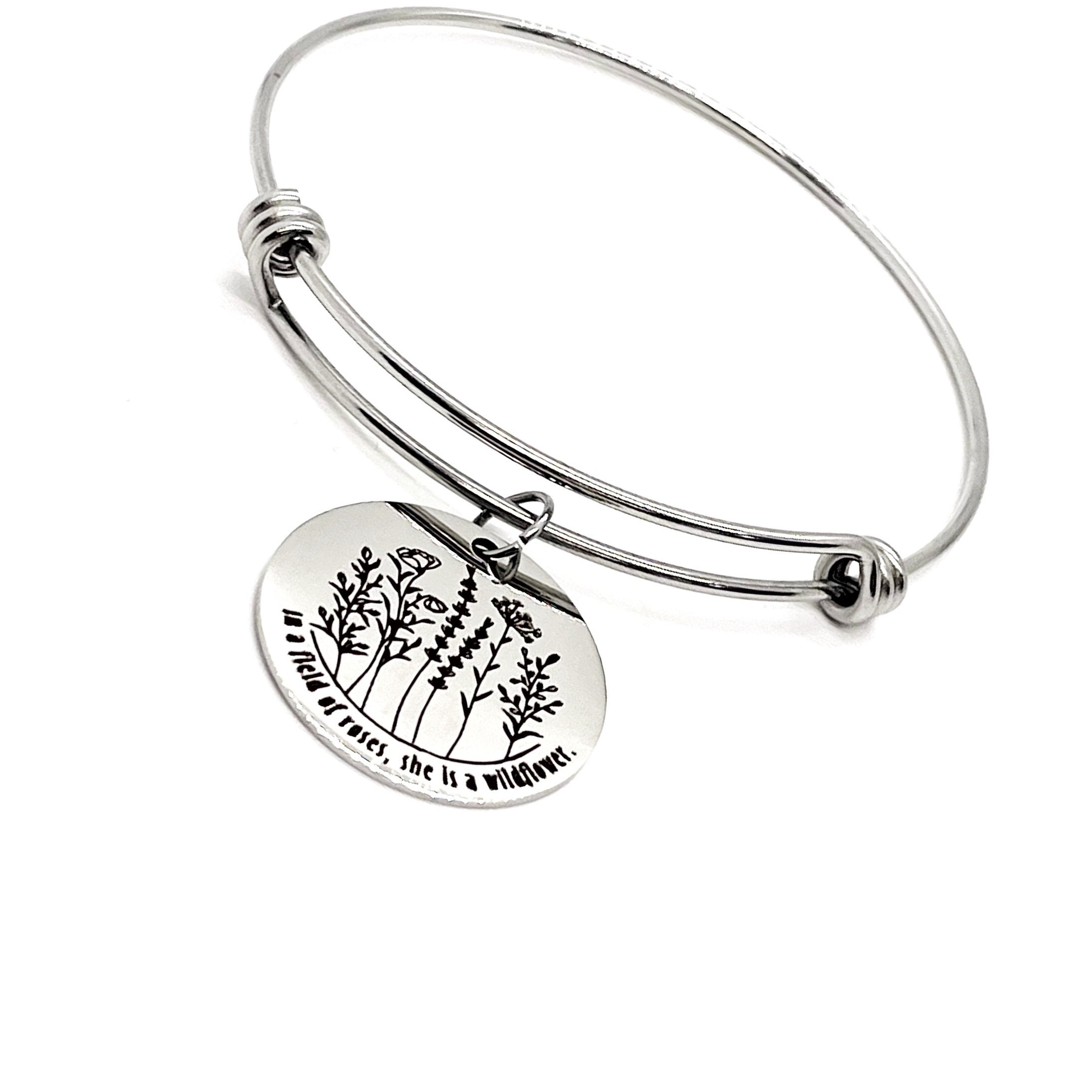 This is a beautiful bangle charm bracelet with a laser engraved stainless steel charm that has “In a field of roses, she is a wildflower” on it.