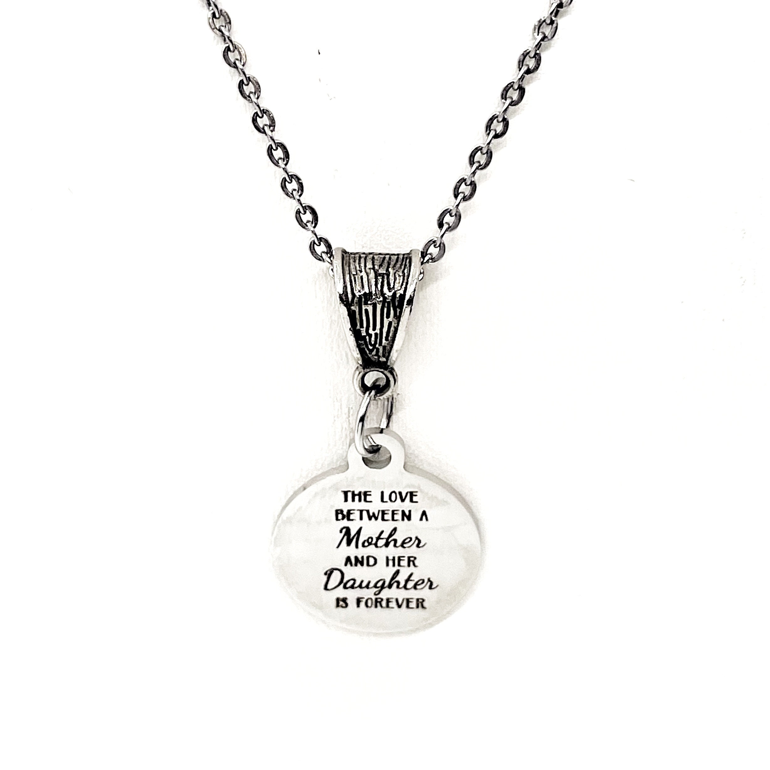 This beautiful necklace would make wonderful gift. It has a laser engraved charm with “The love between a mother and her daughter is forever” on it. The charm measures approx. 3/4 inch across.