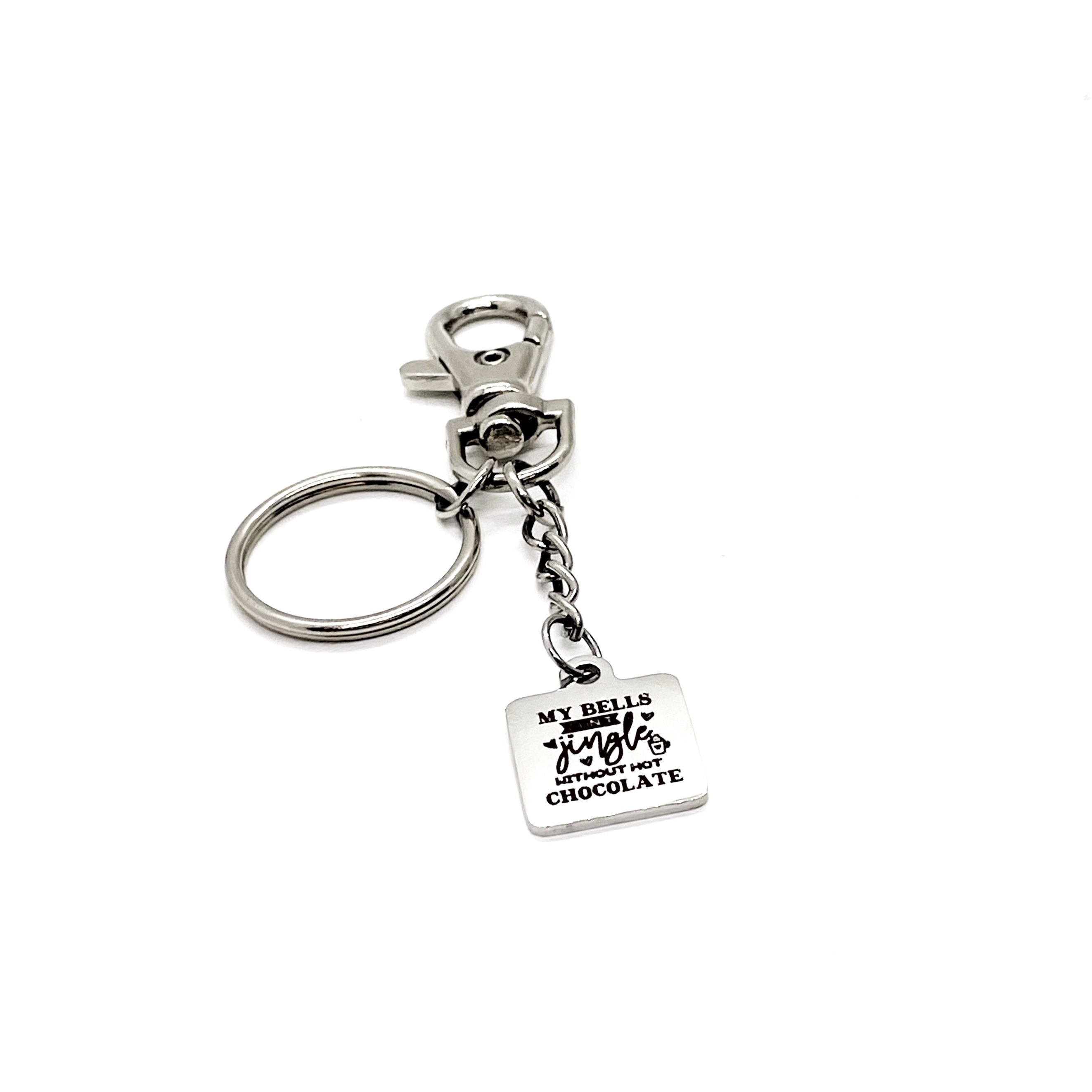This is a fun keychain gift . The keyring can be clipped onto your bag to make it easy to access without digging to the bottom of the bag. It has a stainless steel laser engraved charm with “My bells don’t jingle without hot chocolate” on it.