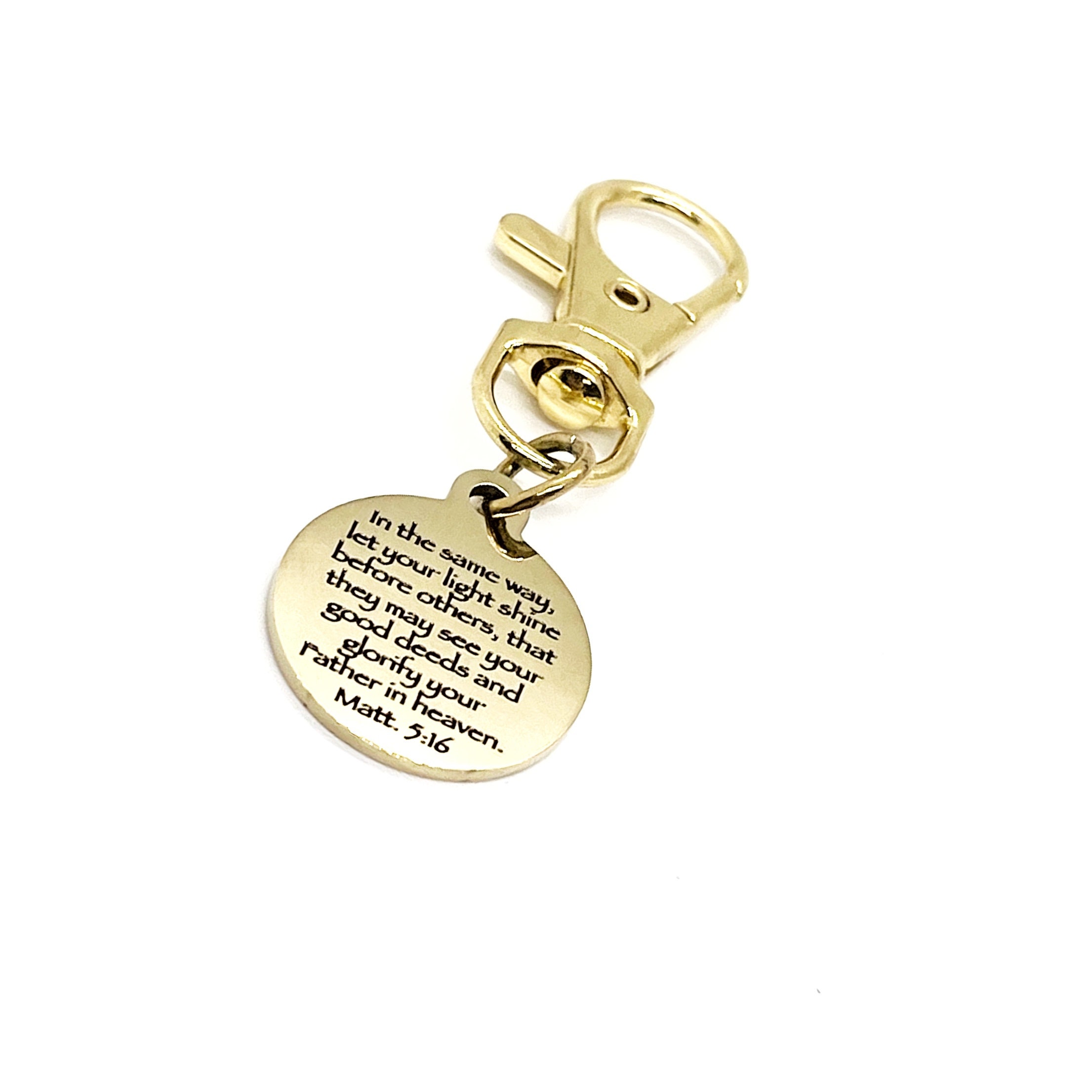This is a great zipper pull or bag charm clip gift that would be a great faith gift. It would be a great charm to clip onto a tote, purse, sports bag, book bag or keychain. It has a stainless steel engraved charm with “In the same way, let your light shine before others that they may see your good deeds and glorify your Father in heaven” from Matthew 5:16 on it.