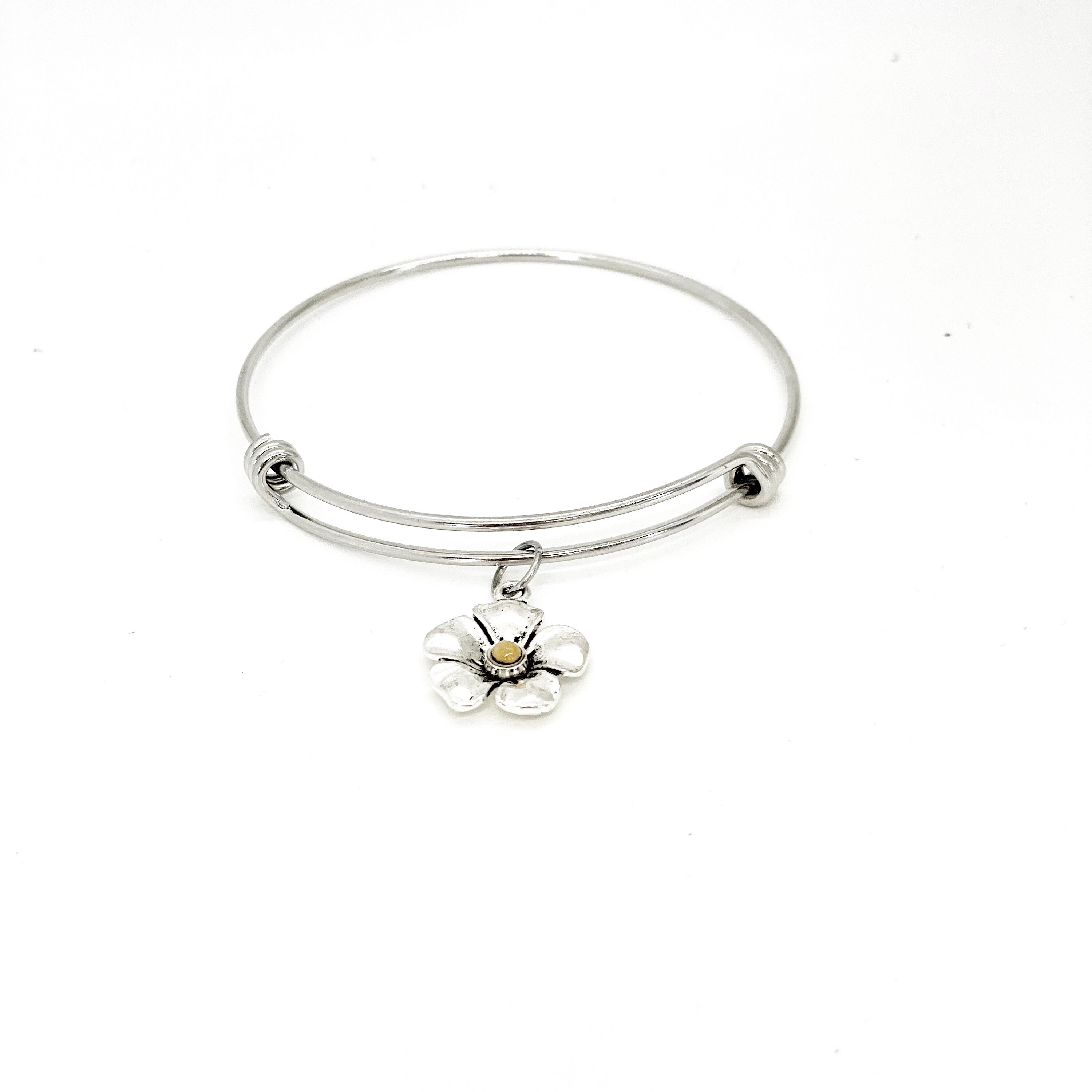 This expanding bangle charm bracelet would make a wonderful encouraging gift to remind the wearer that with faith the size of a mustard seed, we can move mountains. This is a beautiful bangle bracelet with a flower charm with a single mustard seed at the center.