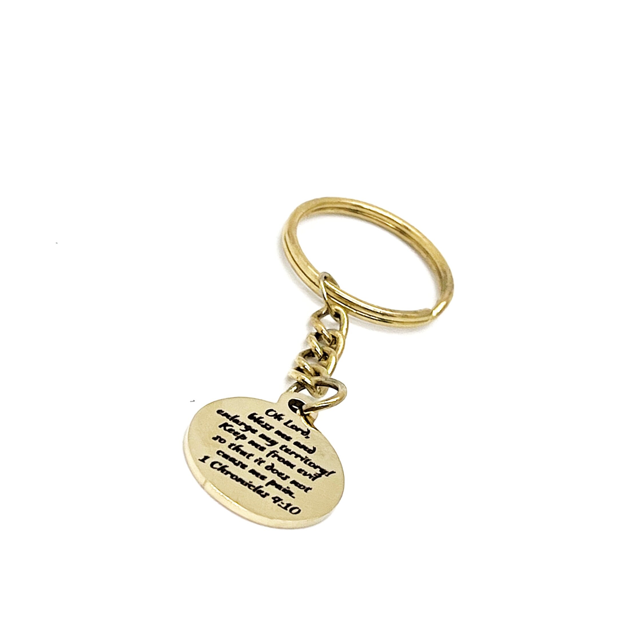 This is a great keychain gift. It has a stainless steel laser engraved charm with “Oh Lord, expand my territory! Keep me from evil that it does not cause me pain” from 1 Chronicles 4:10 on it. The charm measures approx. 3/4 inch across.