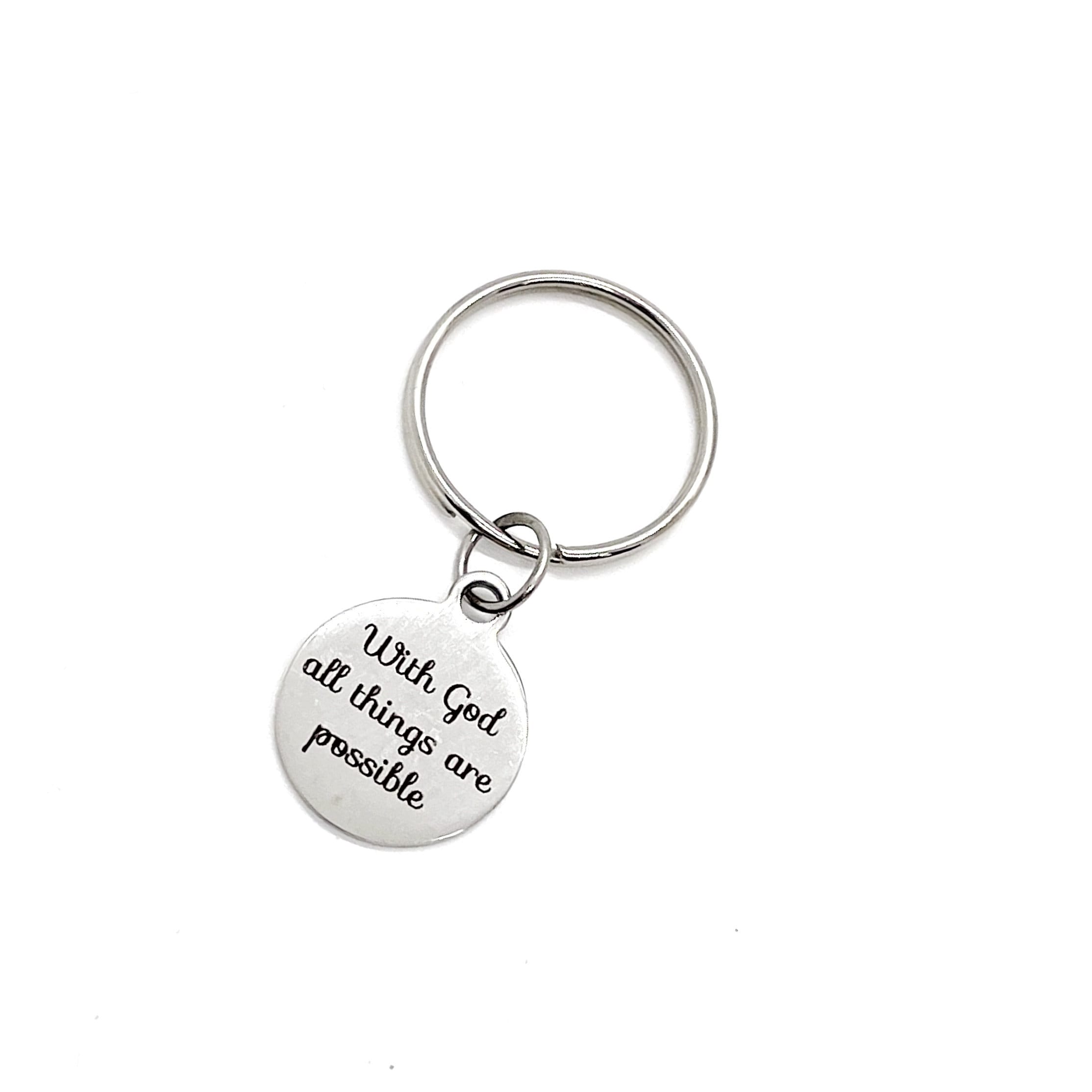 This is a wonderful keychain gift! It has stainless steel engraved charm with “With God all things are possible” from Mathew 19:26 on it. The charm measures approx. 3/4 inch cross.