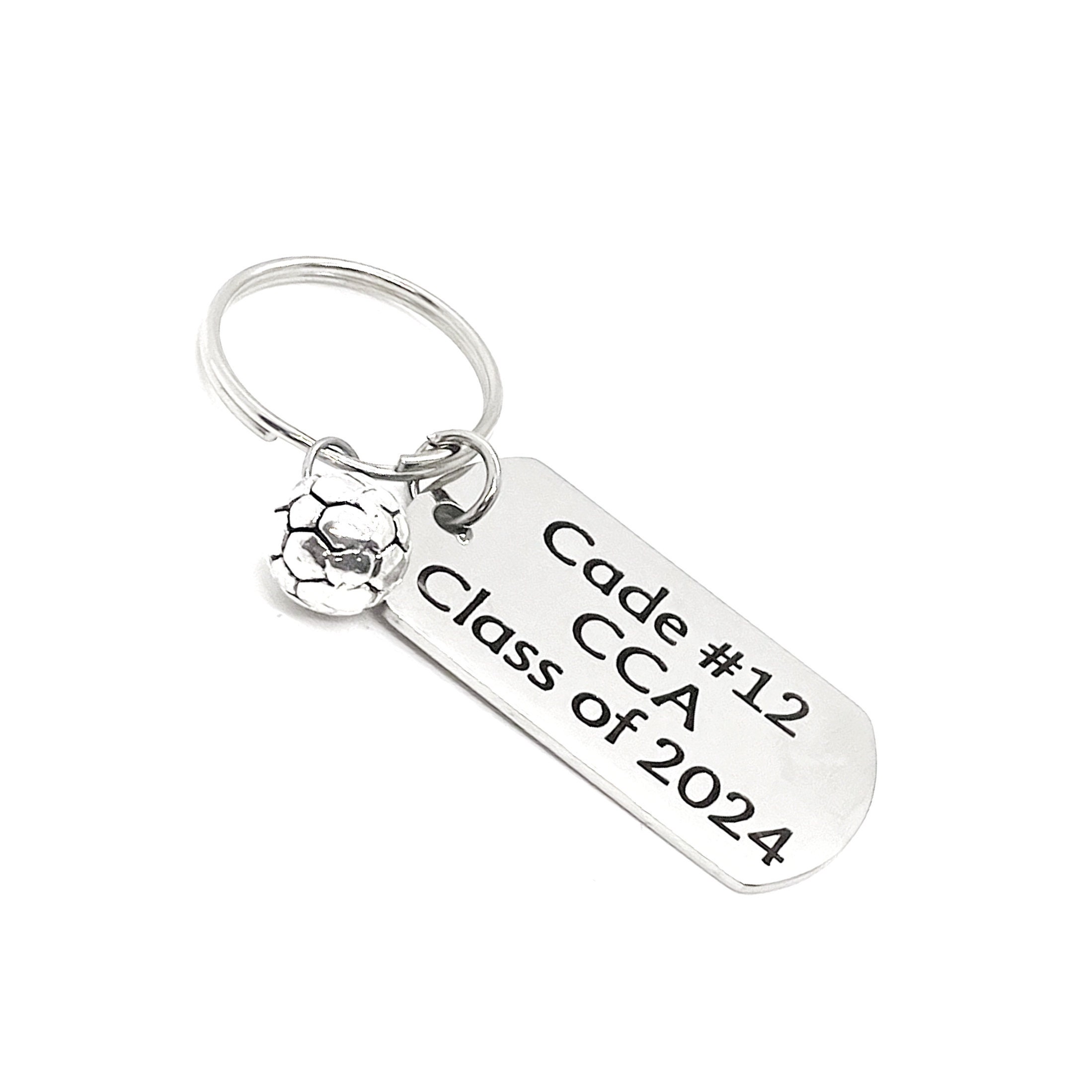 This is a great keychain gift for your favorite soccer players on your school team! It has a stainless steel laser engraved charm with first name jersey number, school and graduation year.