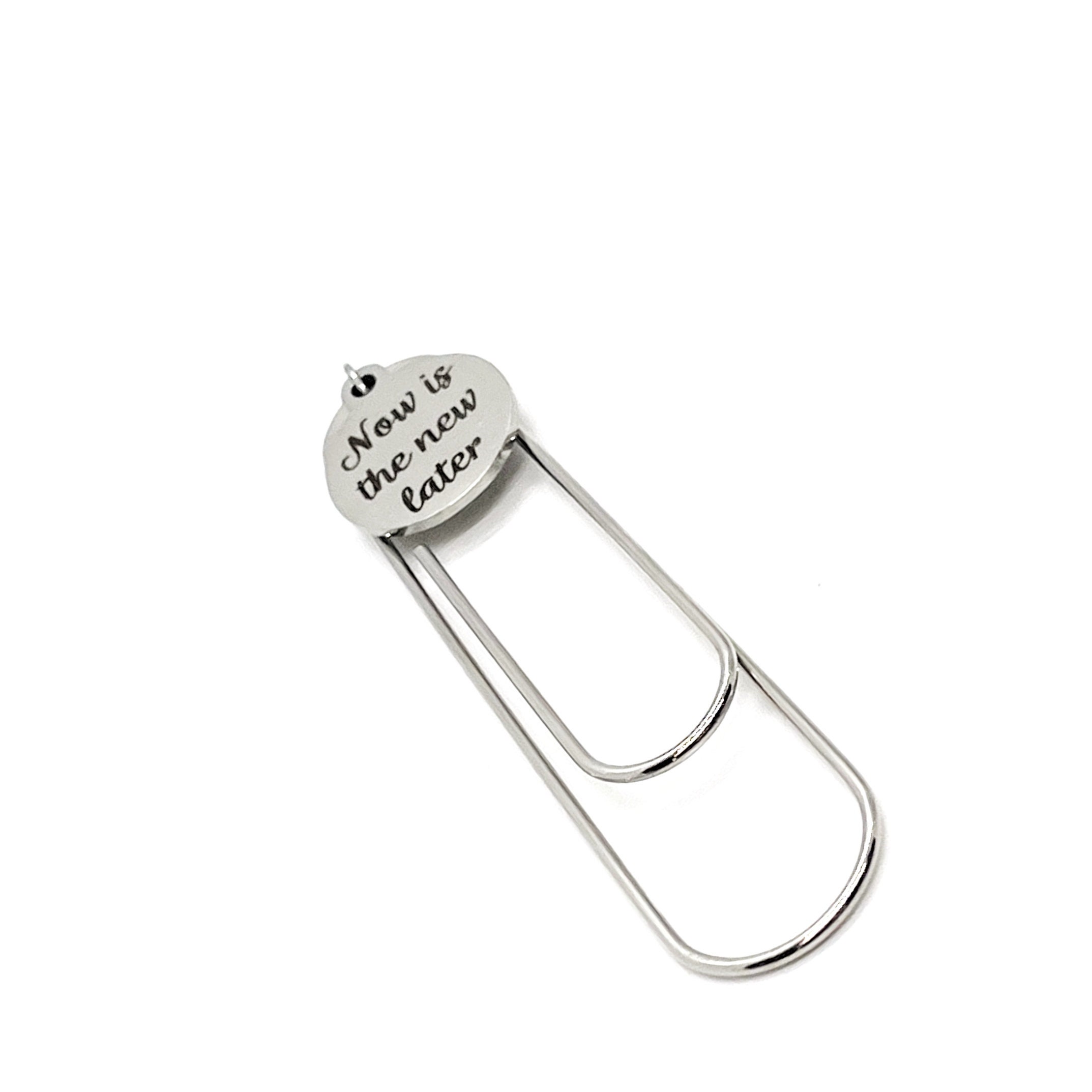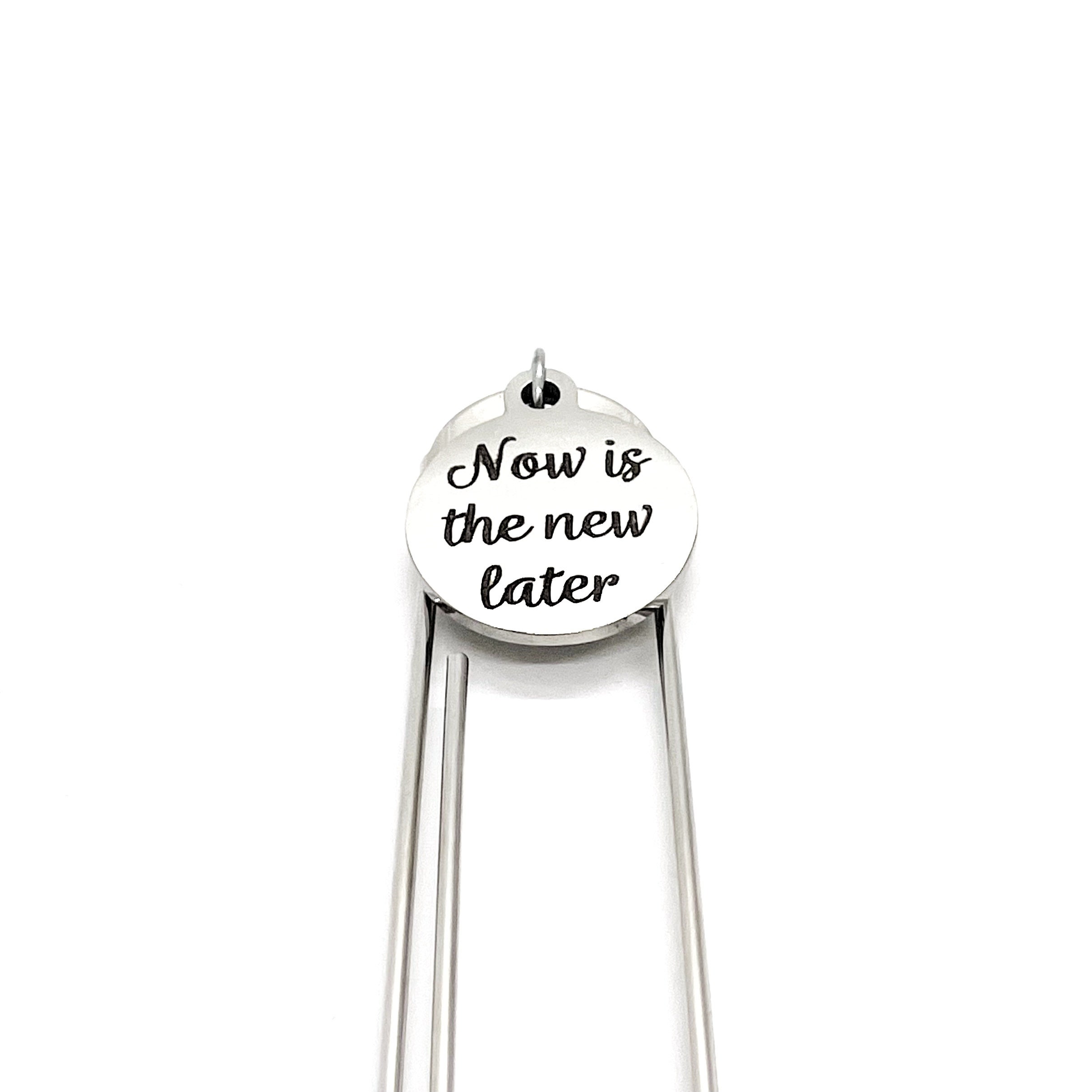 This bookmark has a stainless steel laser engraved charm with “Now is the new later” on it.