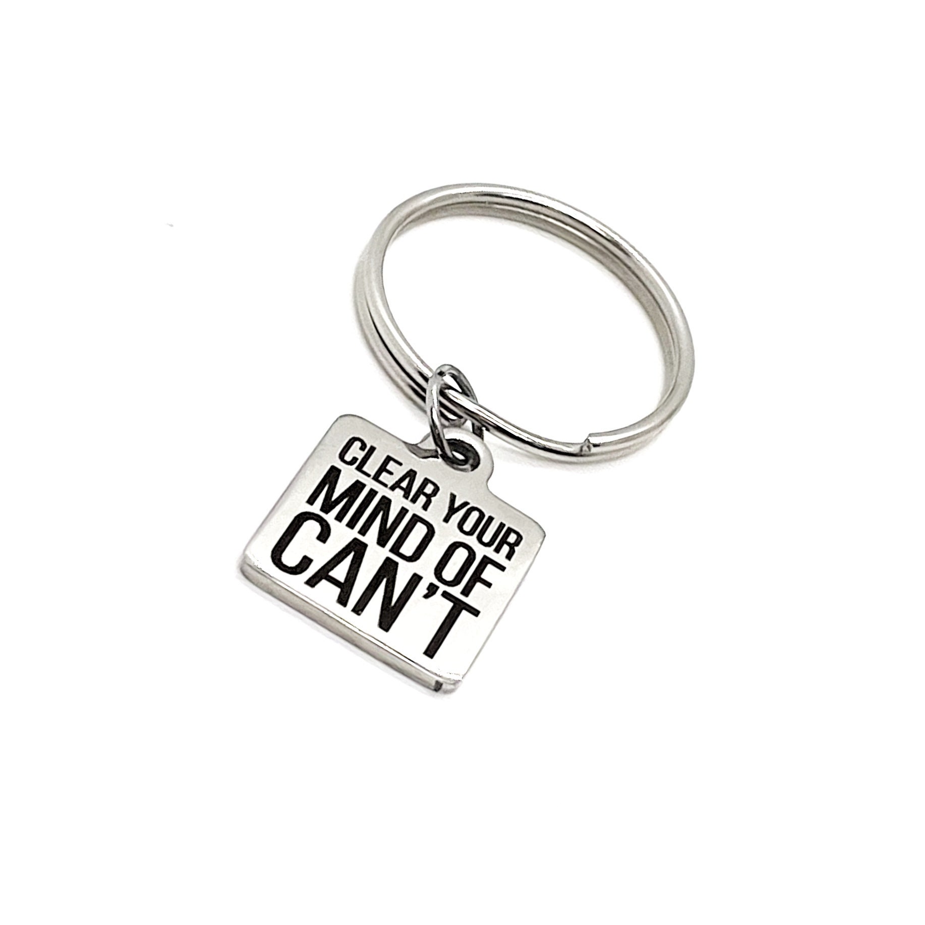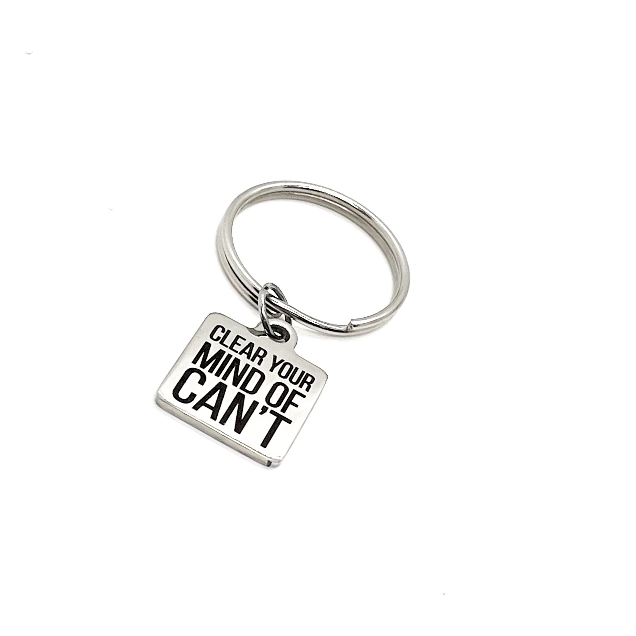 This is a wonderful keychain gift! It has stainless steel engraved charm with “Clear your mind of can’t” on it. The charm measures approx. 3/4 inch cross.