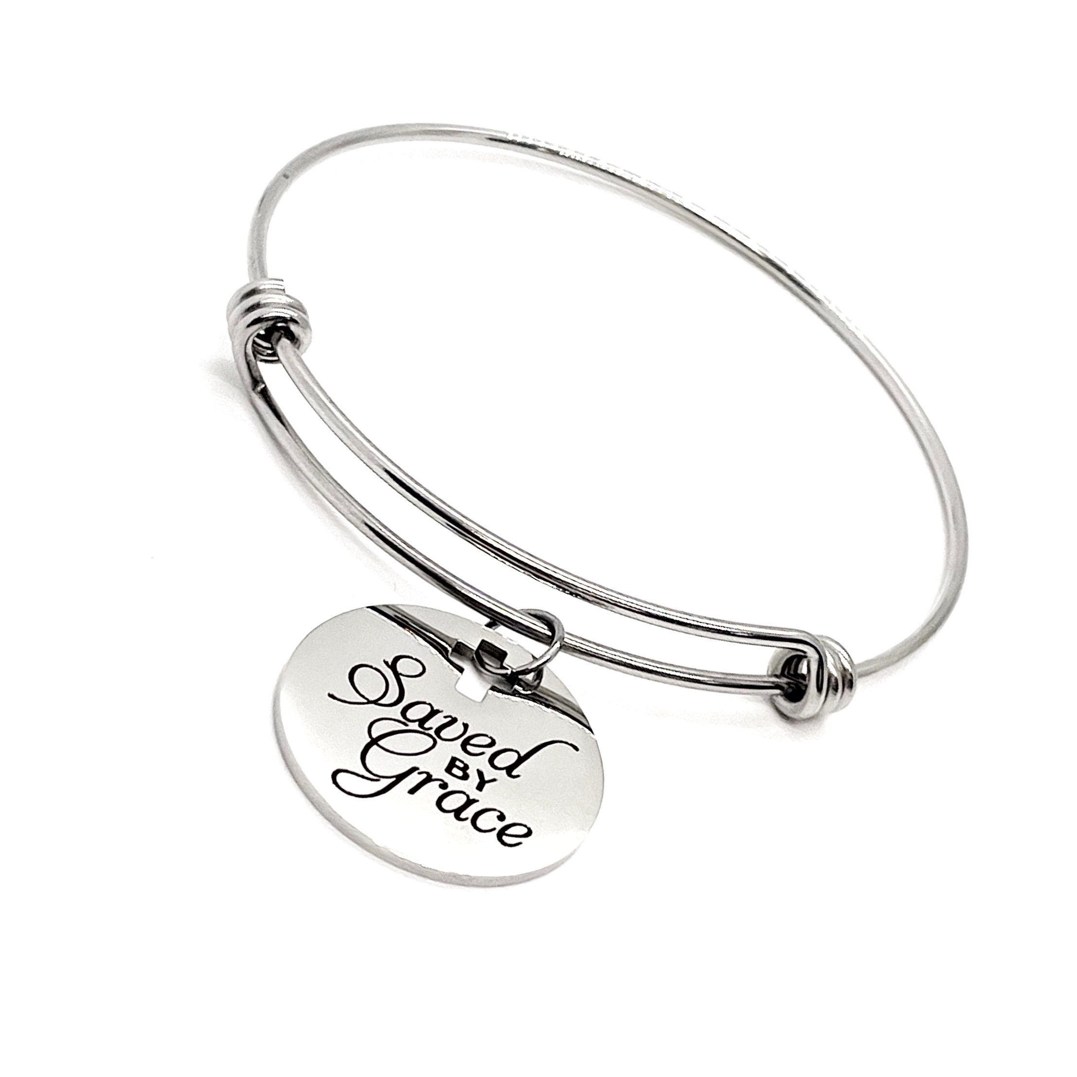 This is a beautiful bangle charm bracelet with a laser engraved stainless steel charm that has “Saved by Grace” from Ephesians 2:8 on it.