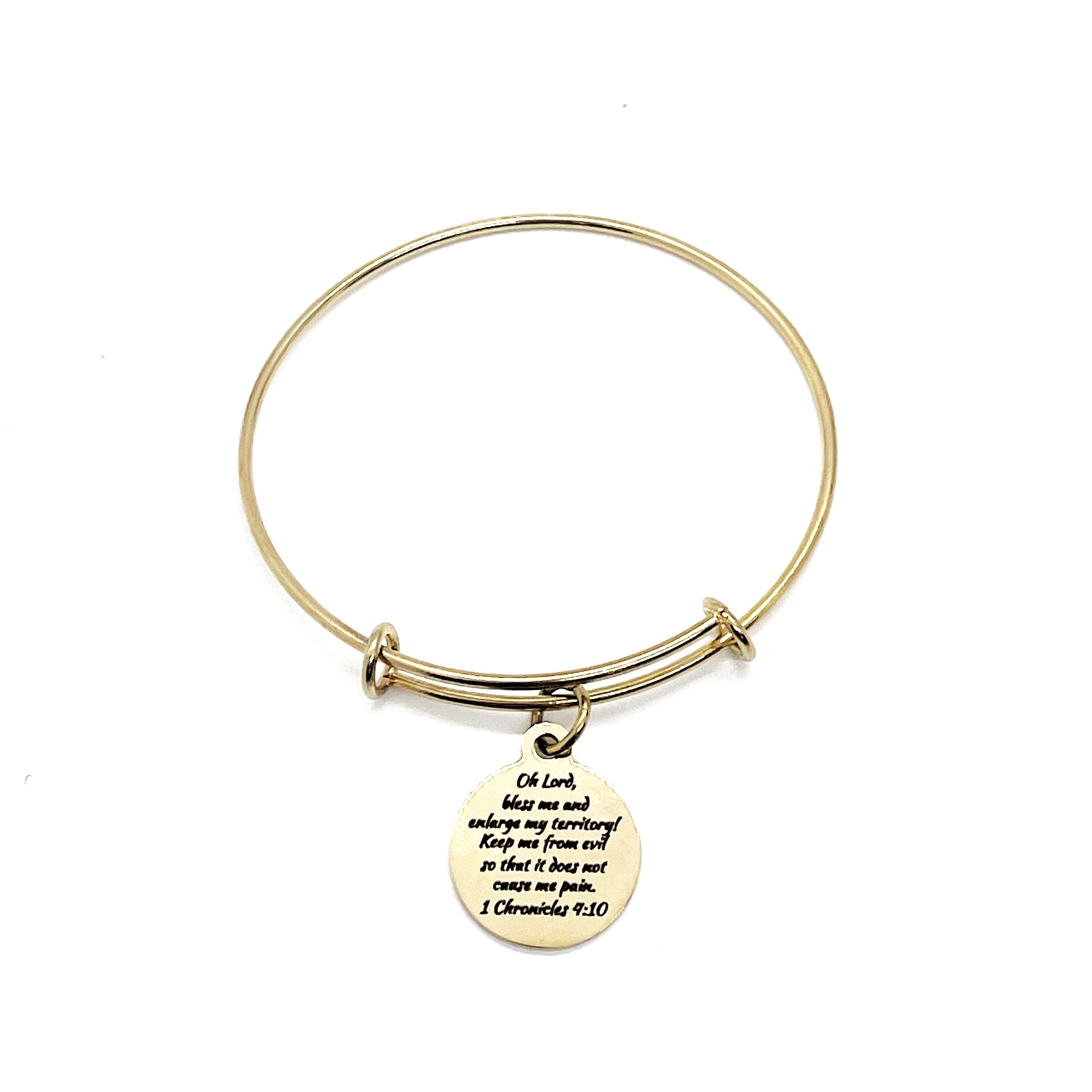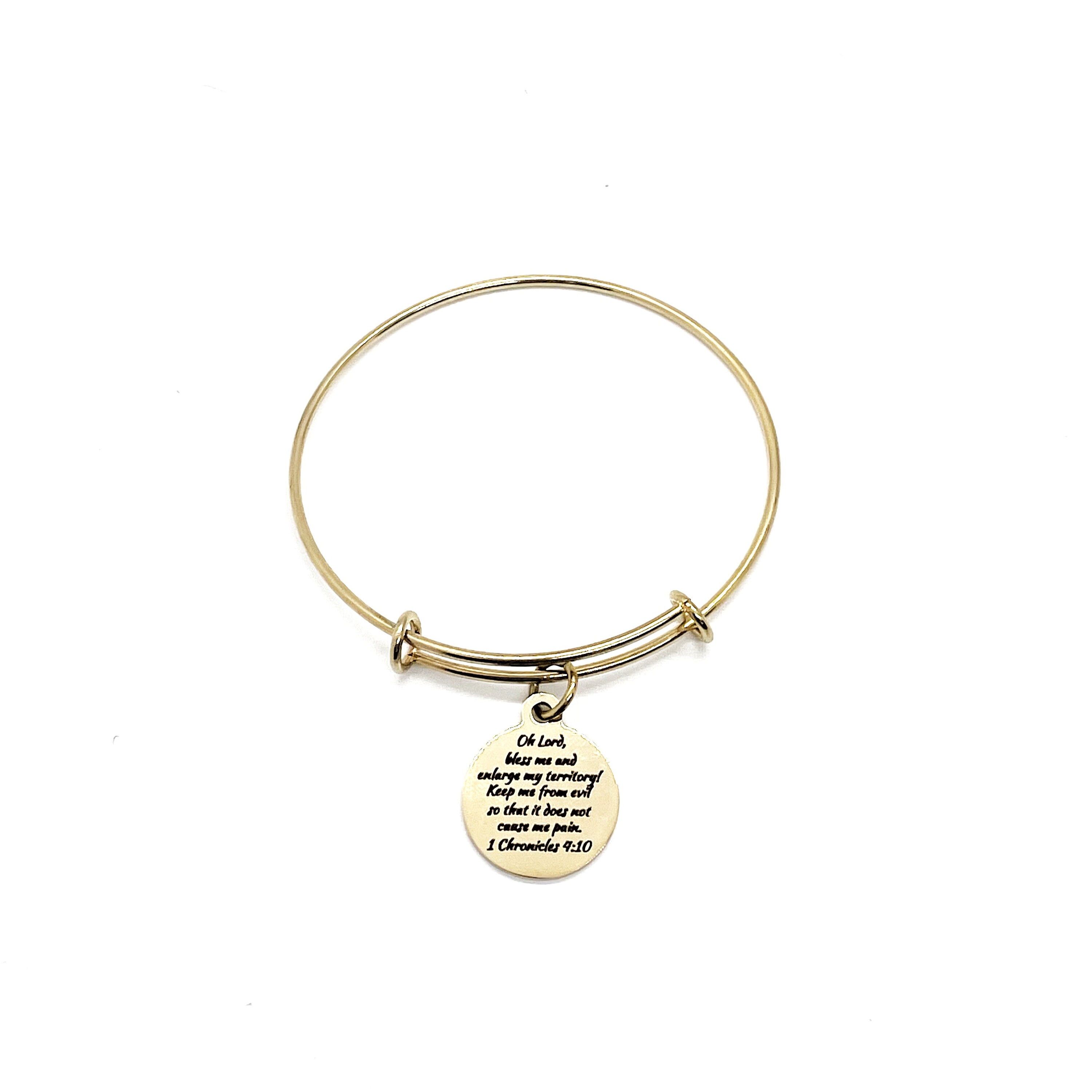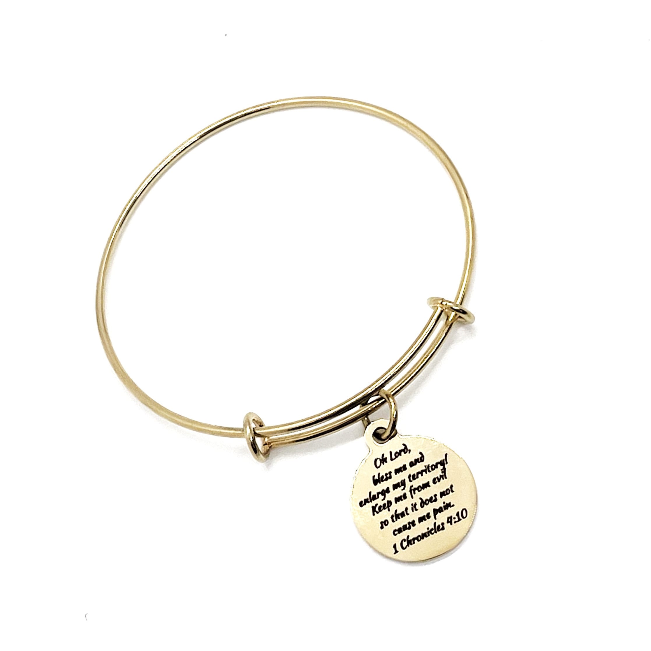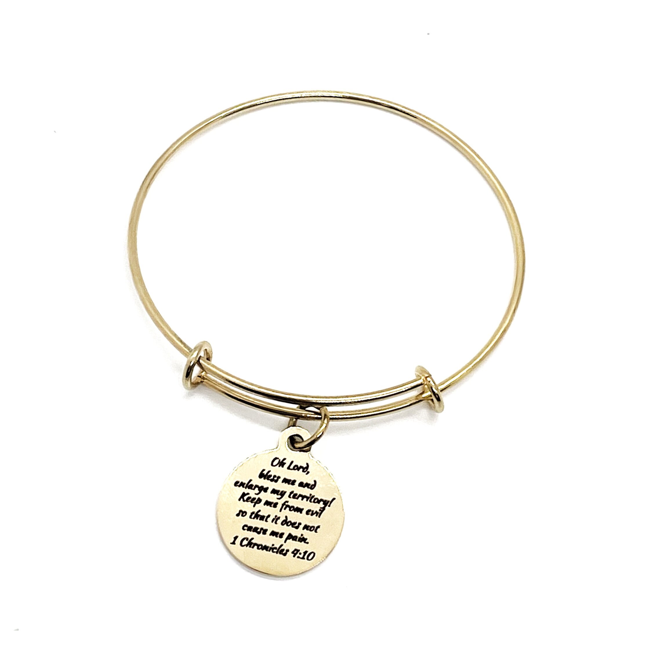 This is a beautiful bangle bracelet with a laser engraved stainless steel charm that has "Oh Lord bless me indeed and expand my territory. Keep me from evil so it does not cause me pain." 1 Chronicles 4:10 on it.