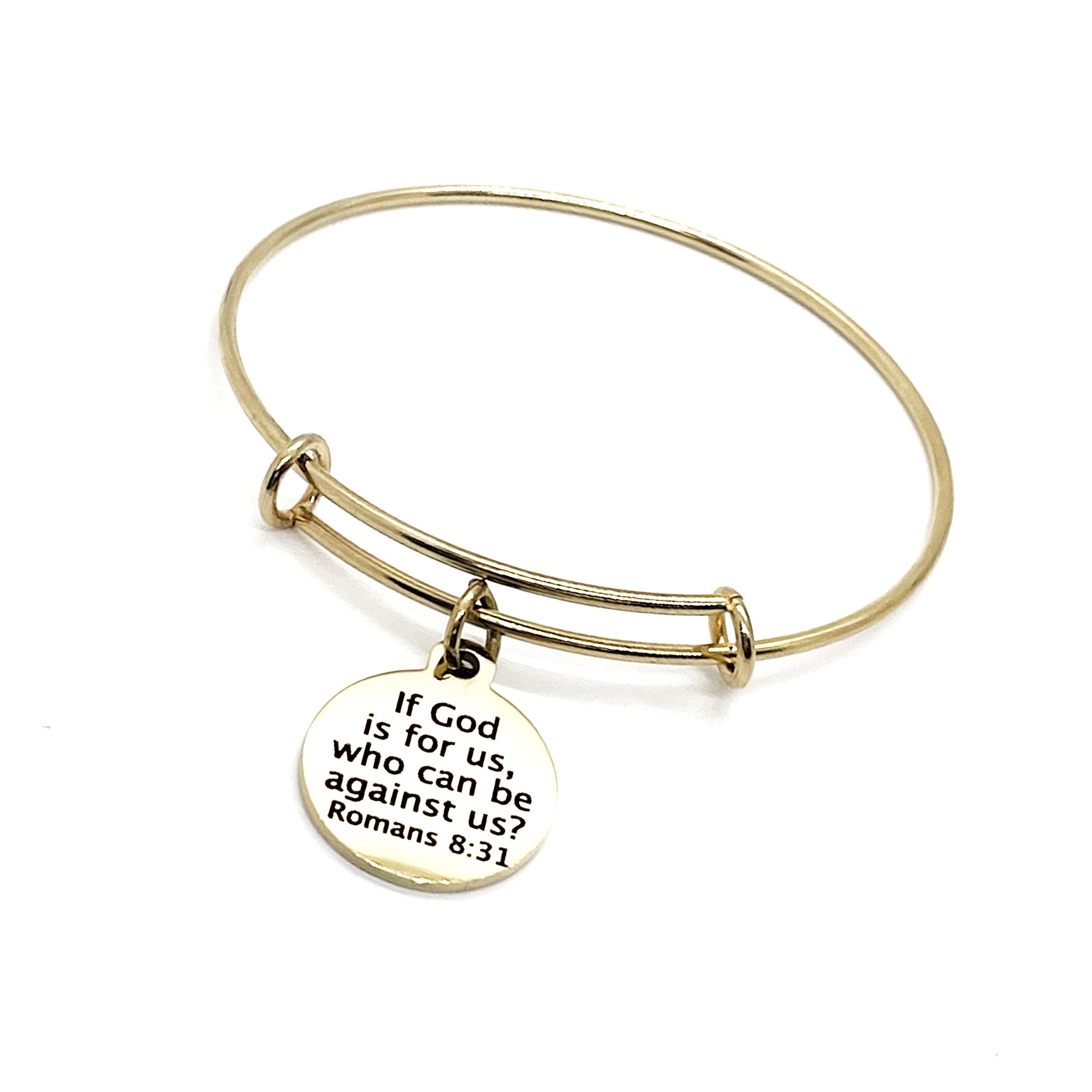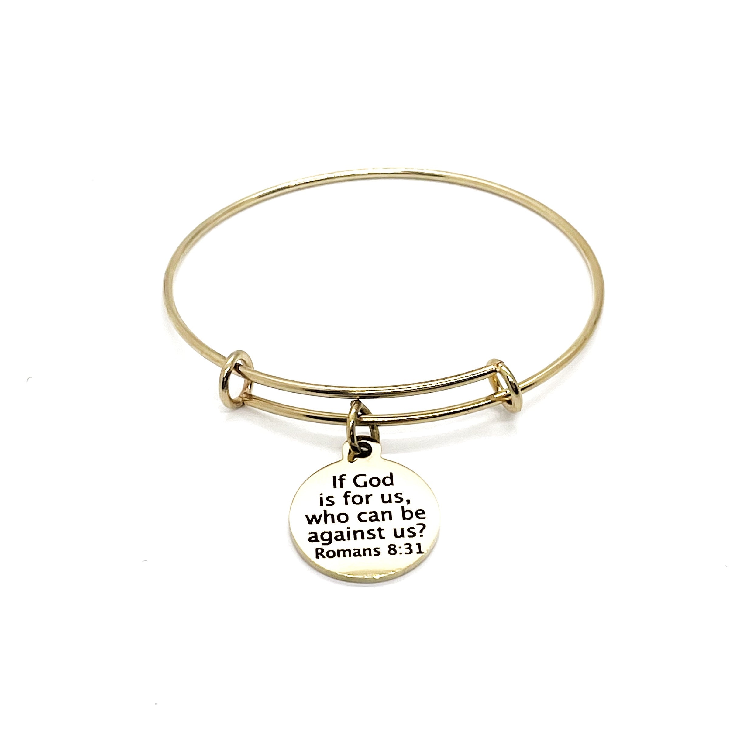 This is a beautiful bangle bracelet with a laser engraved stainless steel charm that has "If God is for us, who can be against us?" Romans 8 31 on it.