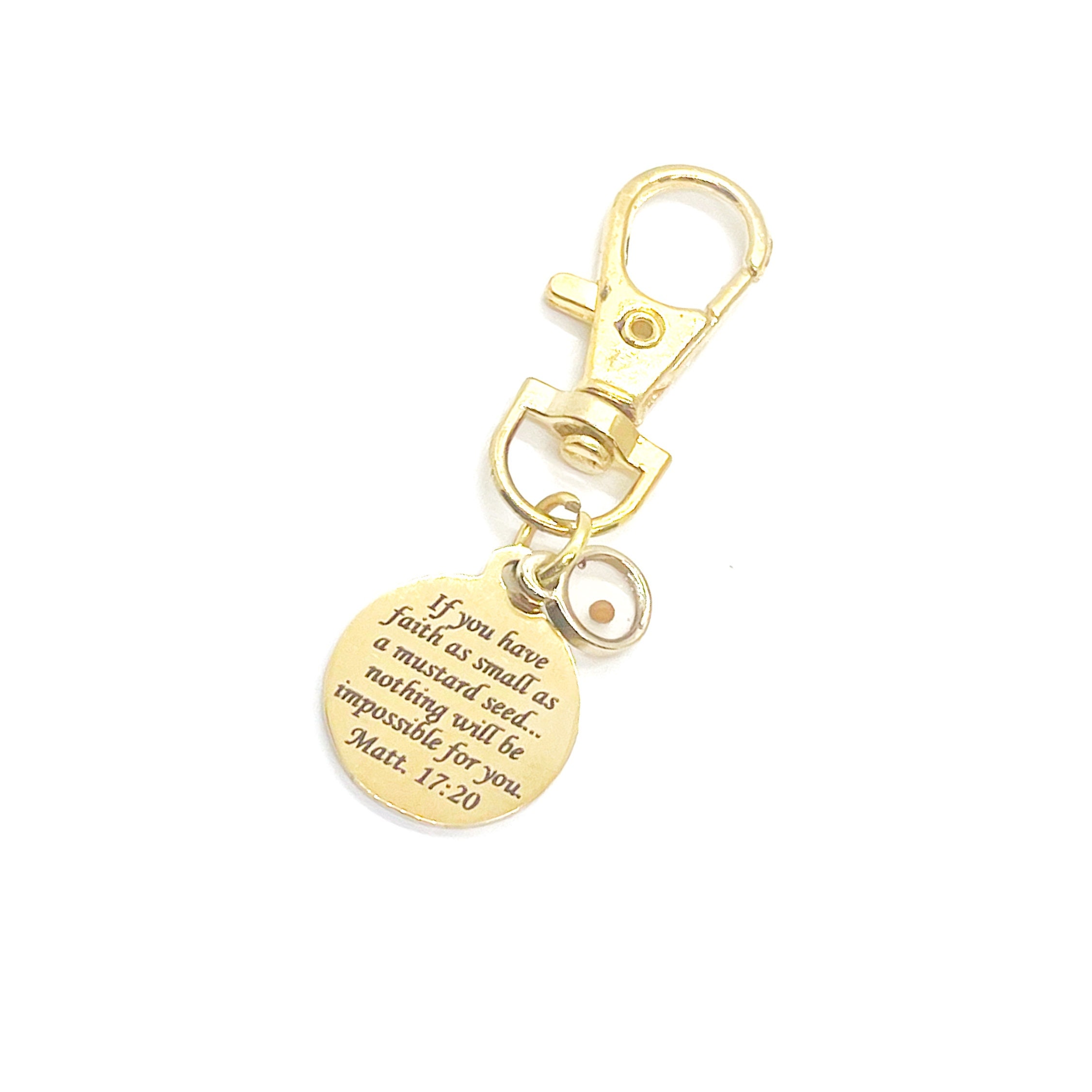 This is a great zipper pull or bag charm clip gift that would be a great faith gift. It would be a great charm to clip onto a tote, purse, sports bag, book bag or keychain. It has a stainless steel engraved charm with “If you have faith as small as a mustard seed… nothing will be impossible for you” from Matthew 17:20 on it. The charm measures approx. 3/4 inch. Each charm comes with a card with the scripture verse of Matthew 17:20.