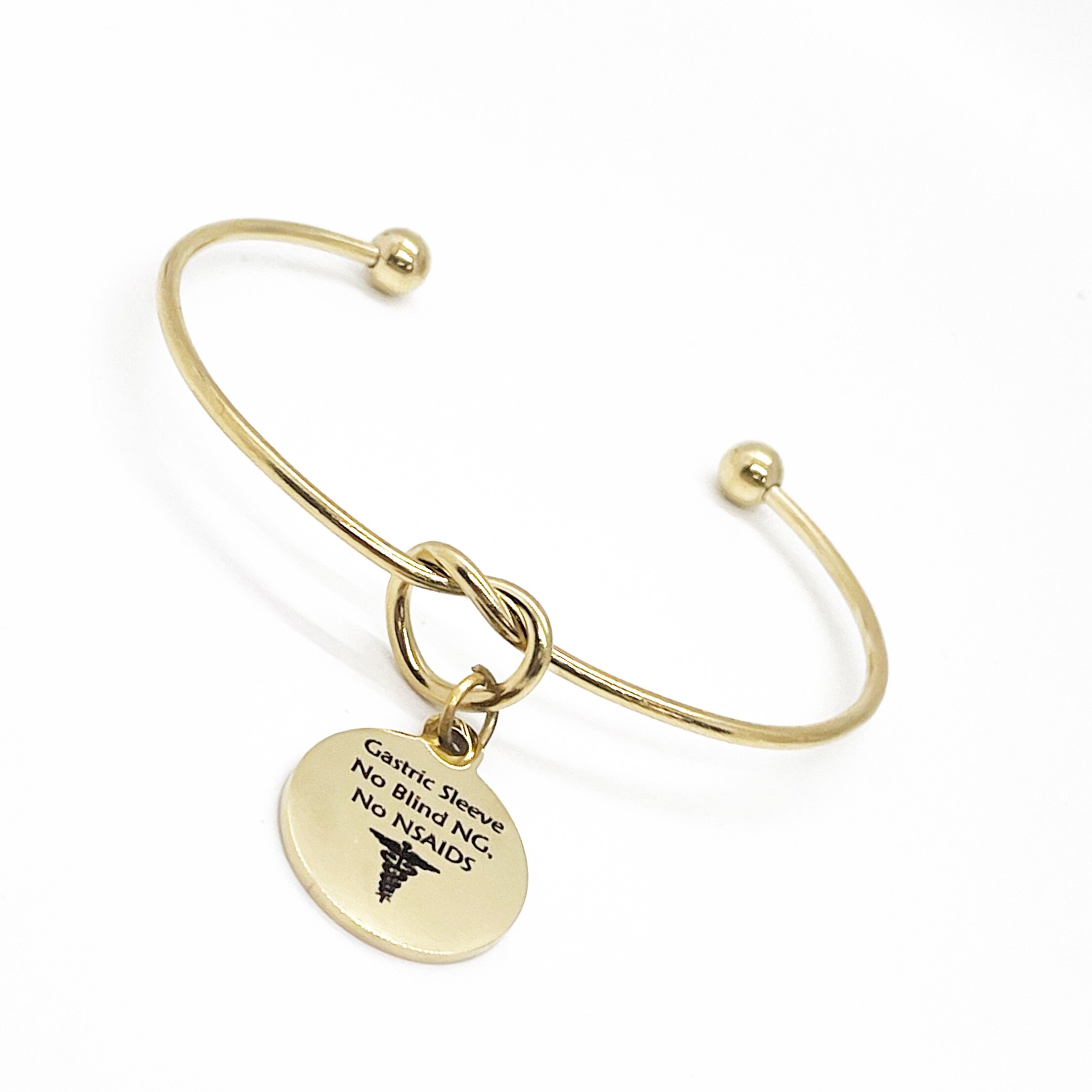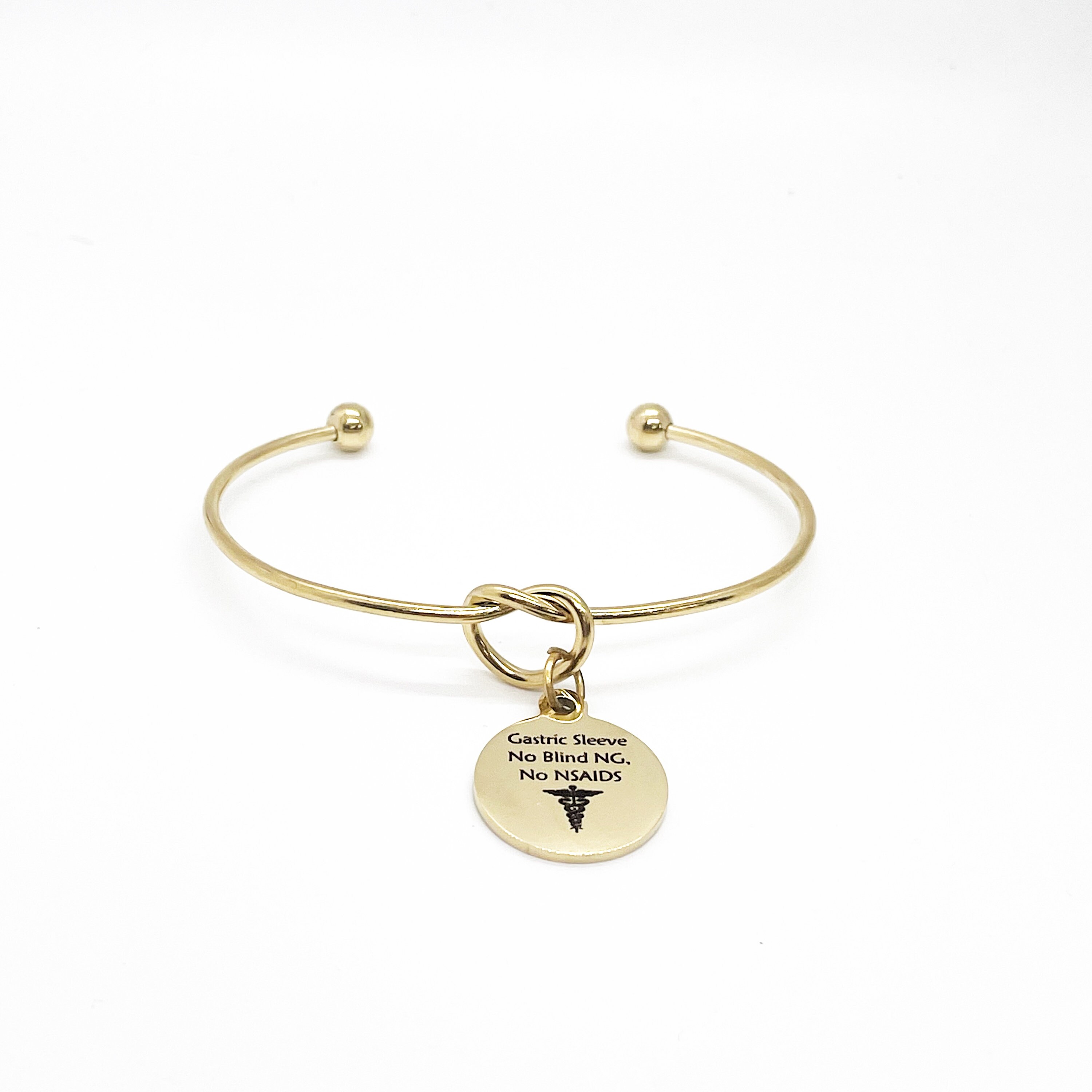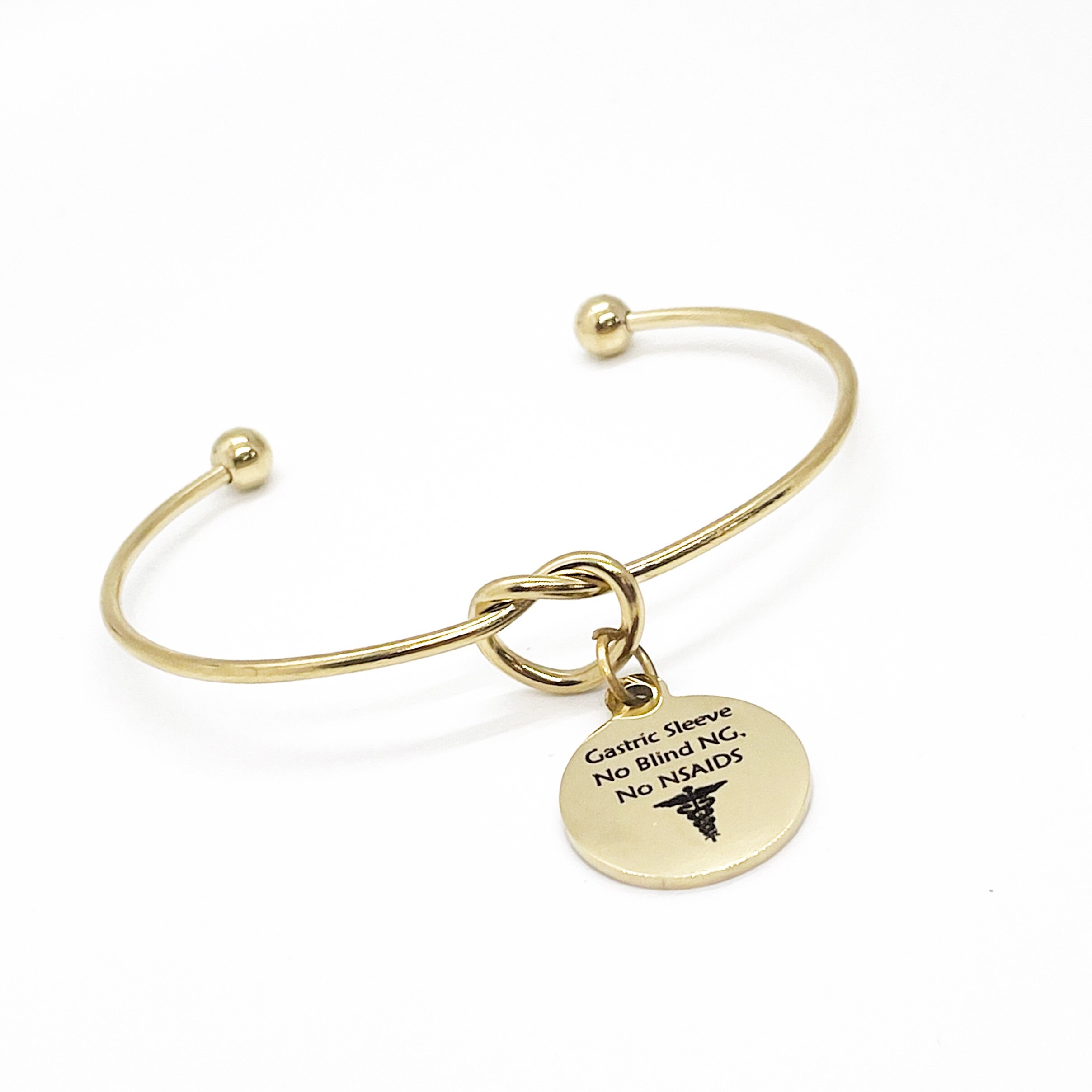 This is a beautiful knotted gold-plated cuff bracelet with an engraved charm with “Gastric Sleeve, No Blind NG, No NSAIDS” on it