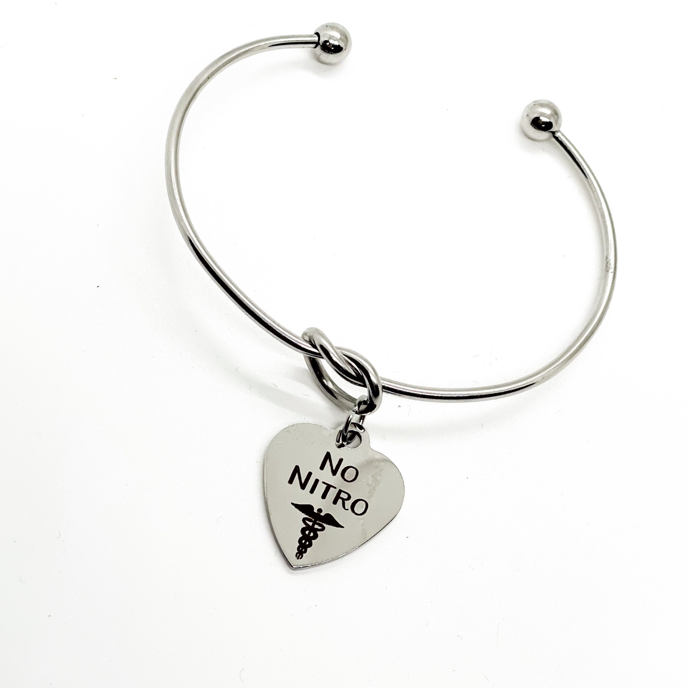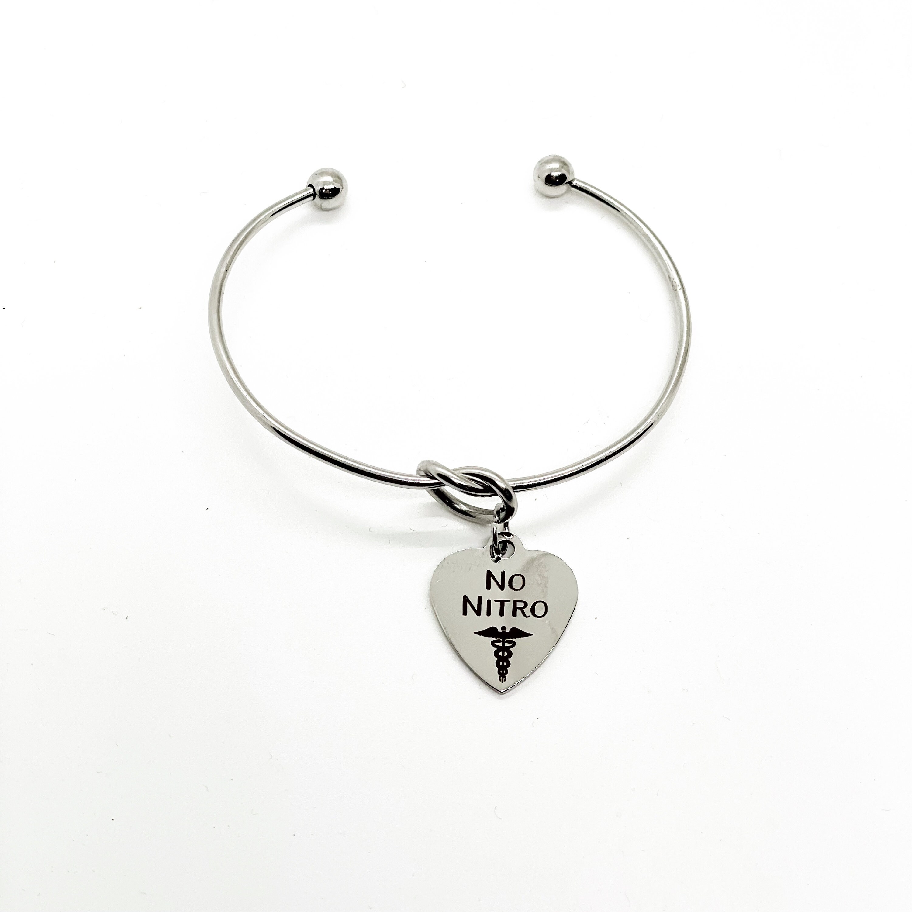 This is a beautiful knotted stainless steel cuff bracelet with an engraved charm with “No Nitro” on it.