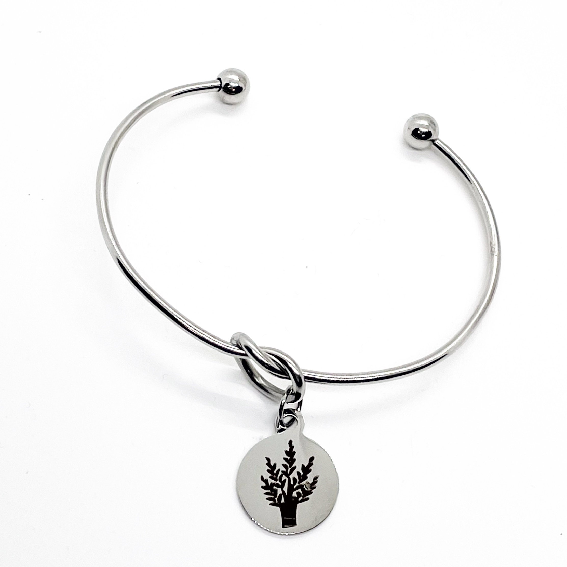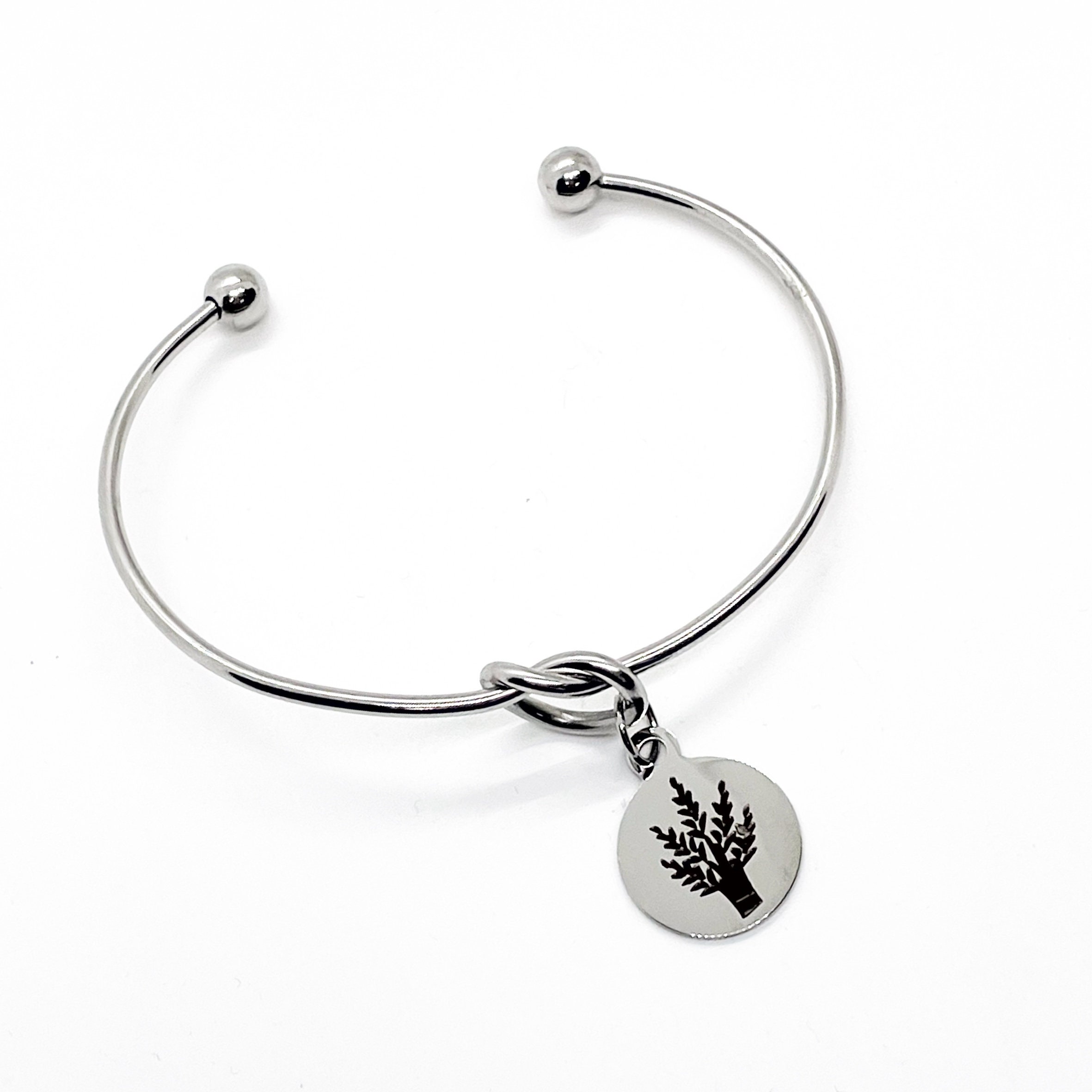 This is a beautiful knotted stainless steel cuff bracelet with an engraved charm with a image of wheat, which is a symbol of prosperity and blessing, on it.