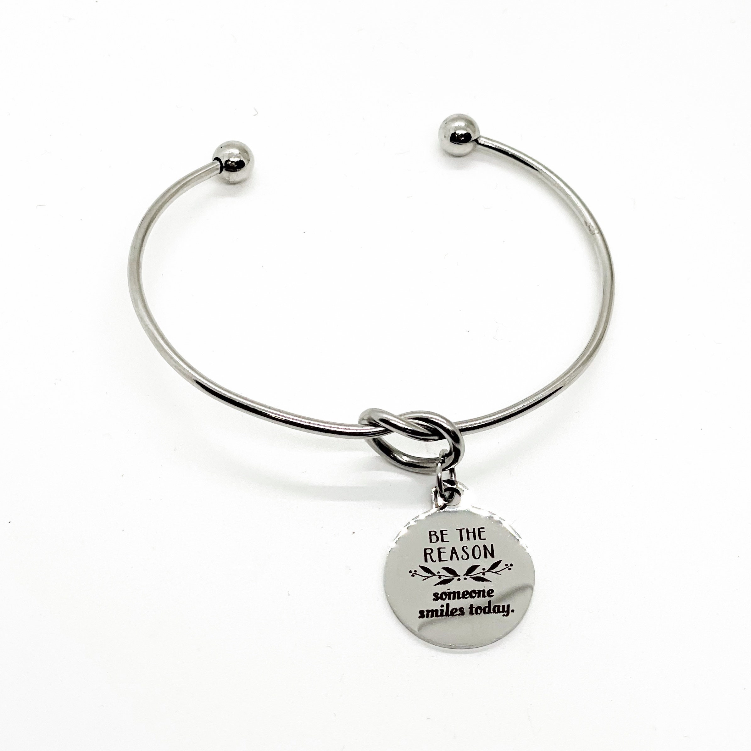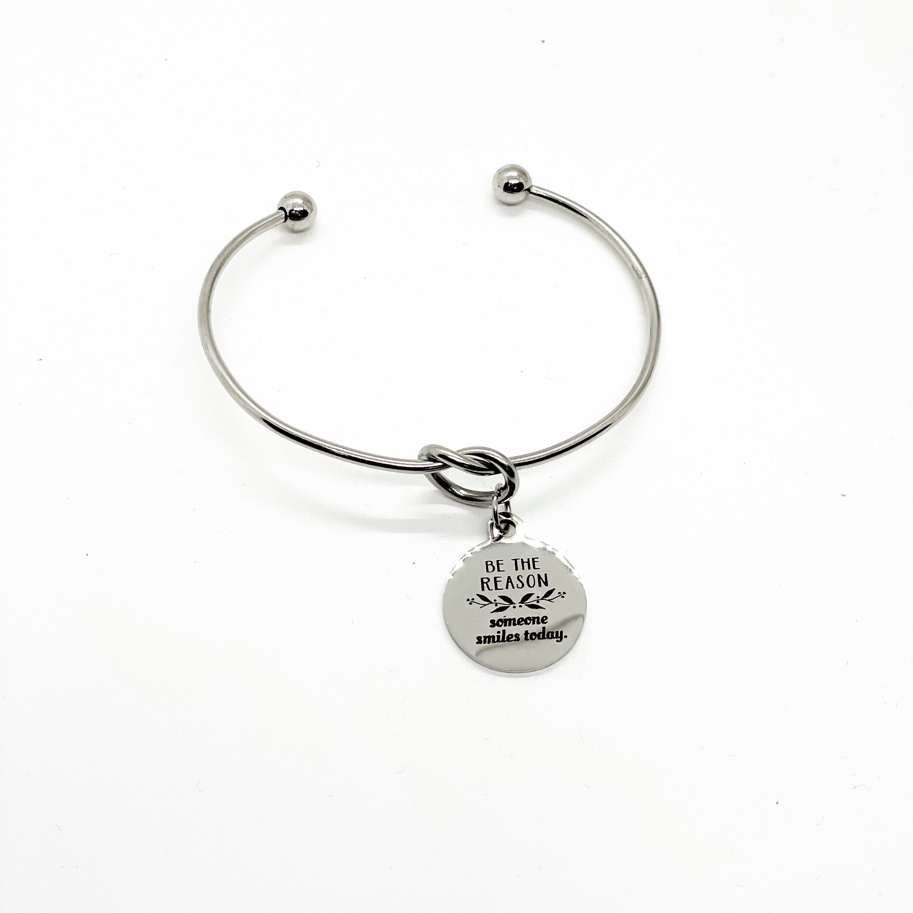 This is a beautiful knotted stainless steel cuff bracelet with an engraved charm with “Be the reason someone smiles today” on it.