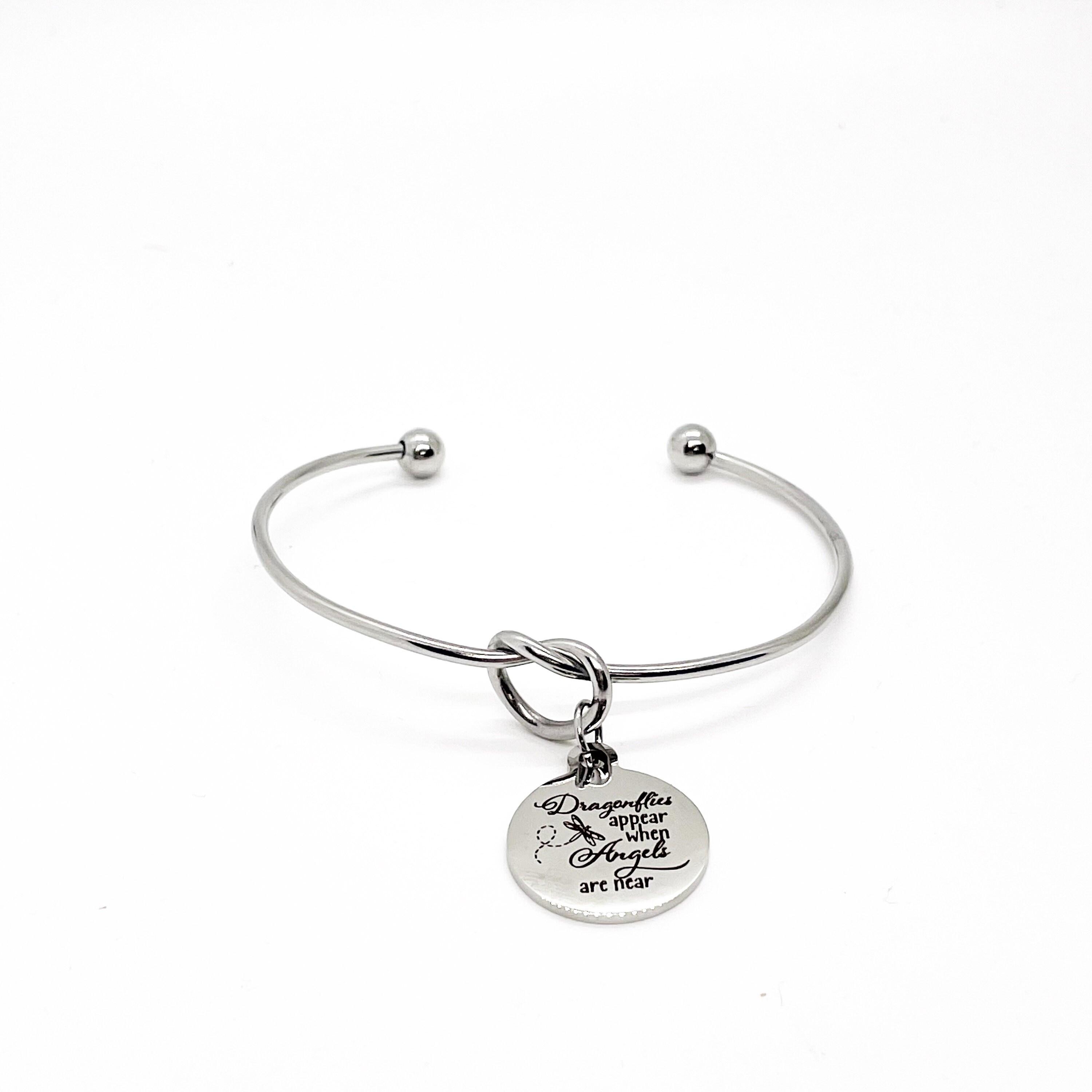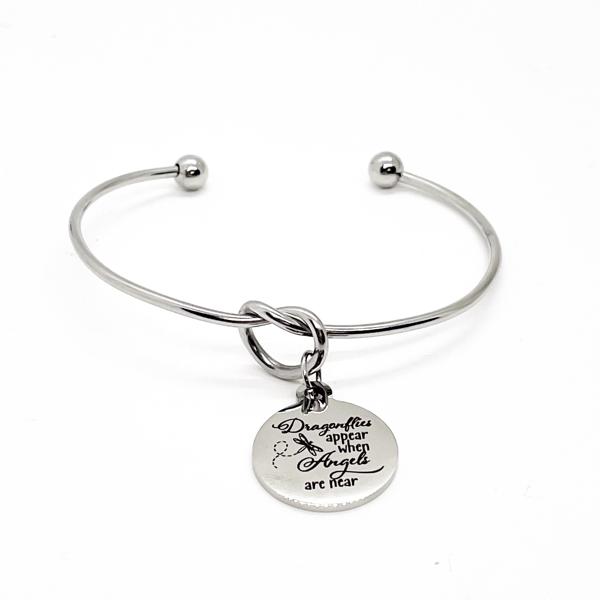 This is a beautiful knotted stainless steel cuff bracelet with an engraved charm with “Dragonflies appear when angels are near” on it.