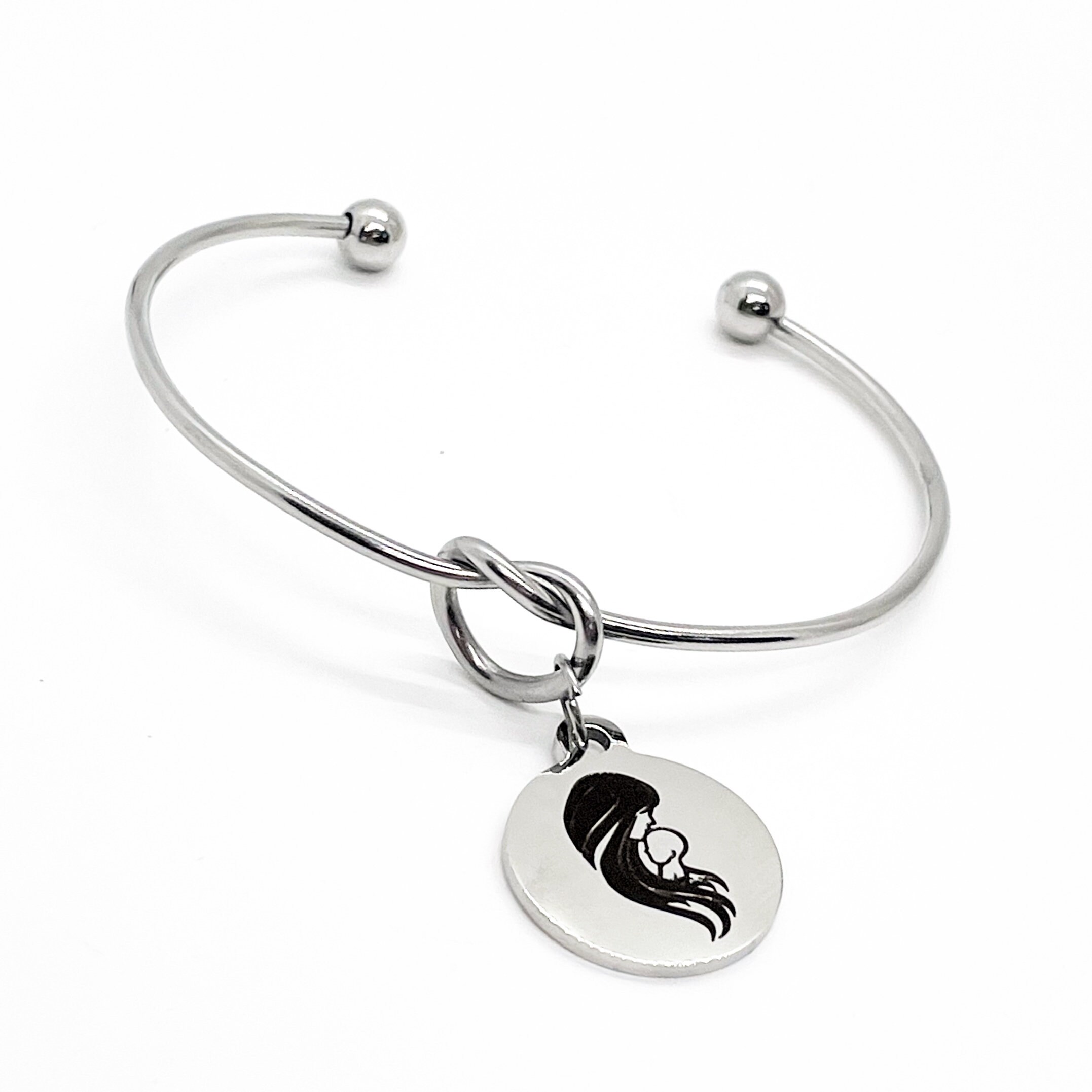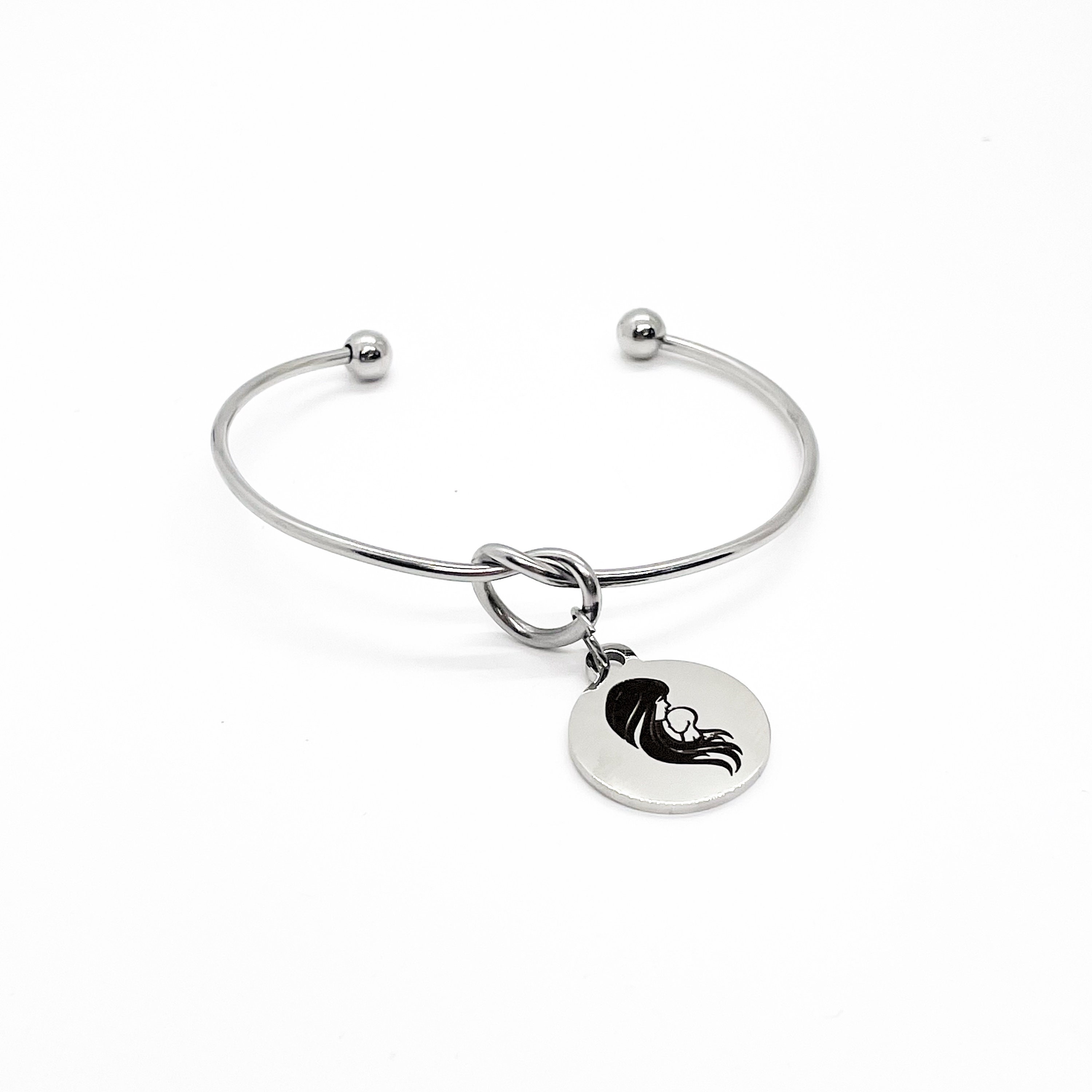 This is a beautiful knotted stainless steel cuff bracelet with an engraved charm with a mom and baby image on it.
